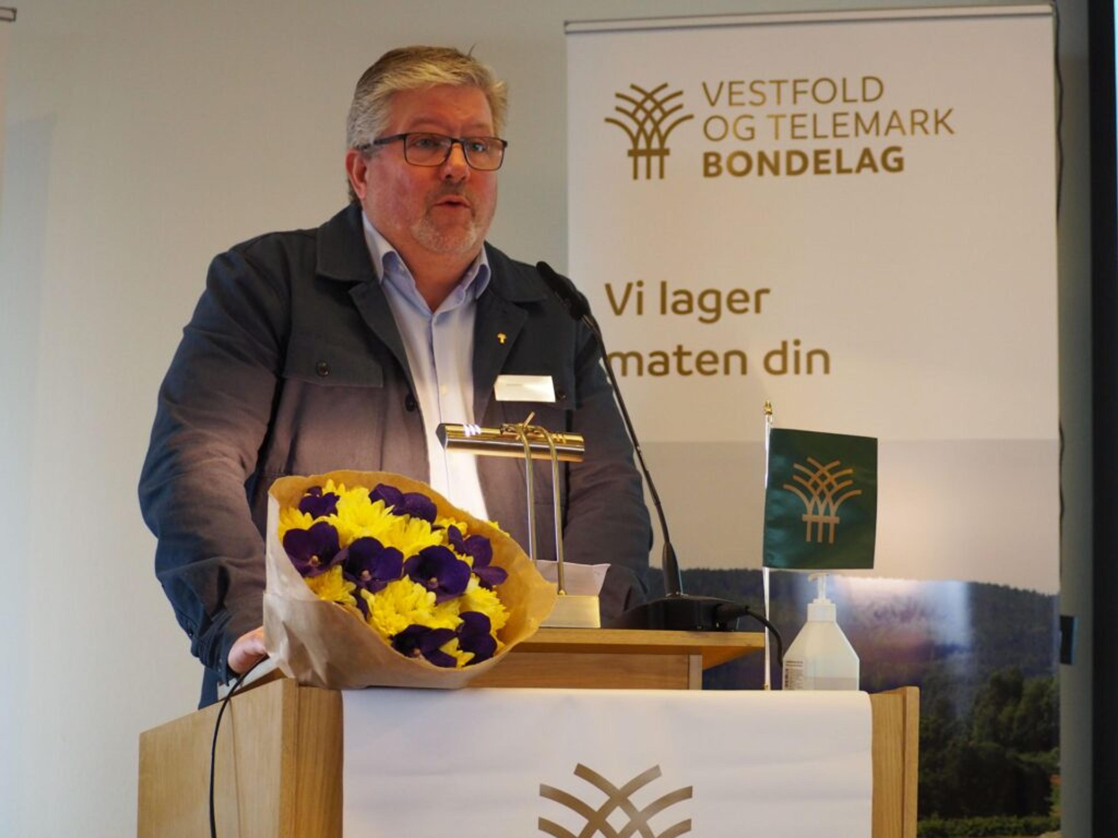 LEDER I VESTFOLD OG TELEMAR BONDELAG: Aslak Snarteland holder leders tale under årsmøtet. Foto: Pressemelding.