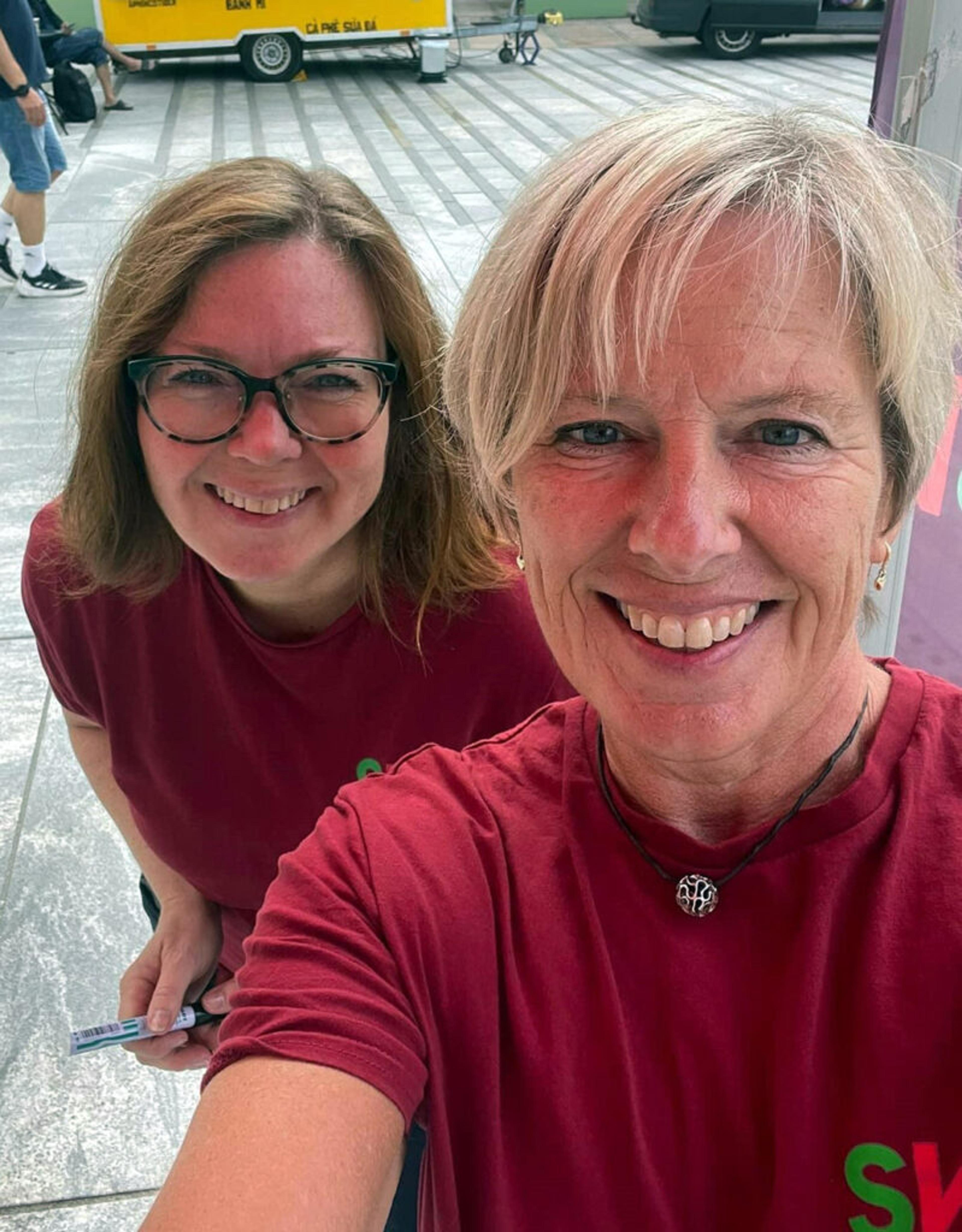 LESERINNLEGG: Bildet viser Lisa Winther, 1. kandidat Vestfold SV som står fremst, og leserinnlegg-forfatter Linn Schistad, 3. kandidat for Tønsberg SV, bakerst. Foto: Privat.