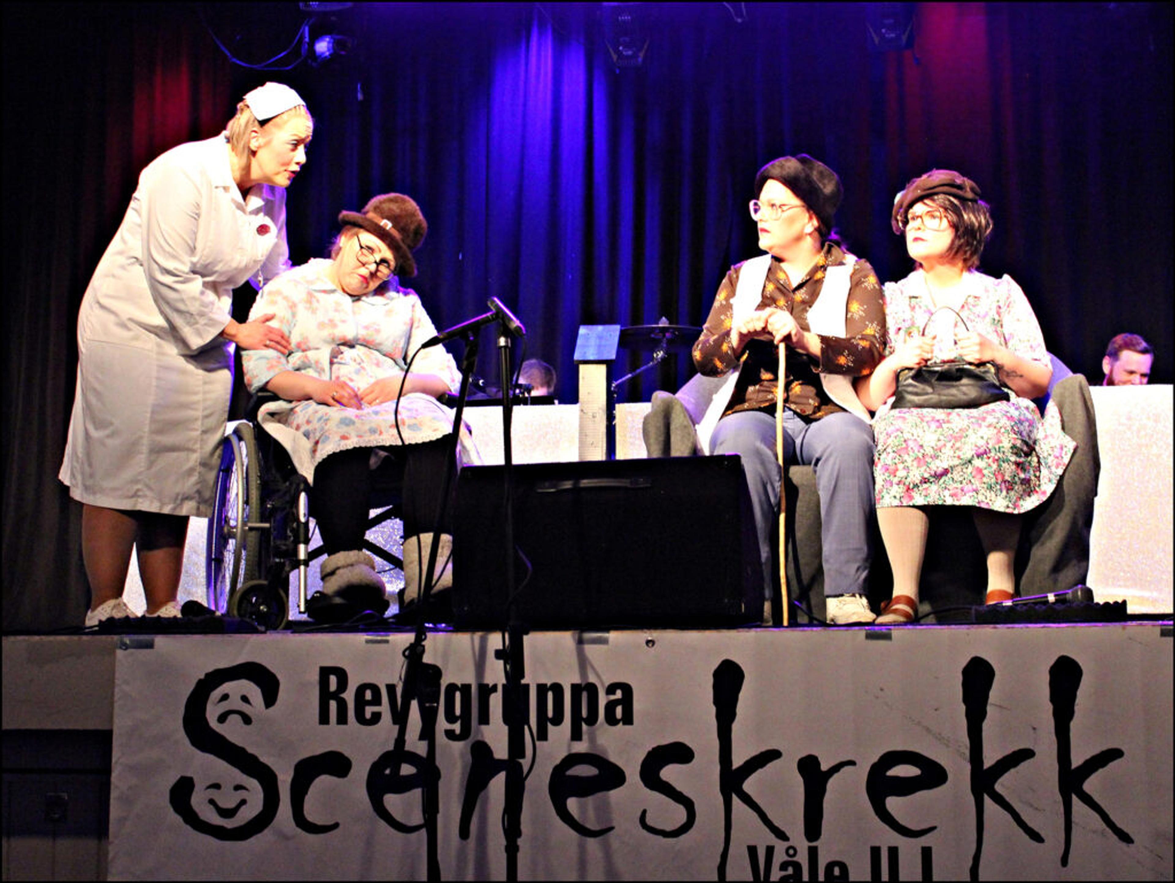 LEKENDE LETT: Tønsberg kommune leverer de gode poengene våre på sølvfat, skriver Anniken Thuve Ivarsson, her sammen med revygjengen sin før fjorårets lokalrevy på Fjellborg. Foto: Stian Ormestad, ReAvisa.