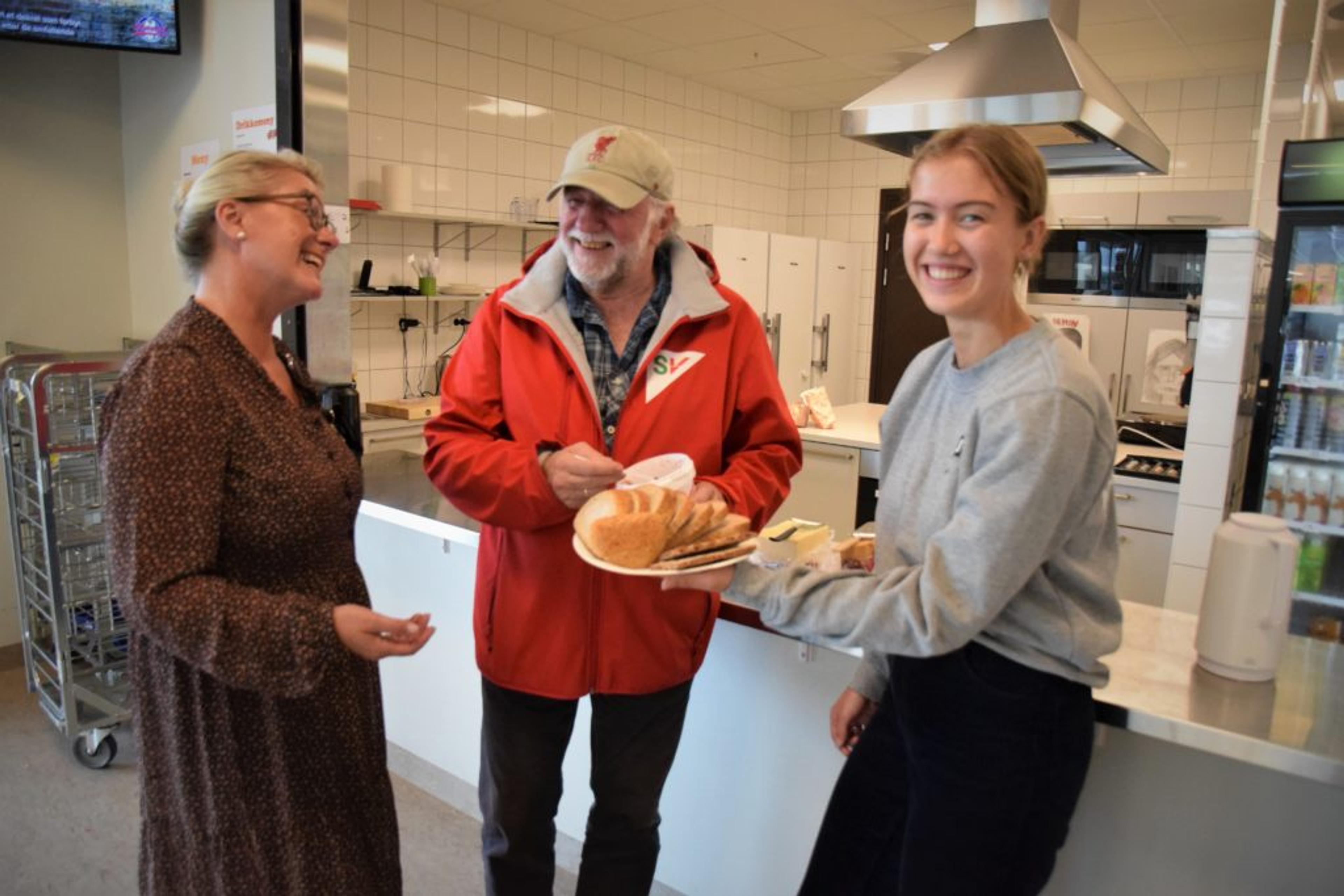 VALGKAMPLØFTE: SV vil sikre skolemåltid, slik det er på Revetal ungdomsskole. Det ble lova i valgkampen, ved Heming Olaussen, 1. vara til kommunestyret i nye Tønsberg, og Helene Viken, kommunestyrerepresentant. Her midt i frokosten med rektor Mona Elisabeth Larsen. Foto: Stian Ormestad.