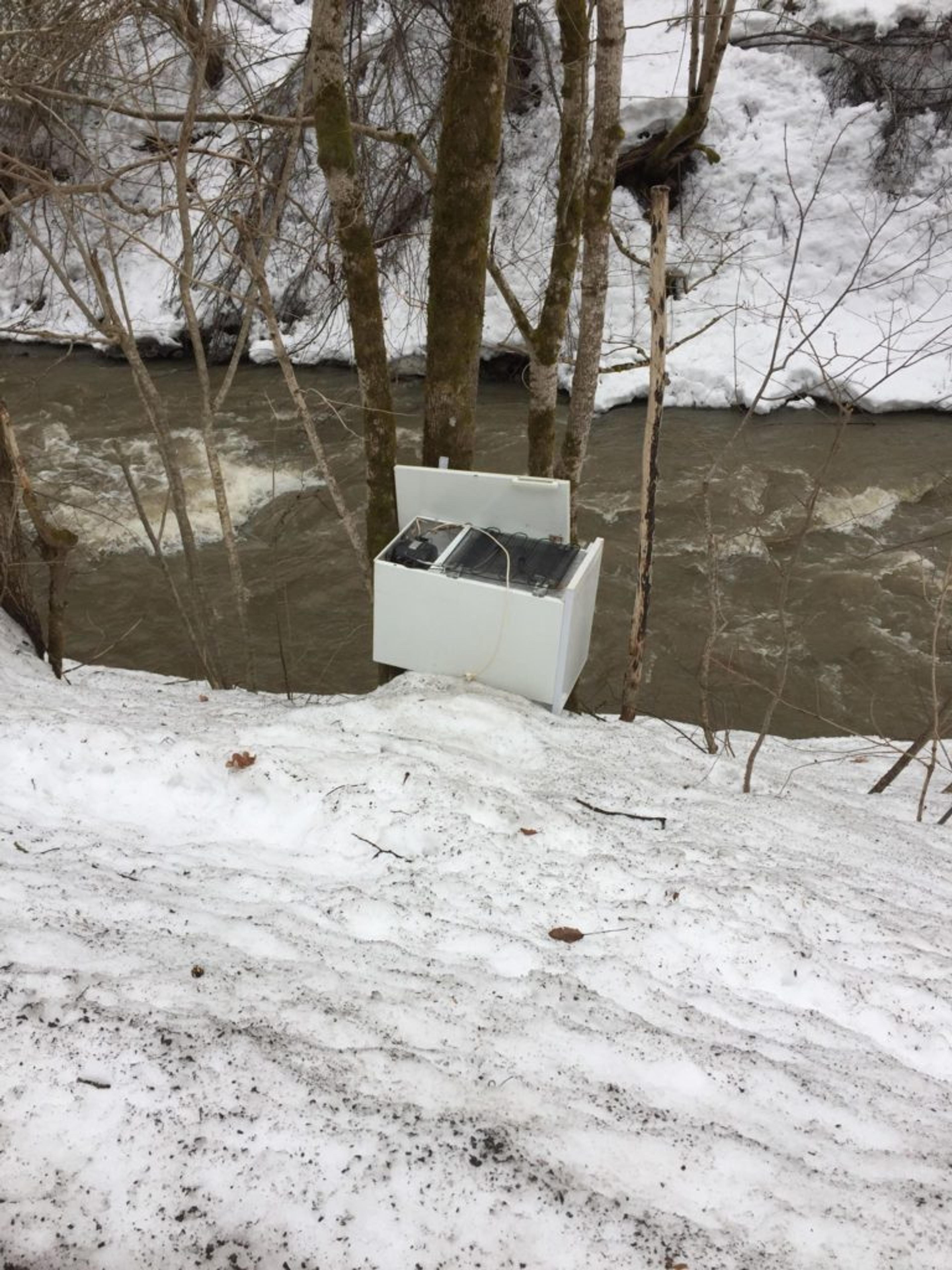 SØPPEL I NATUREN: Ikke et pent syn. Og helt unødvendig, for vi har kort vei til gratis levering av det meste av sortert avfall på mottak. Denne fryseboksen ble dumpa fra veien og ned mot elva i Askjerdalen forrige vinter. Foto: Privat.