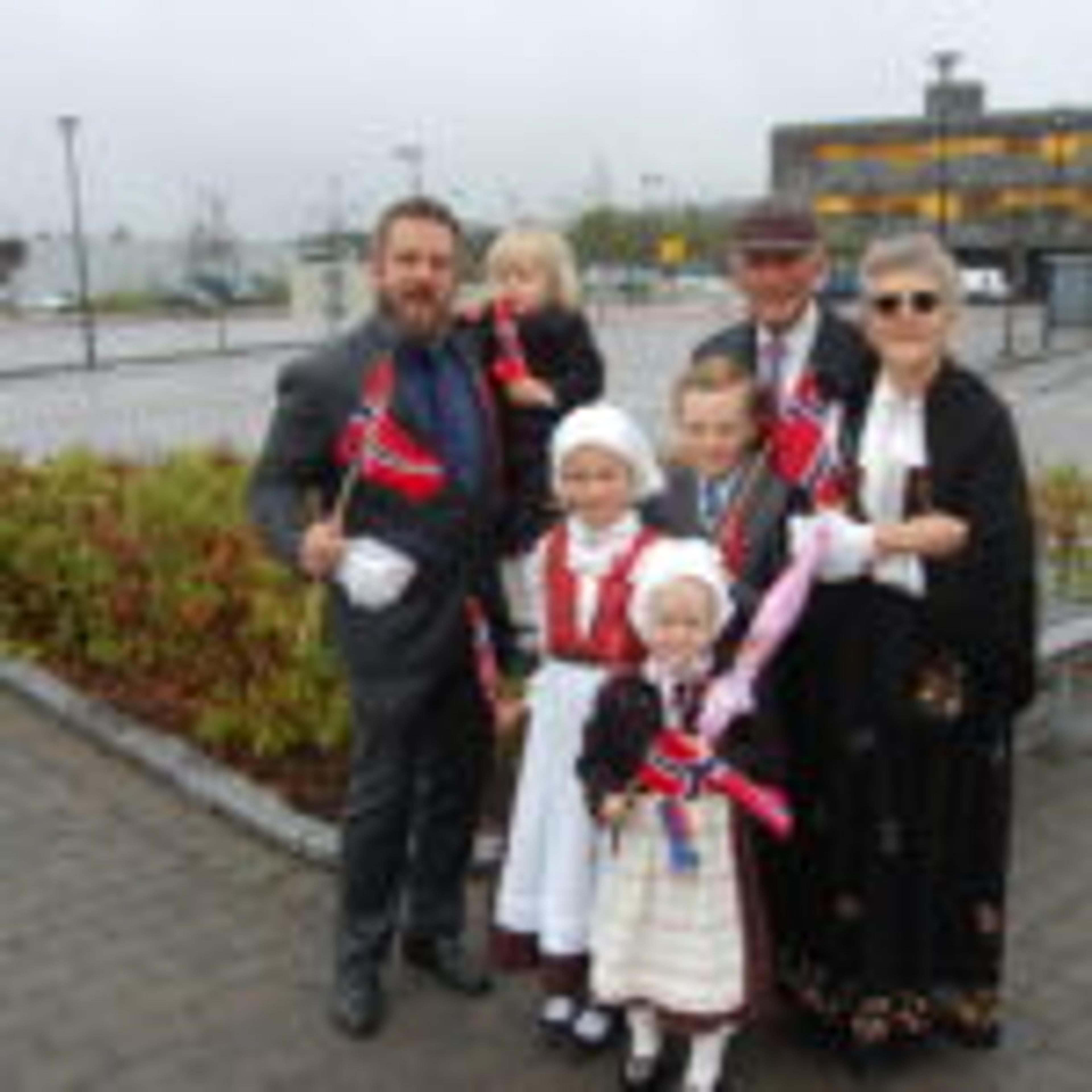 FØRSTE PUNKT PÅ 17. MAI-PROGRAMMET: Fra venstre Magnus Theiste Østlie, Mats Larssen Østlie, Silje Theiste Gjersøe, Maja Larsen Østlie, Laurence Østlie og Kristin Teiste Østlie. Foto: Håkon Westby.