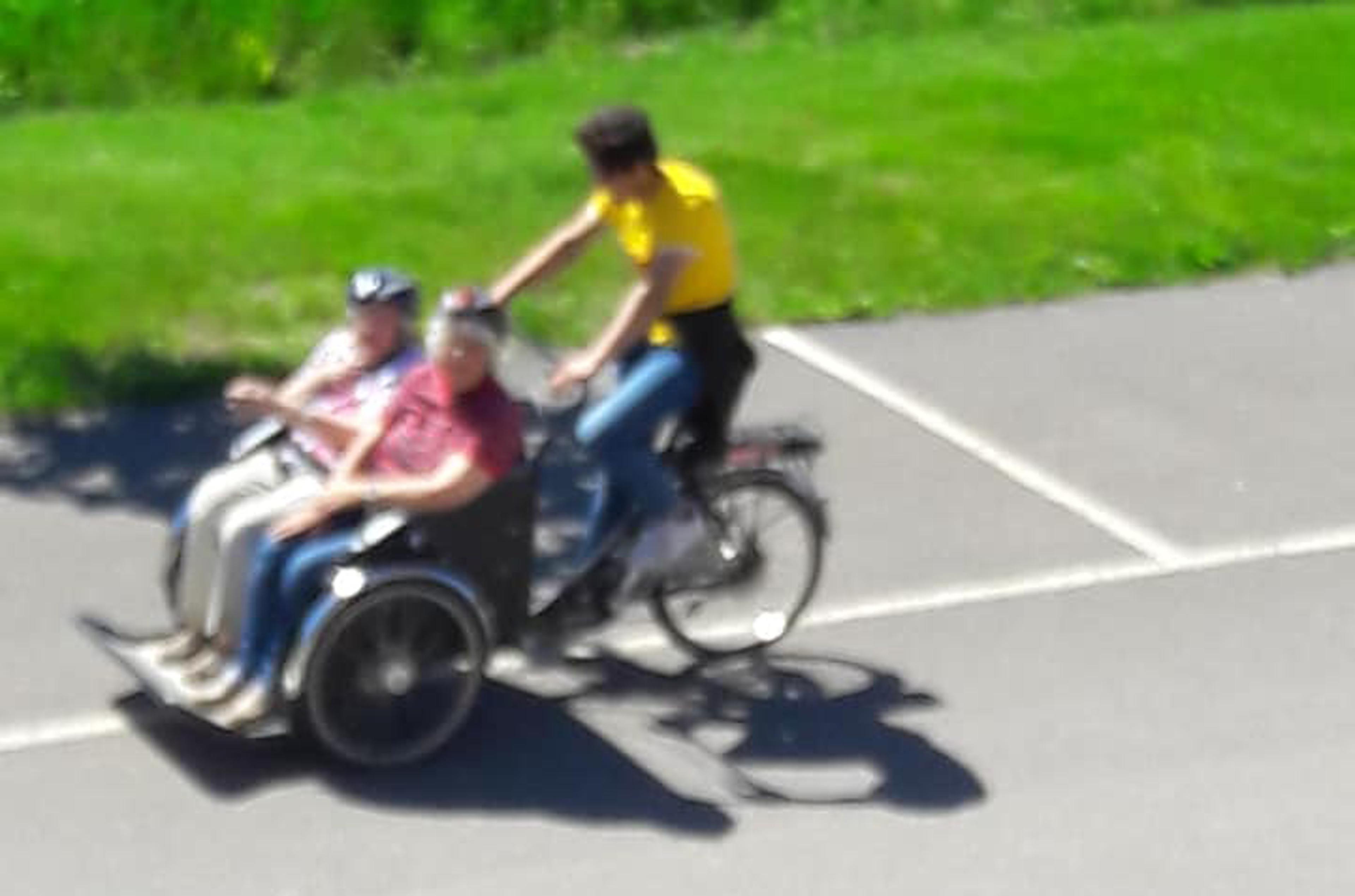 FULL FART PÅ SYKKEL: Såpass gikk det unna, at kulturkoordinatoren fikk bare et ganske så uskarpt bilde av studentene som lufta beboere på Re helsehus… Foto: Gro Hansen.