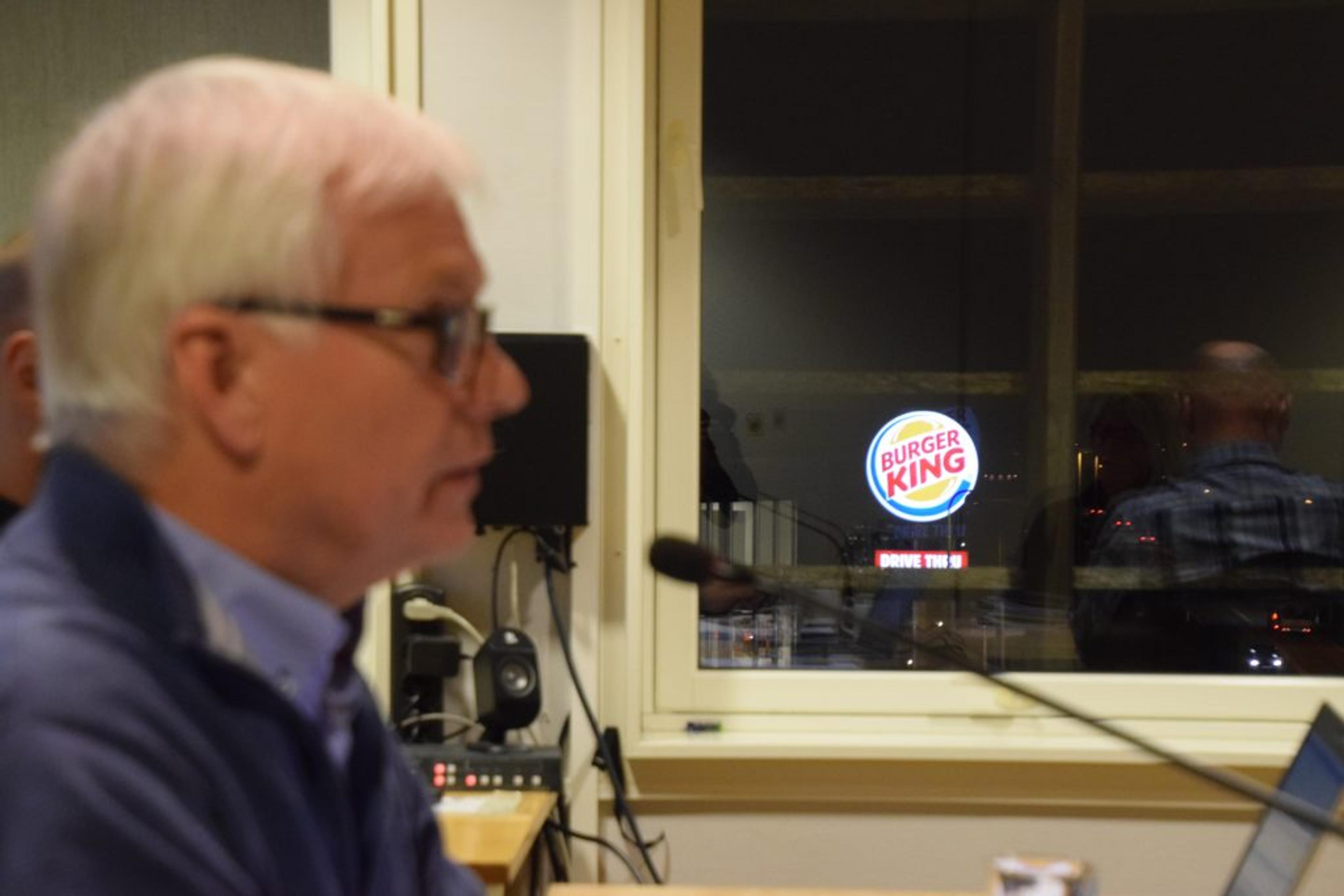 BURGER KING LYSER OPP: Hovedutvalgsleder Odd Gjerpe (KrF) lyssettes av Burger King-skiltet rett utenfor formannskapssalen i toppen av kommunehuset. Foto: Stian Ormestad.