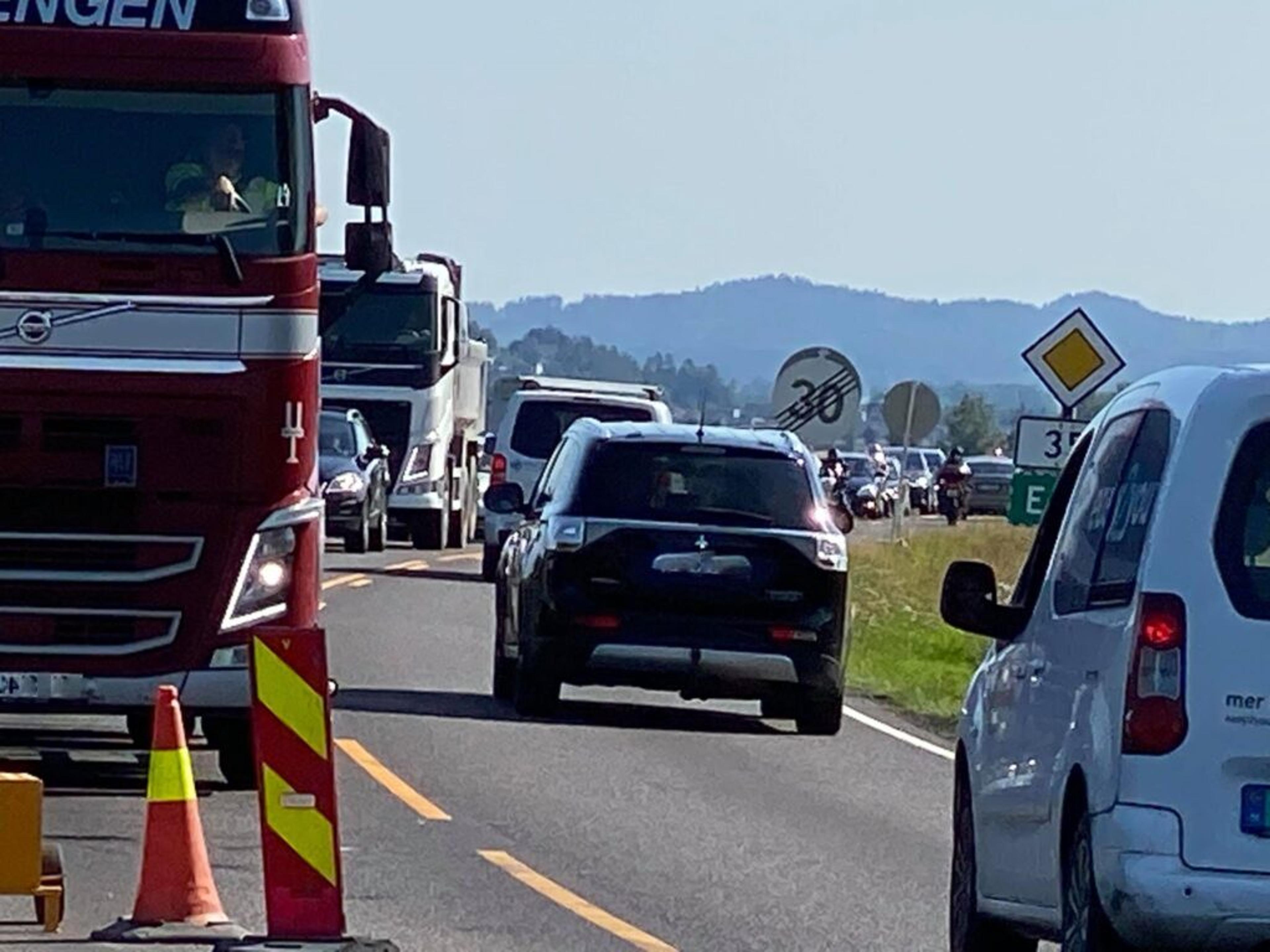 KØ: Så tett med biler er det ved lysreguleringa ved Bakke mølle onsdag ettermiddag 12. august. Foto: Stian Ormestad.