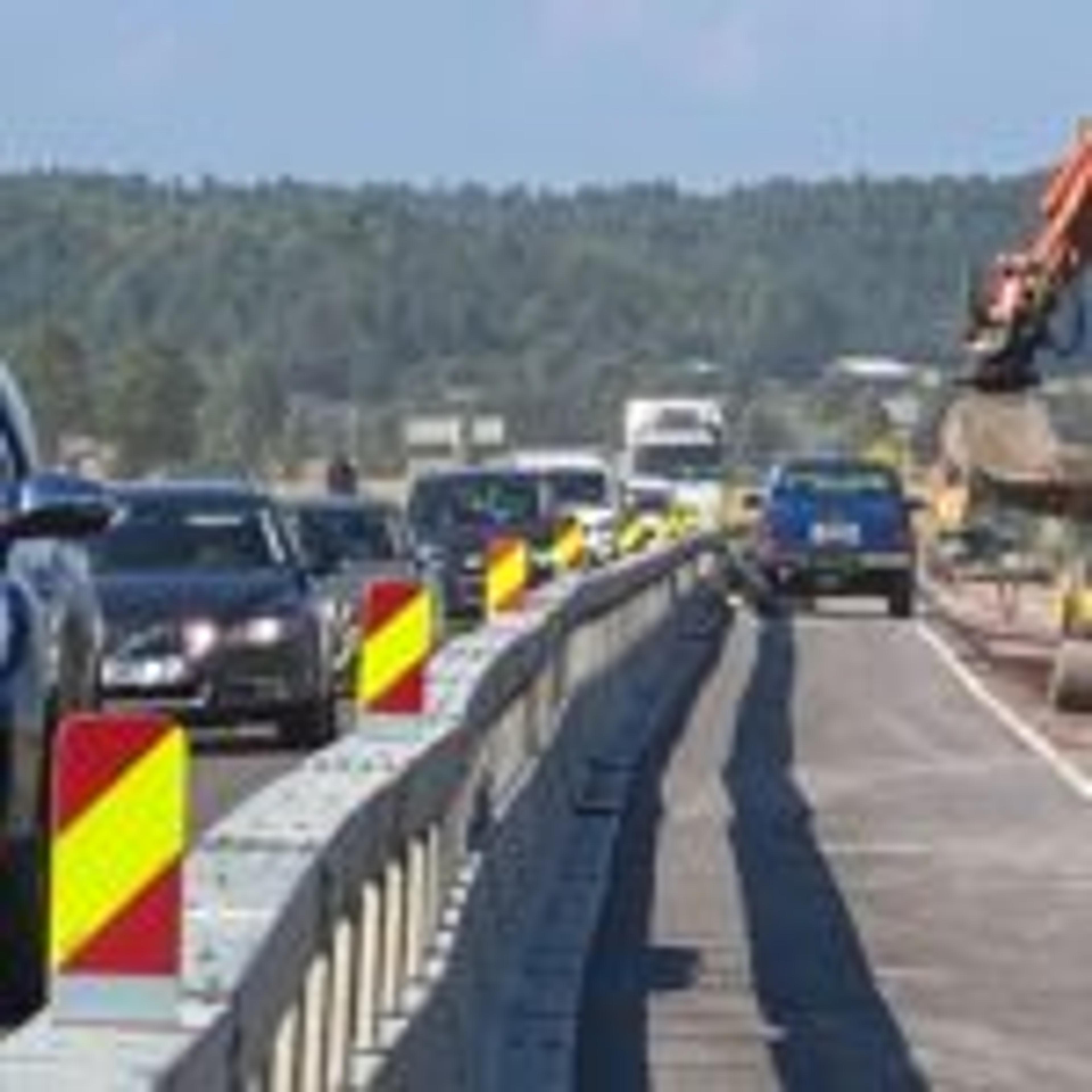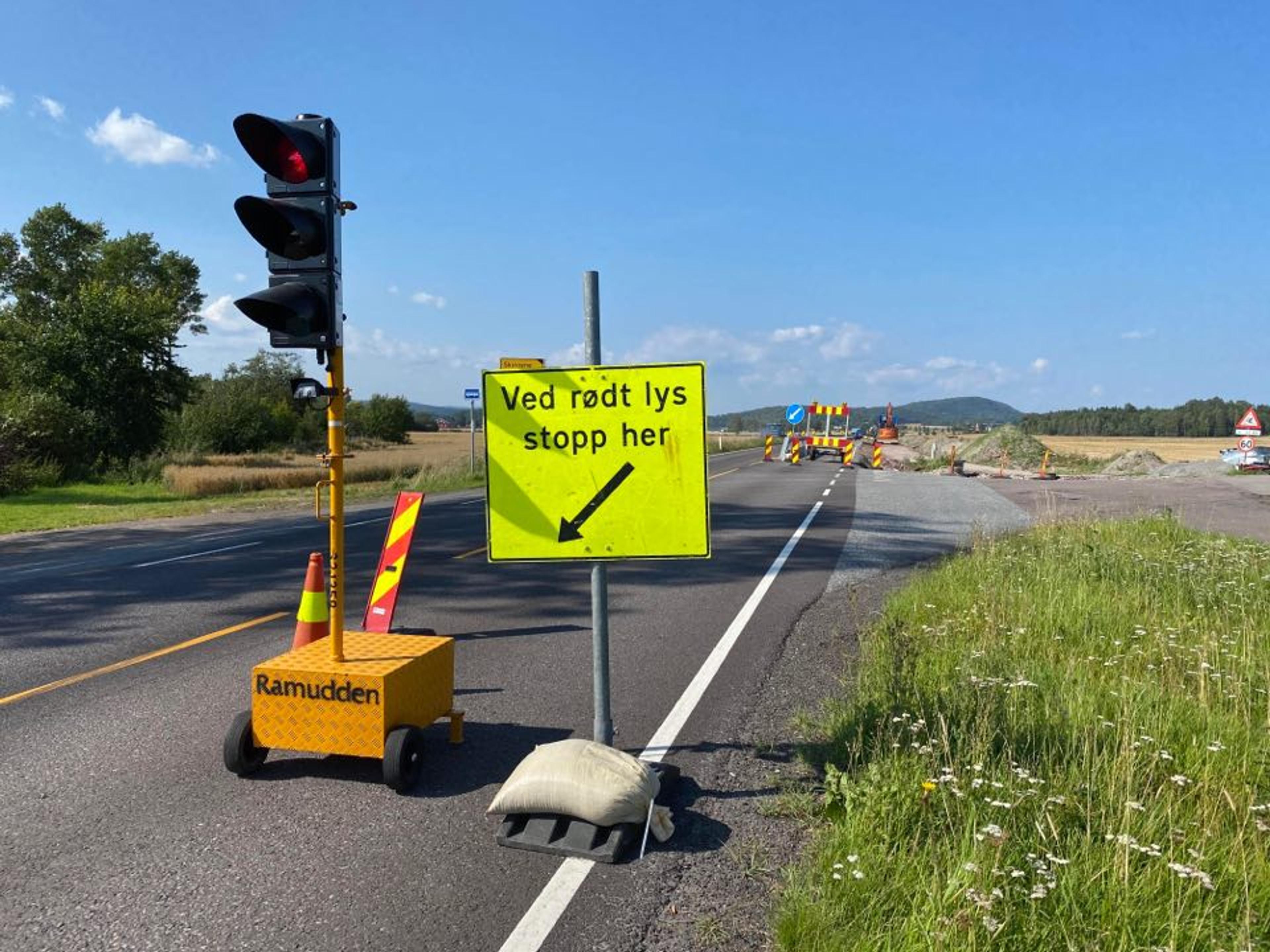 Den nye gang- og sykkelstien fra Bakke mølle til Svinevolltar nå form. Det er lysregulering og trafikk i ei fil forbi veiarbeidet.