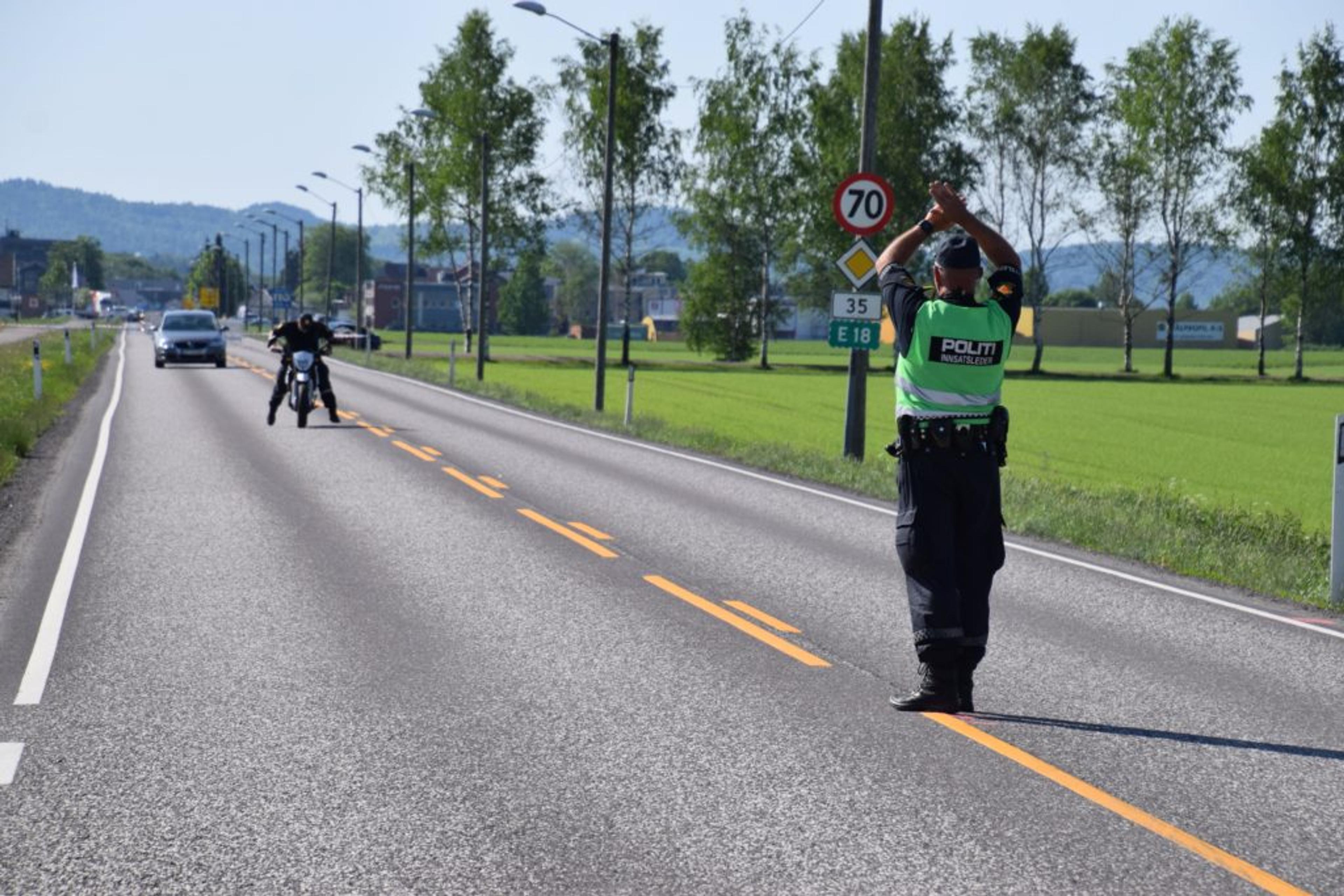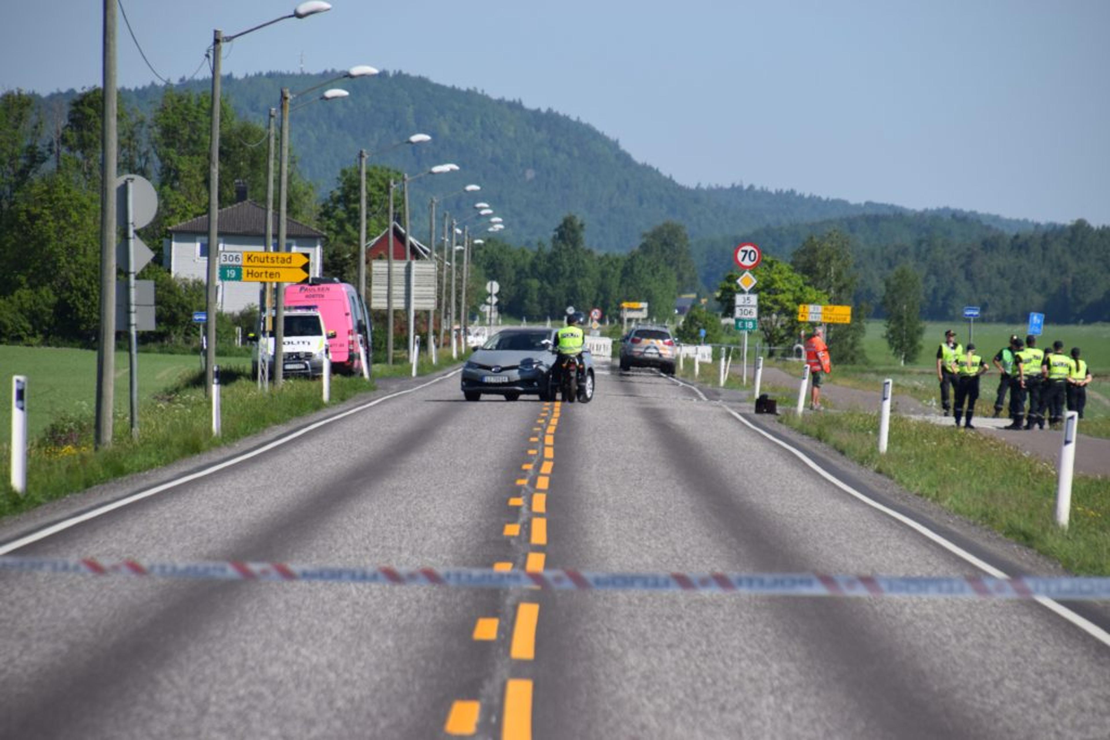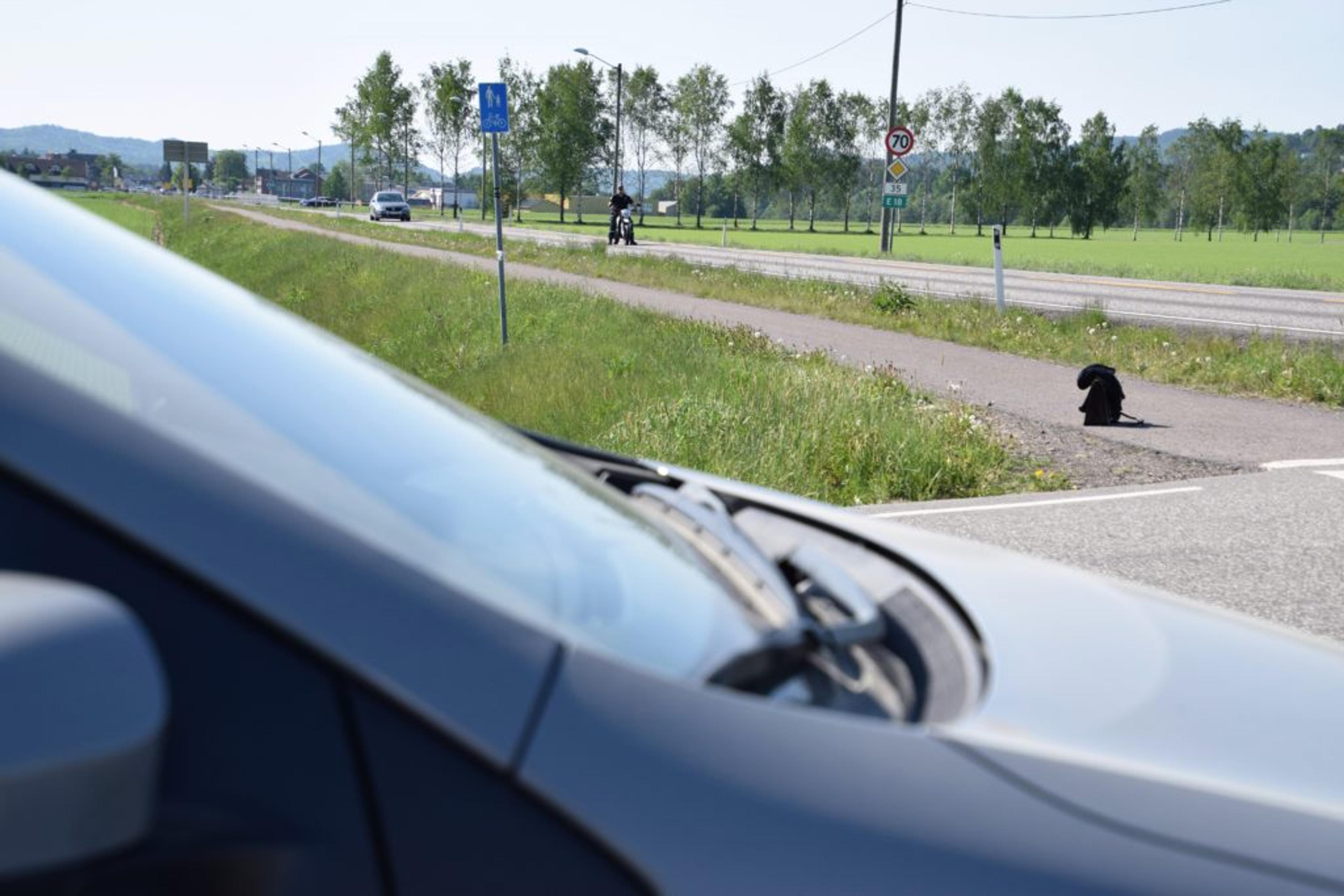 REKONSTRUKSJON: Dette så kvinnen i 50-åra fra sin synsvinkel, ifølge rekonstruksjonen den siste fredagen i mai. Hun hadde fokus retta mot bilen bak motorsykkelen. Foto: Stian Ormestad.