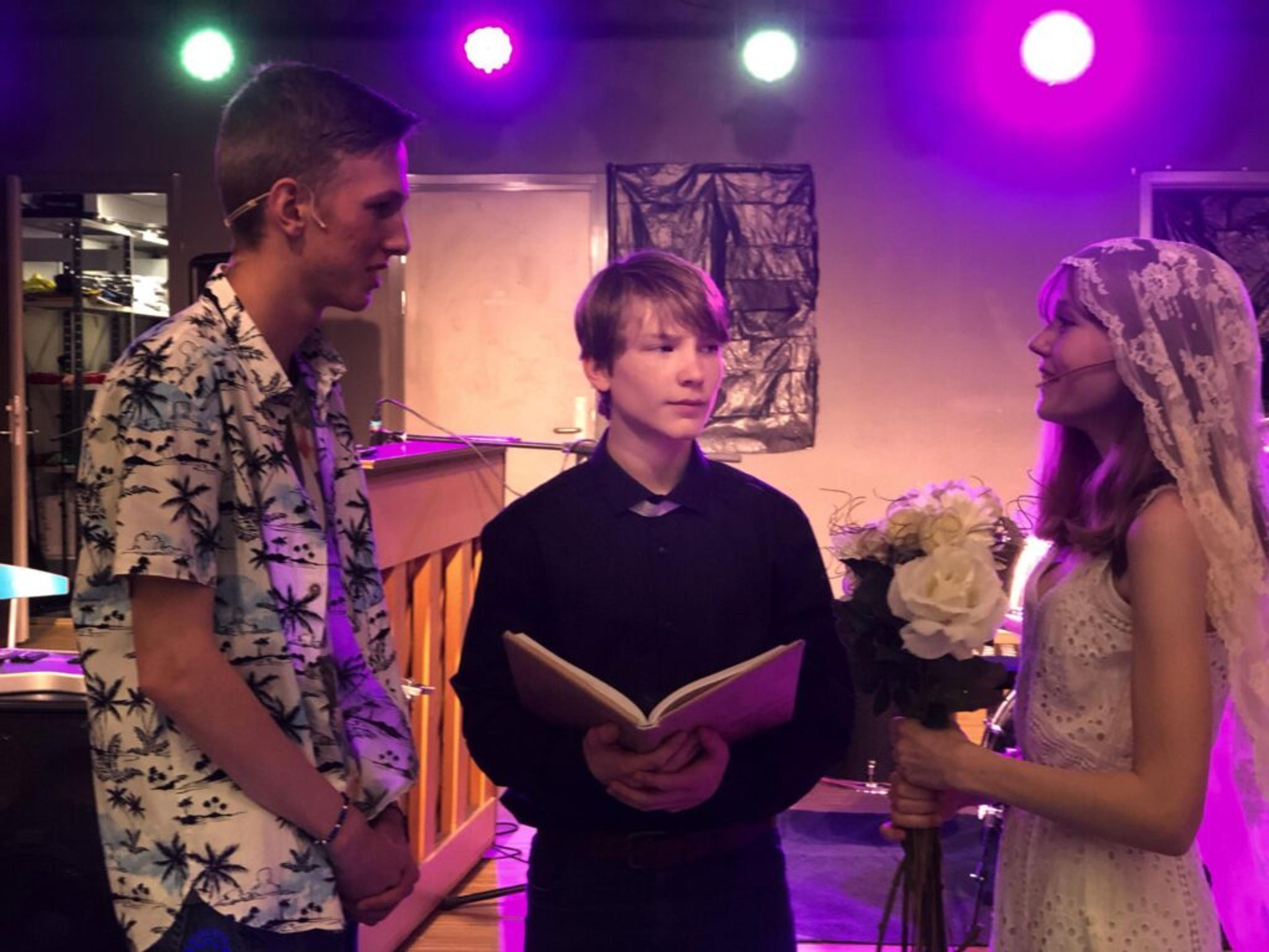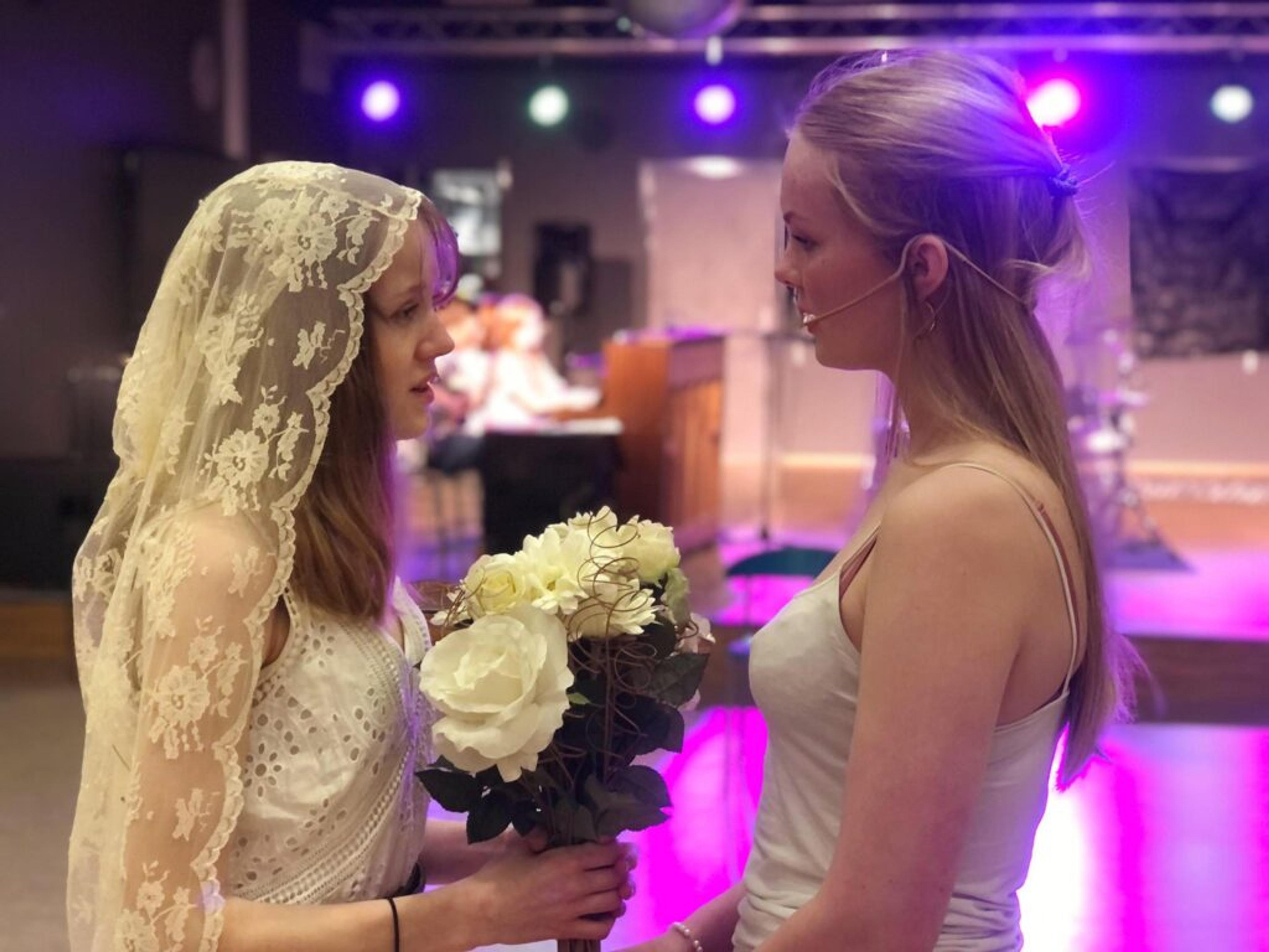 ROMANTIKK: Mamma Mia innholder alt det en romantisk historie skal inneholde – også når den tar form i Revetal ungdomsskole-elevenes regi. Foto: Privat.