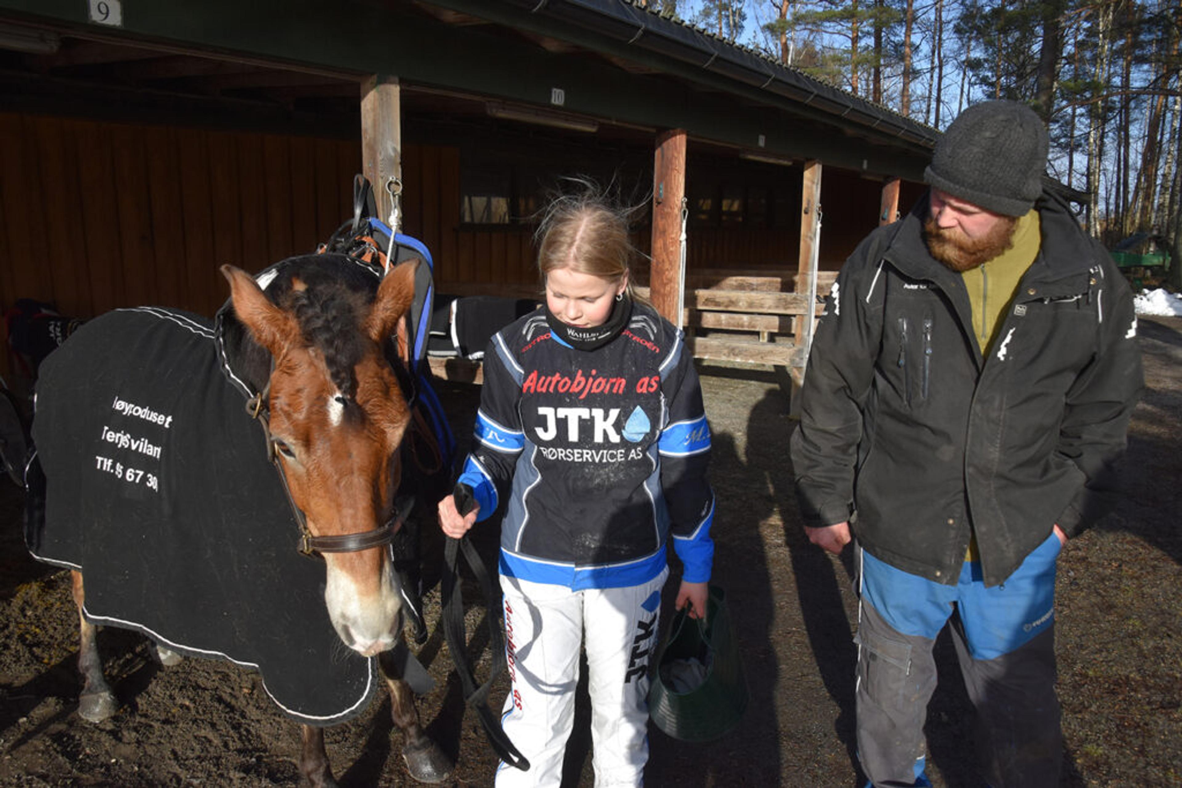 FRAM TIL START: Pappa gir noen siste råd før Maren skal suse avgårde i sulkyen i et startfelt på totalt åtte ponni-trav-kusker. Foto: Stian Ormestad, ReAvisa.