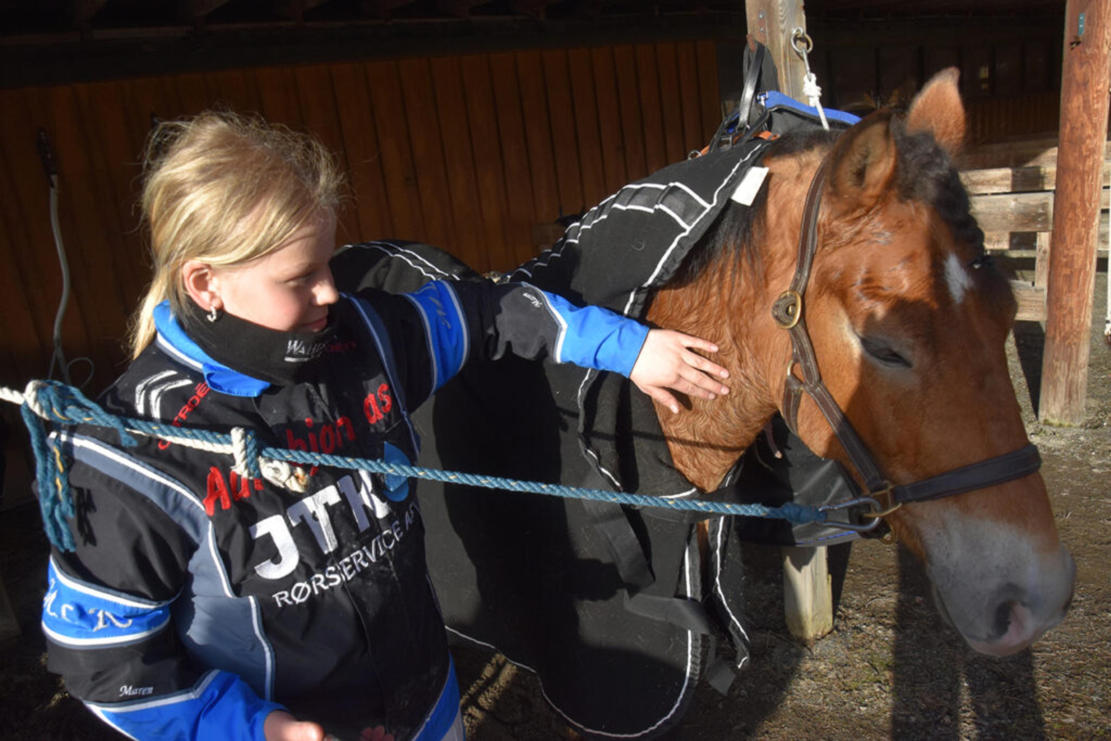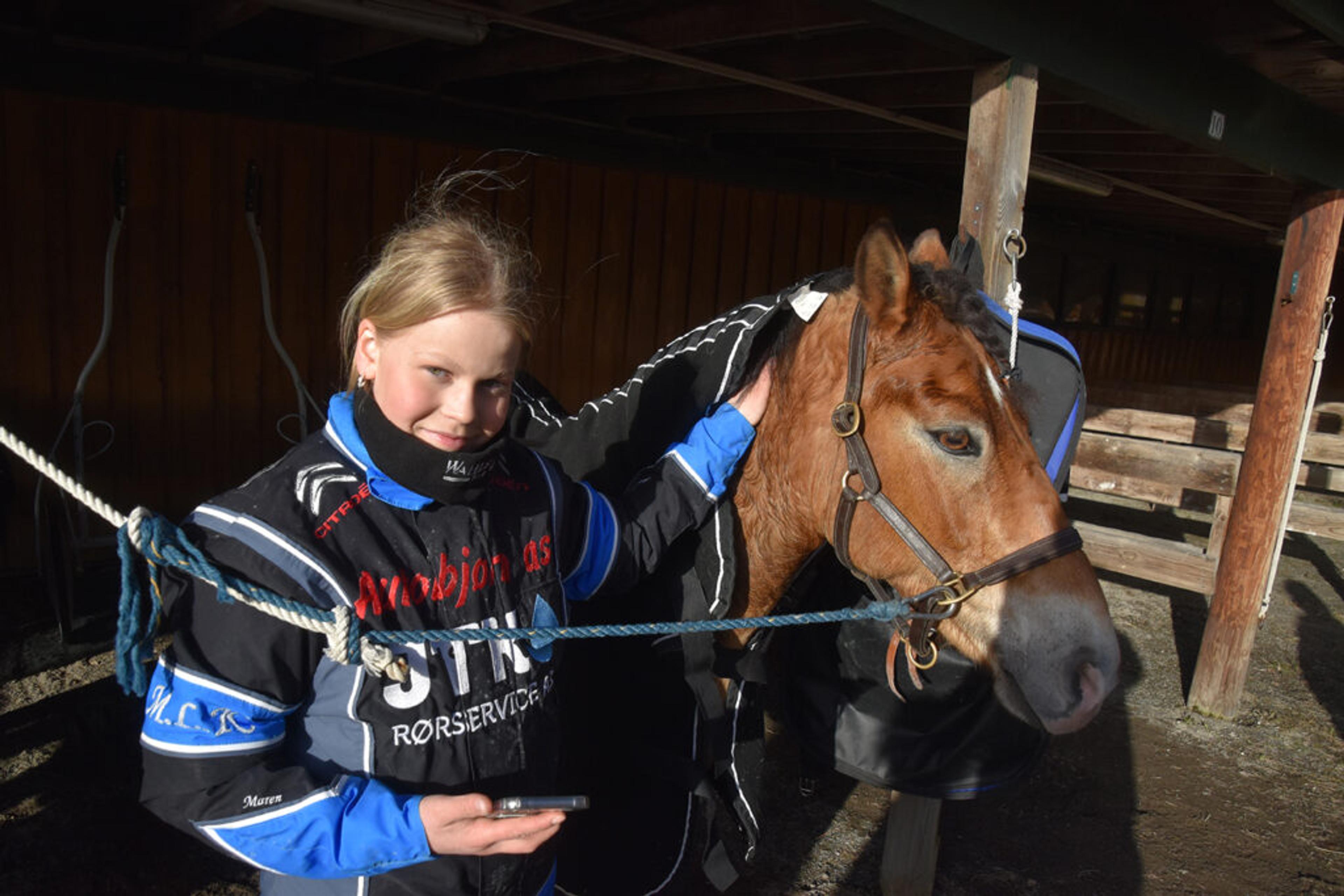 Maren Lie Karlsen (13) fra Kalsrud gård i Kleiva trener tre dager i uka og har stell alle dager, bortsett fra kveldende det er fotballtrening med Re FK eller det er lekser som må prioriteres. Da tar mamma eller pappa stellet.