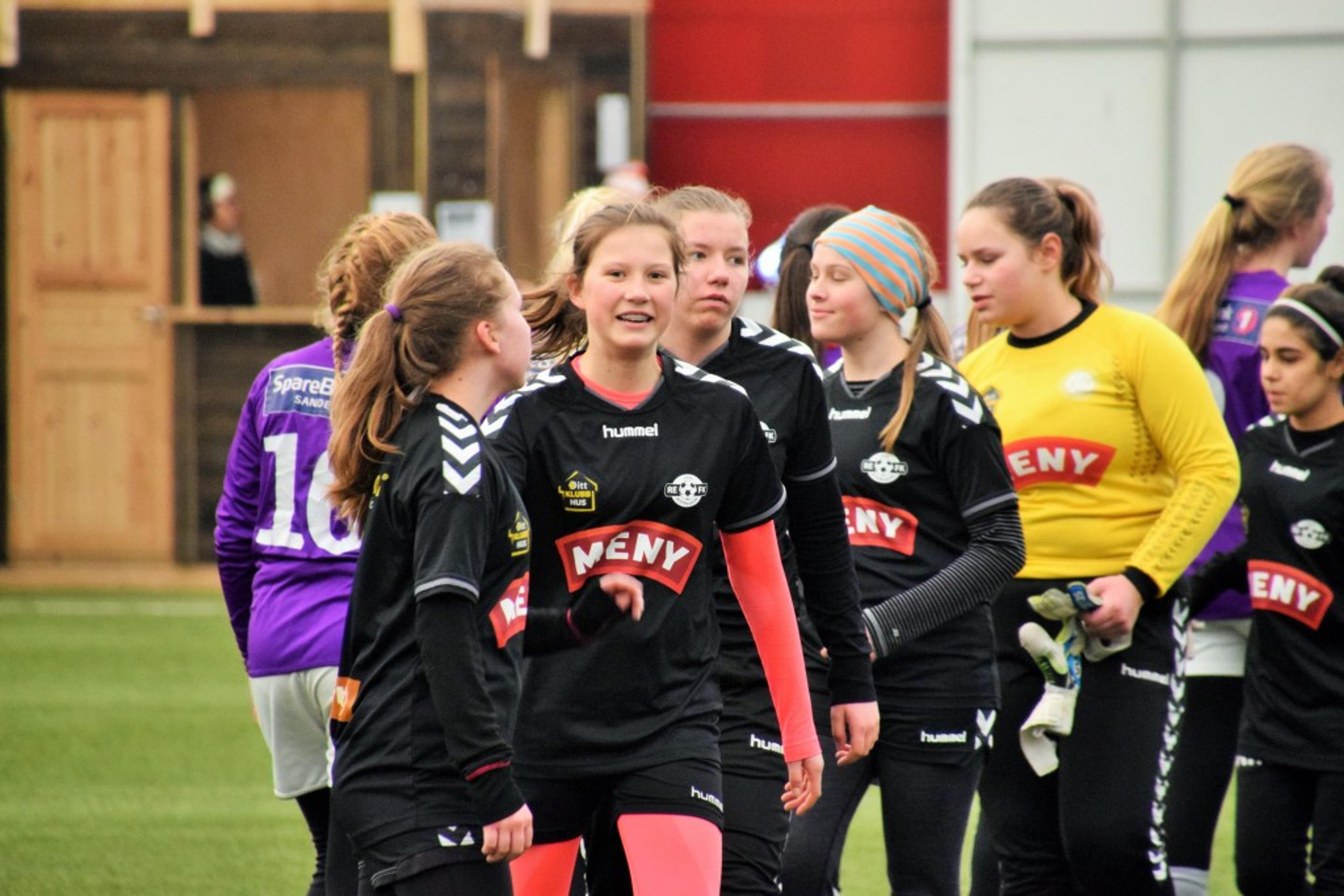 RE FK J16: Maren (andre til venstre, nede) sammen med lagvenninnene i Re FK i mars 2016 under Meny Arena Cup. Foto: Stian Ormestad