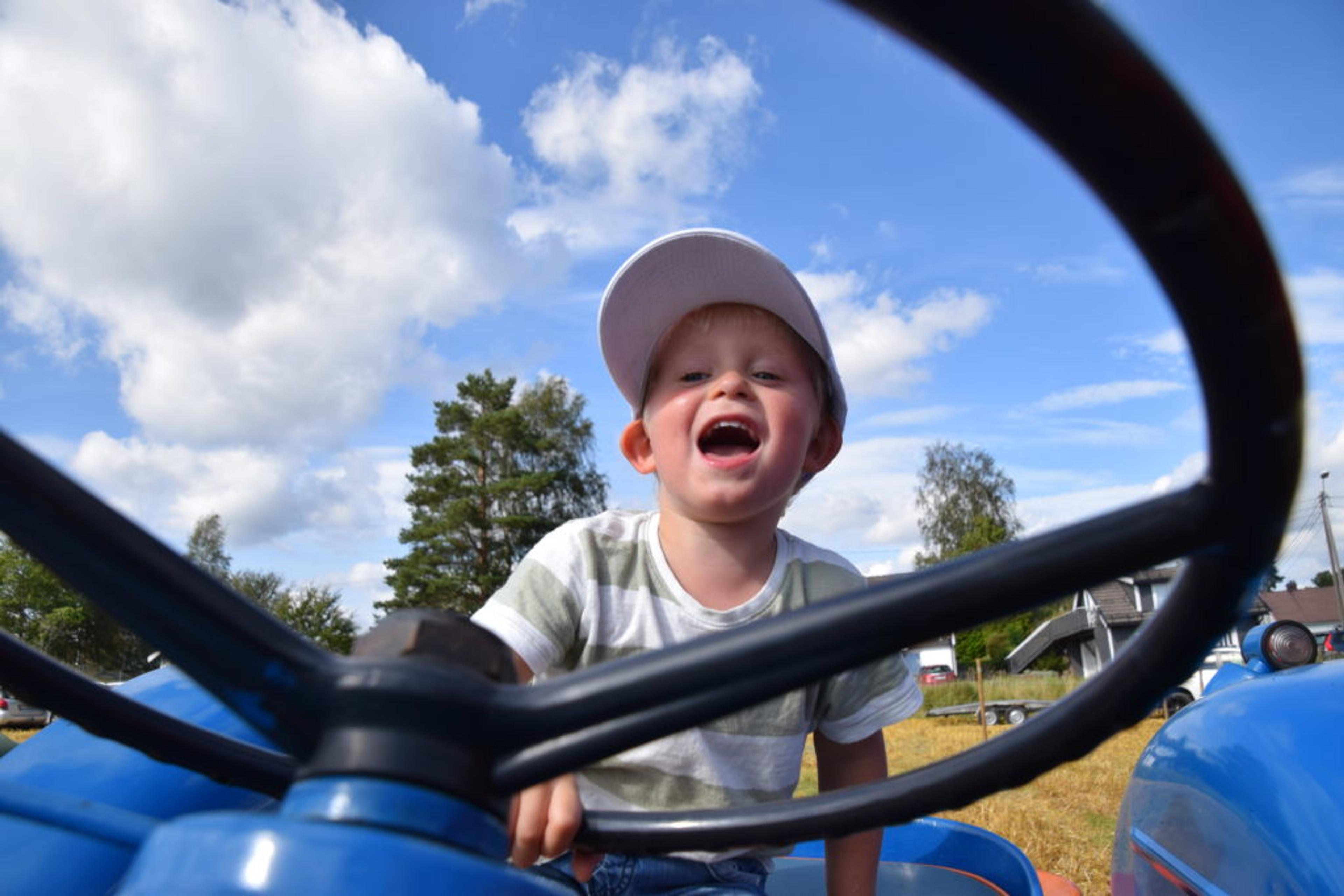 TRAKTOR ER STAS! Flere flotte traktorer blir parkert på nytreska jorder under Åpen gård på Brår. Bildet er av en glad gutt under forrige Åpen gård, før korona, for tre år siden. Arkivfoto: Stian Ormestad.