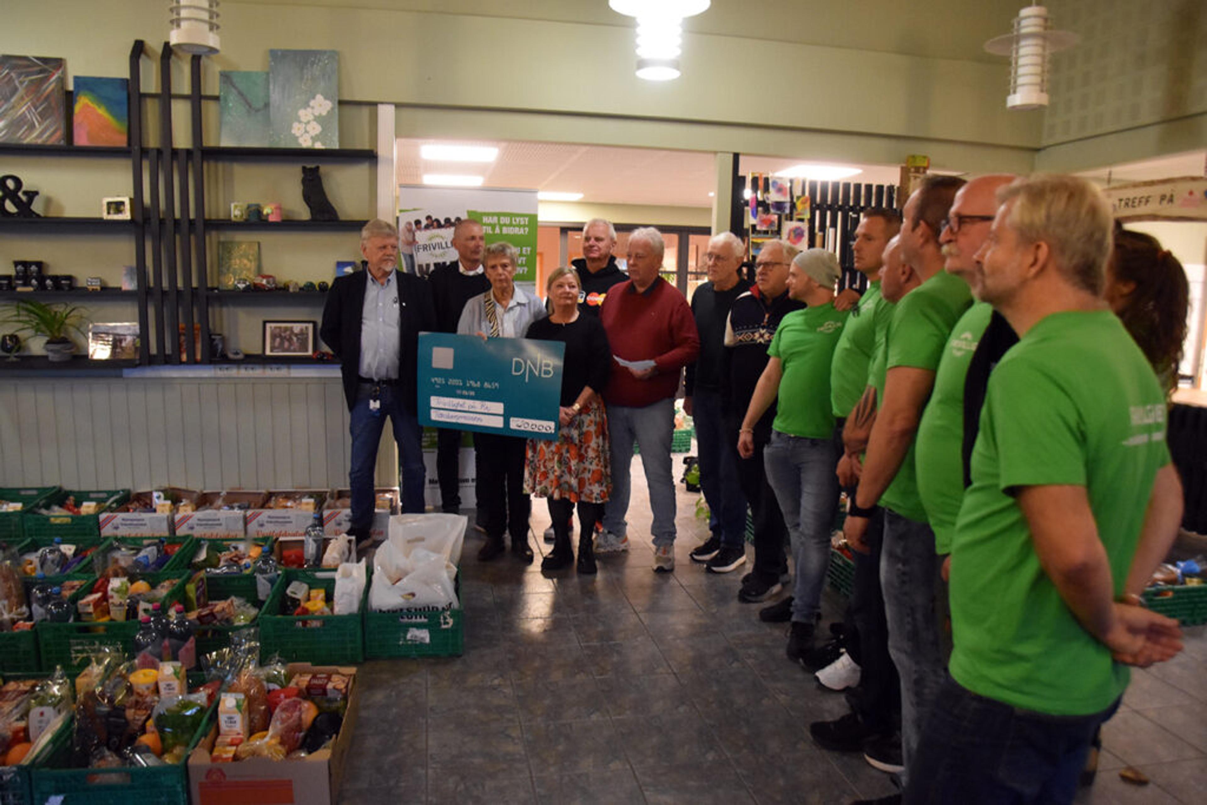 OVERREKKELSE: – Vi runda opp til 20.000 kroner, forteller messageneral Arild til ReAvisa. Her overrekkes sjekken til frivilligleder Torbjørn. Foto: Stian Ormestad, ReAvisa.