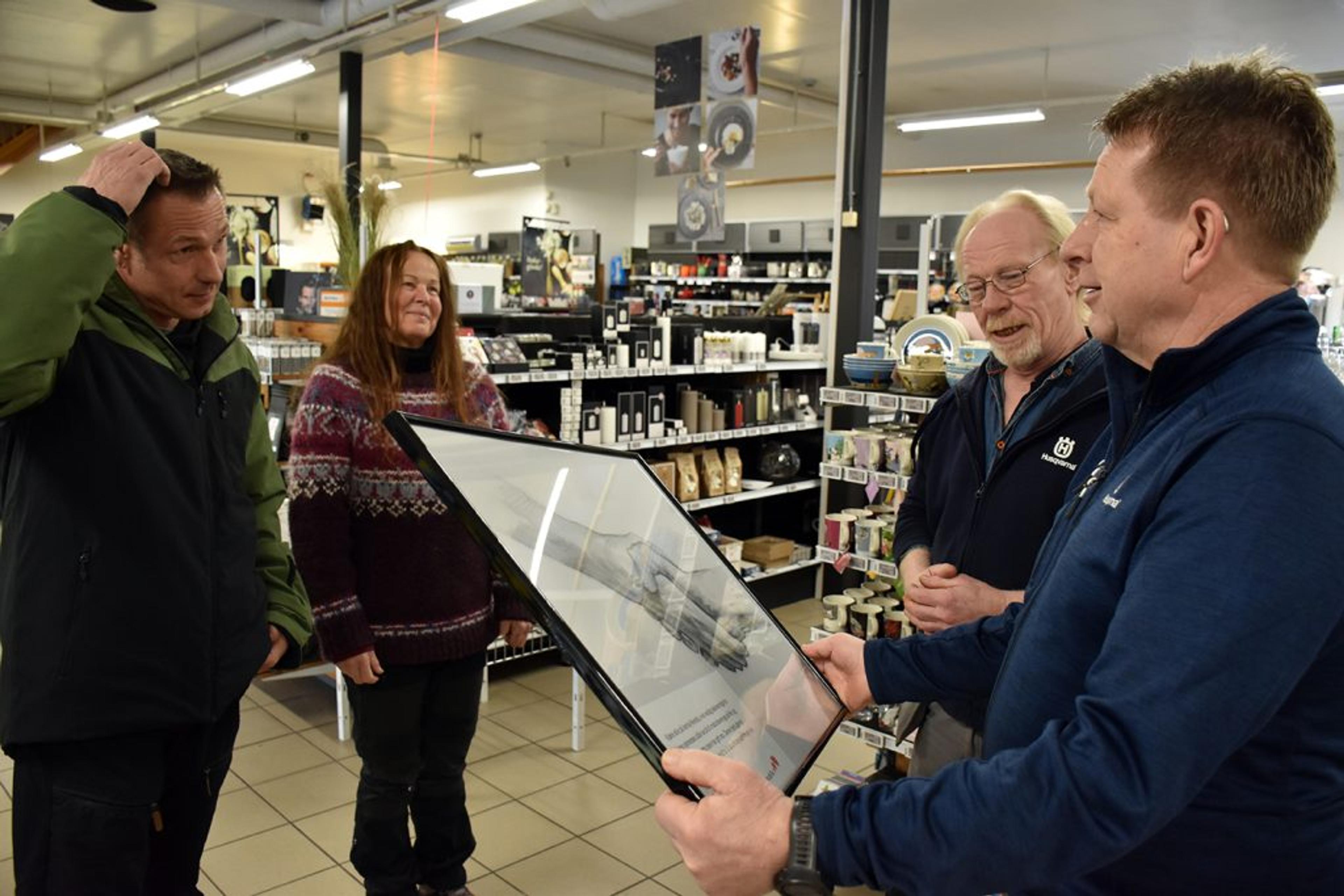 – Vi får egentlig ikke takka dere godt nok, sier Torbjørn på vegne av de frivillige, – men dette er i hvert fall et forsøk, sier han og overrekker det flotte bildet i glass og ramme. – Det skal få en godt synlig plassering her hos oss, forsikrer Morten.