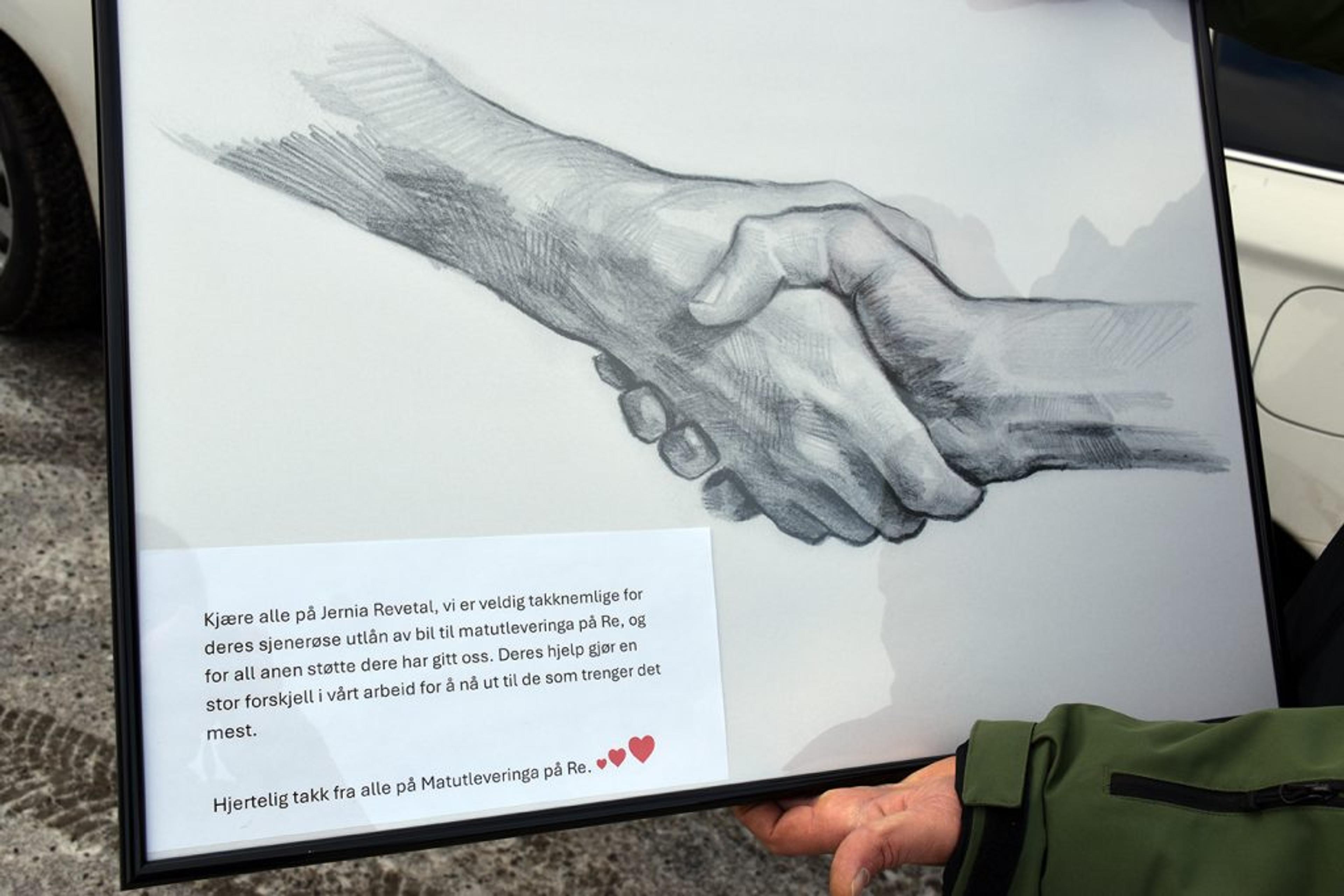OVERREKKELSE: Et flott bilde i glass og ramme, med en fin hilsen og en stor takk fra de frivillige ved Matutdelinga i Re. Foto: Stian Ormestad, ReAvisa.