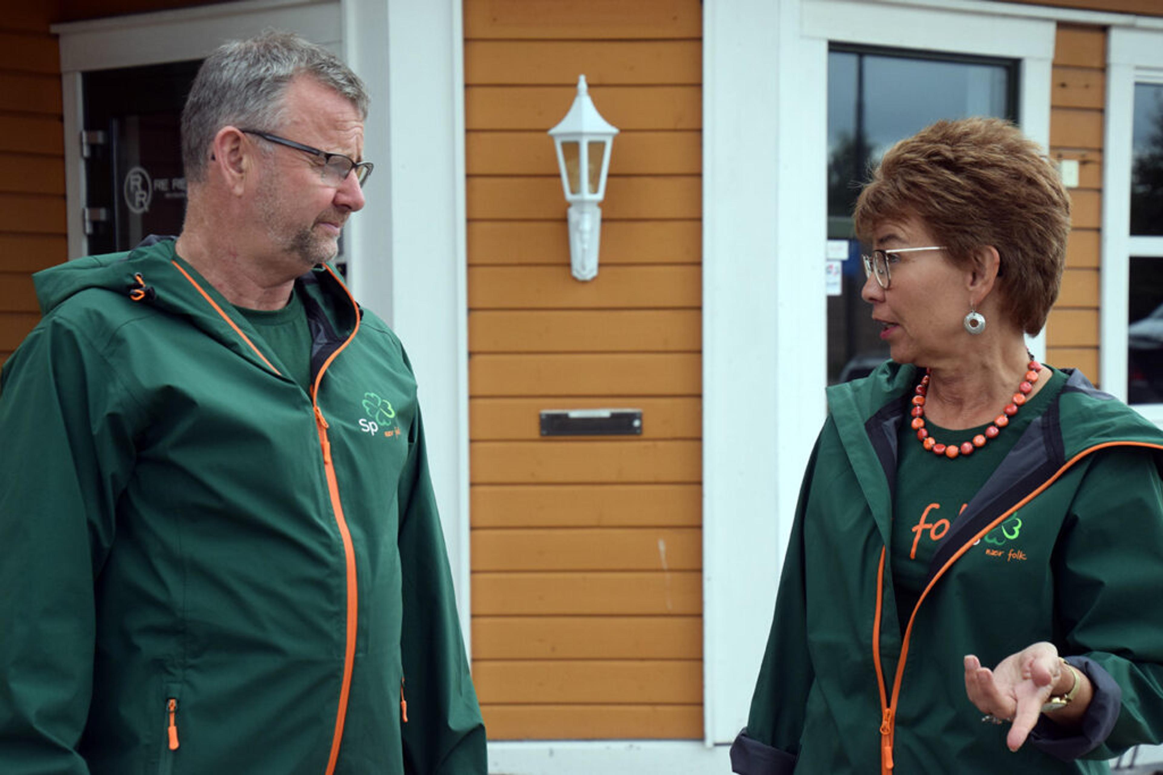PÅ RE-BESØK: 1. kandidat for Senterpartiet i Vestfold Kathrine Kleveland kjenner godt til Re og det gode skyvet her i bygda. Men hun er skeptisk til reformer som flytter på grenser og legger ned lensmannskontor. Det gjør noe med også Re som sted. Med seg på Re-turen har hun 2. kandidat Per Asbjørn Andvik fra Re. Foto: Stian Ormestad.