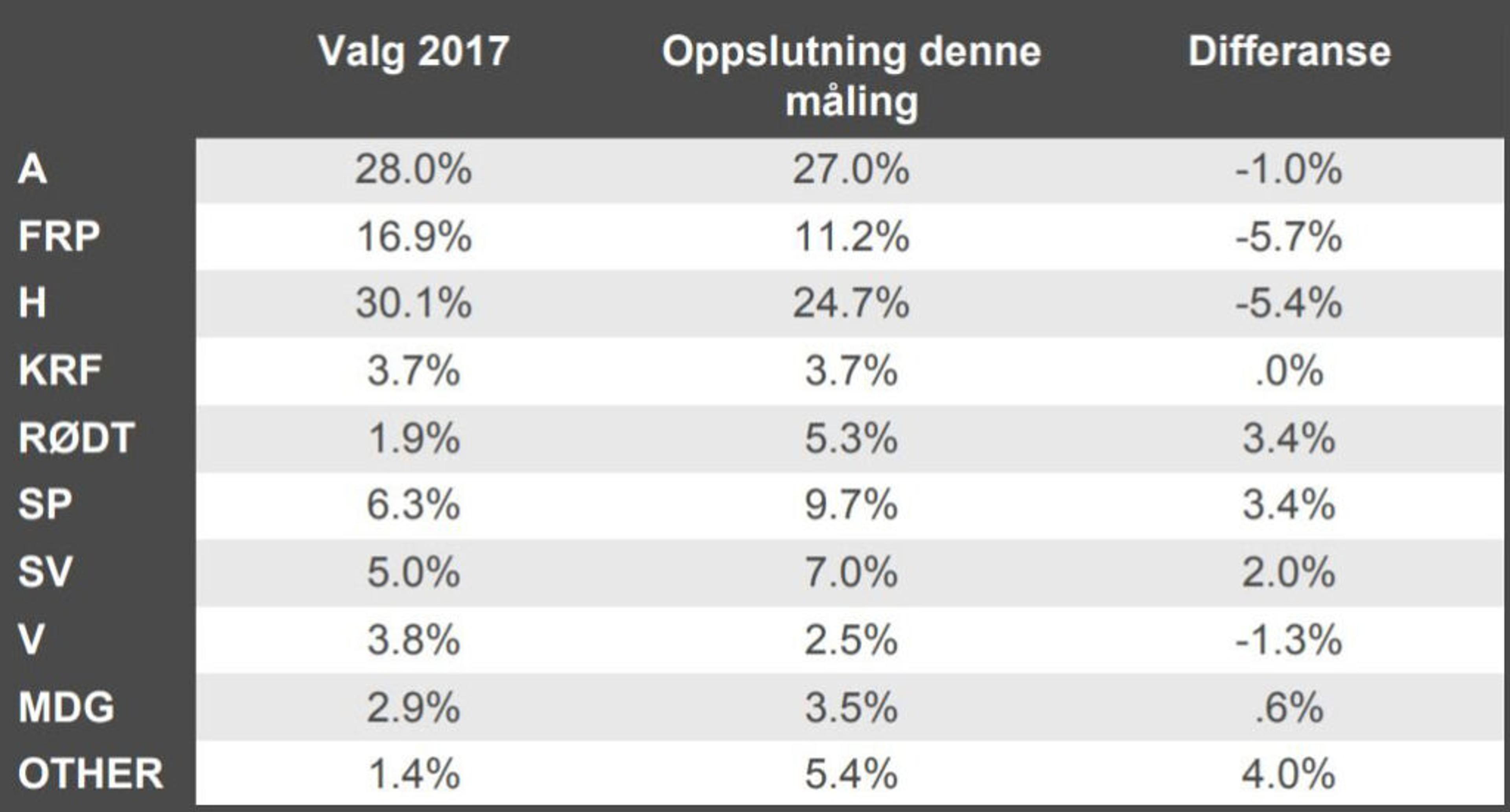 Utjavningsmandatet fra Vestfold ville ifølge denne riksdekkende supermålingen gått til Rødt, ved Maren Njøs Kurdøl fra Eidsfoss. Også Rødt øker med 3,4 prosent fra forrige stortingsvalg.