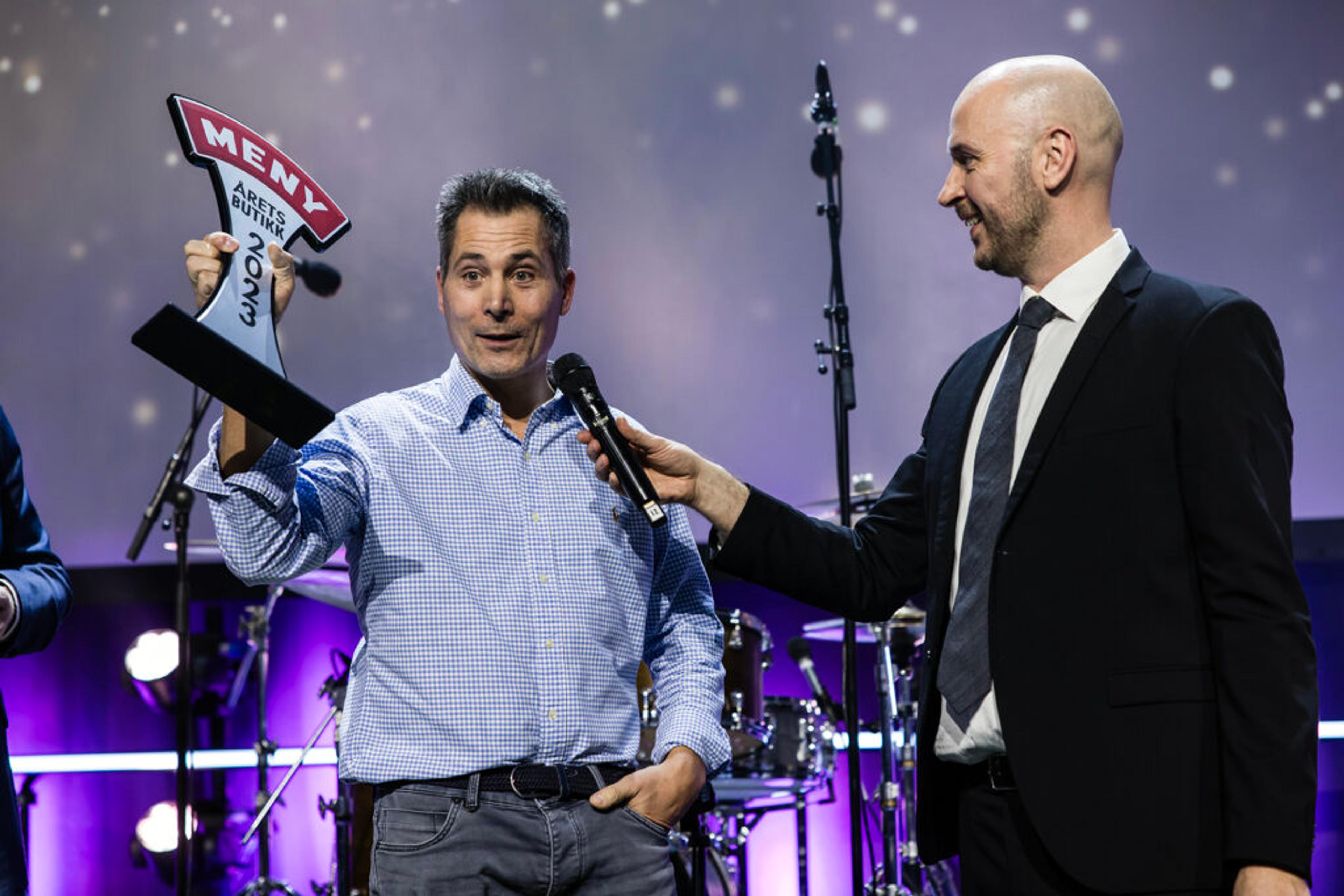 HURRA! Kjøpmann i fjerde generasjon Martin Gran blir intervjua av konferansier Terje Sporsem etter prisutdelinga på Meny-kjedens kick off på Lillestrøm 30. januar 2024. Foto: Fredrik Eckhoff, Meny.