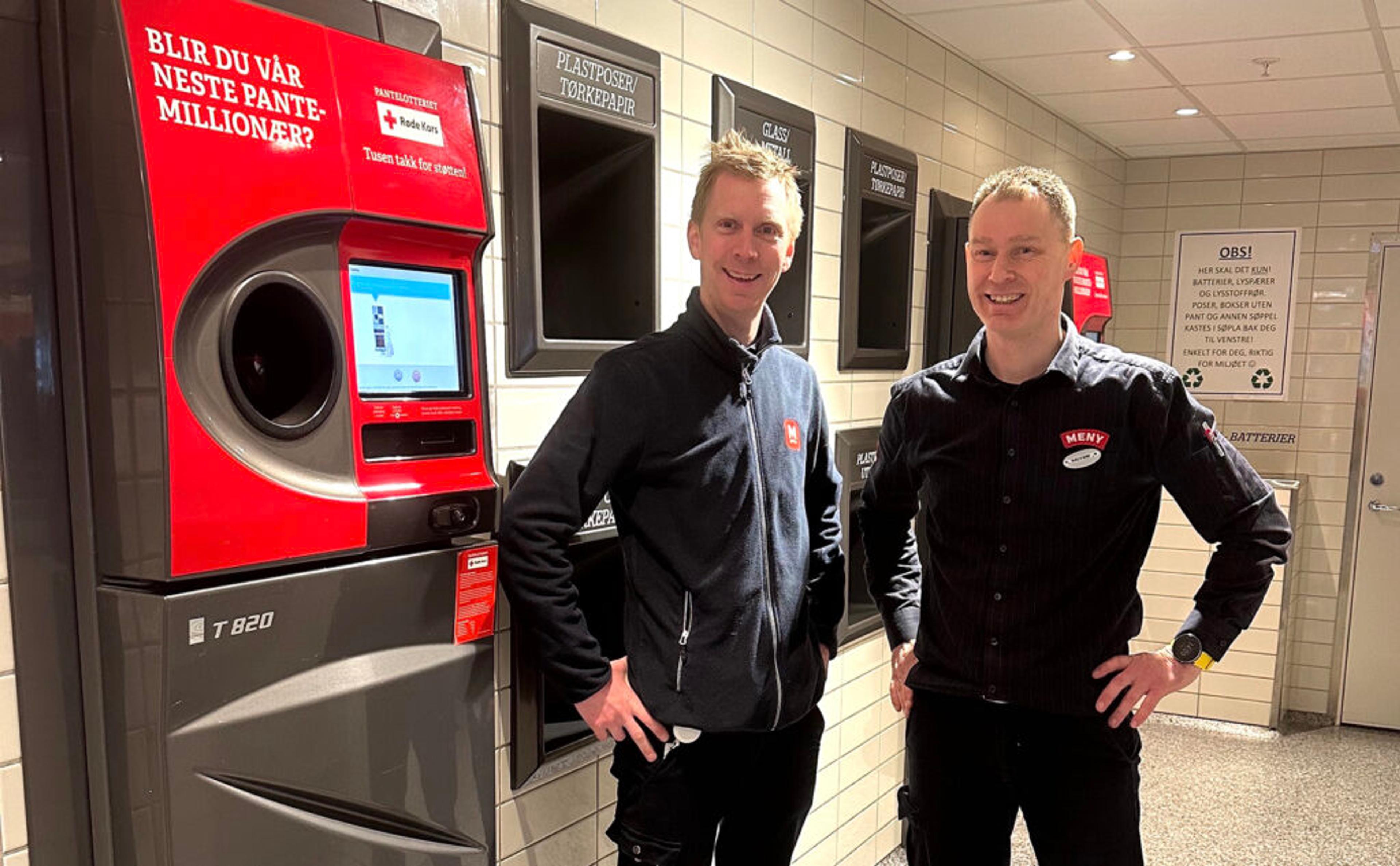 MEST PANT PÅ MENY REVETAL: Best skal bli enda bedre, med ny pantemaskin i løpet av året, forteller Bendik Pedersen og Halvard Knotten på Meny Revetal. Foto: Pressemelding.