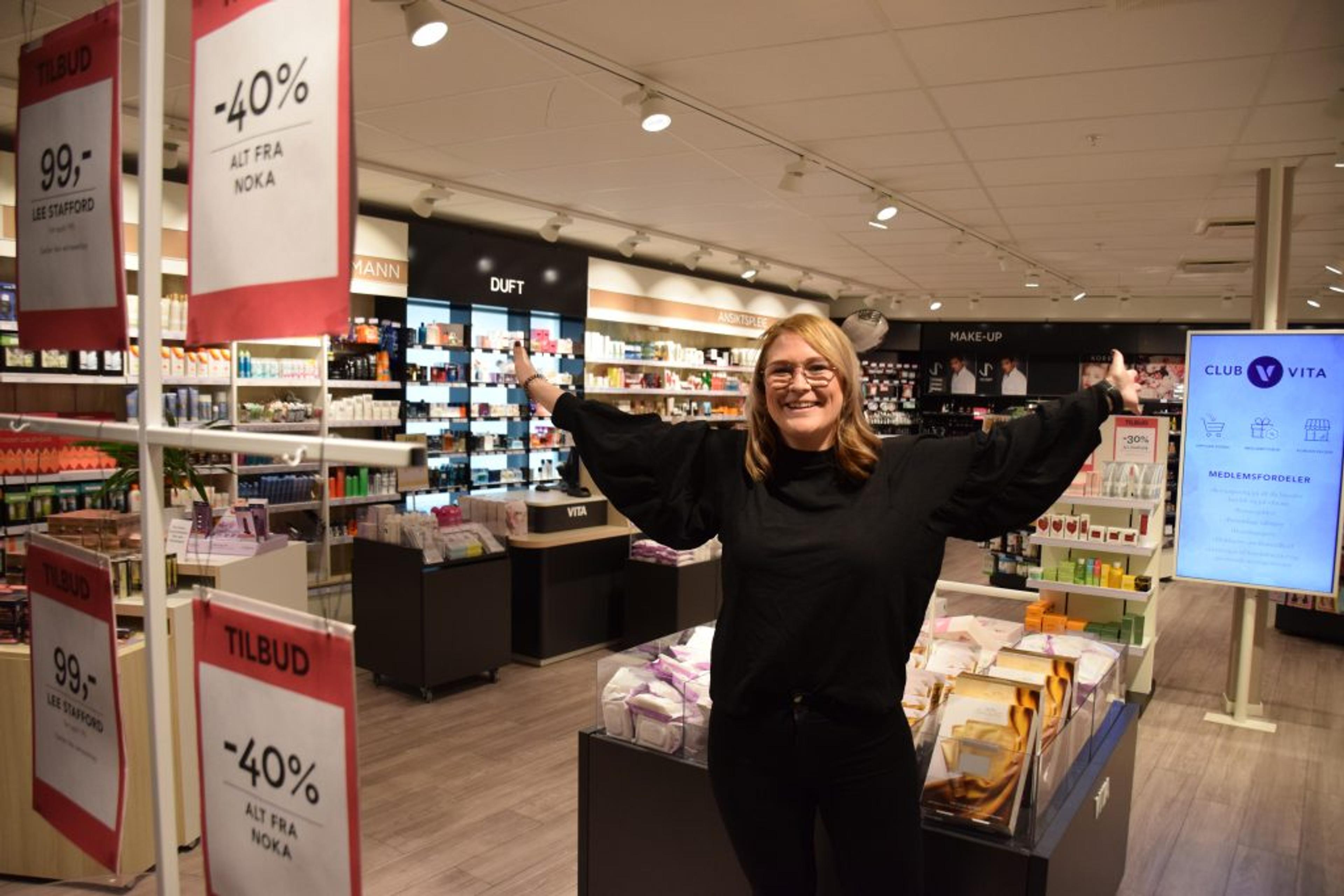 FRA BLÅMANDAG TIL GLA’MANDAG: Connie Pedersen (30) hadde akkurat tatt over drifta av VITA-butikken da konkursen skjedde. Jubelen sto i taket da butikken på Re-torvet ble redda fra konkursen av nye eiere. Foto: Stian Ormestad.
