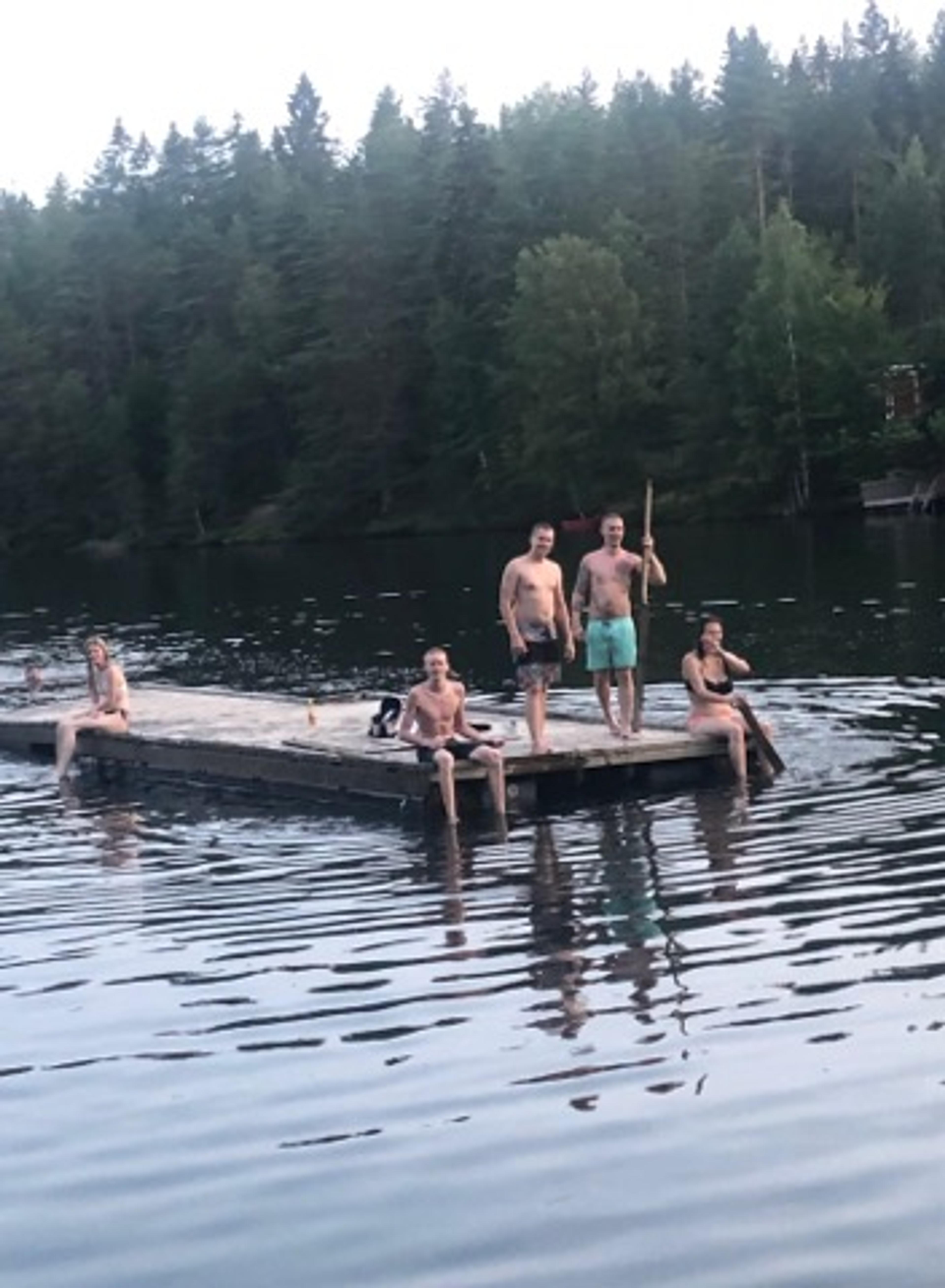 PADLA FLYTEBRYGGA PÅ PLASS: Re-ungdom i sving med å hjelpe vaktmesterteamet i nye Tønsberg med å få flytebrygga på Langevann på plass igjen. Foto: Privat.
