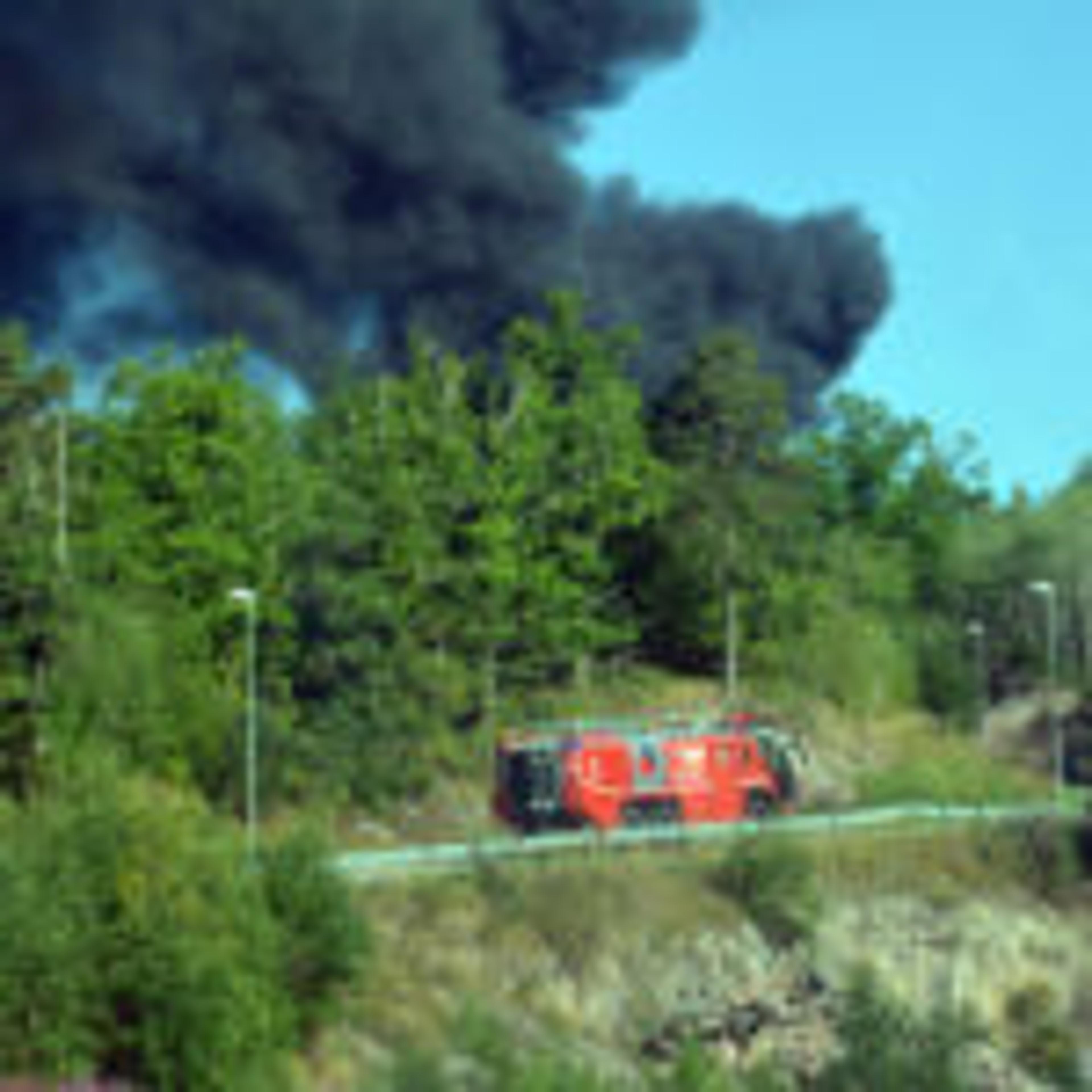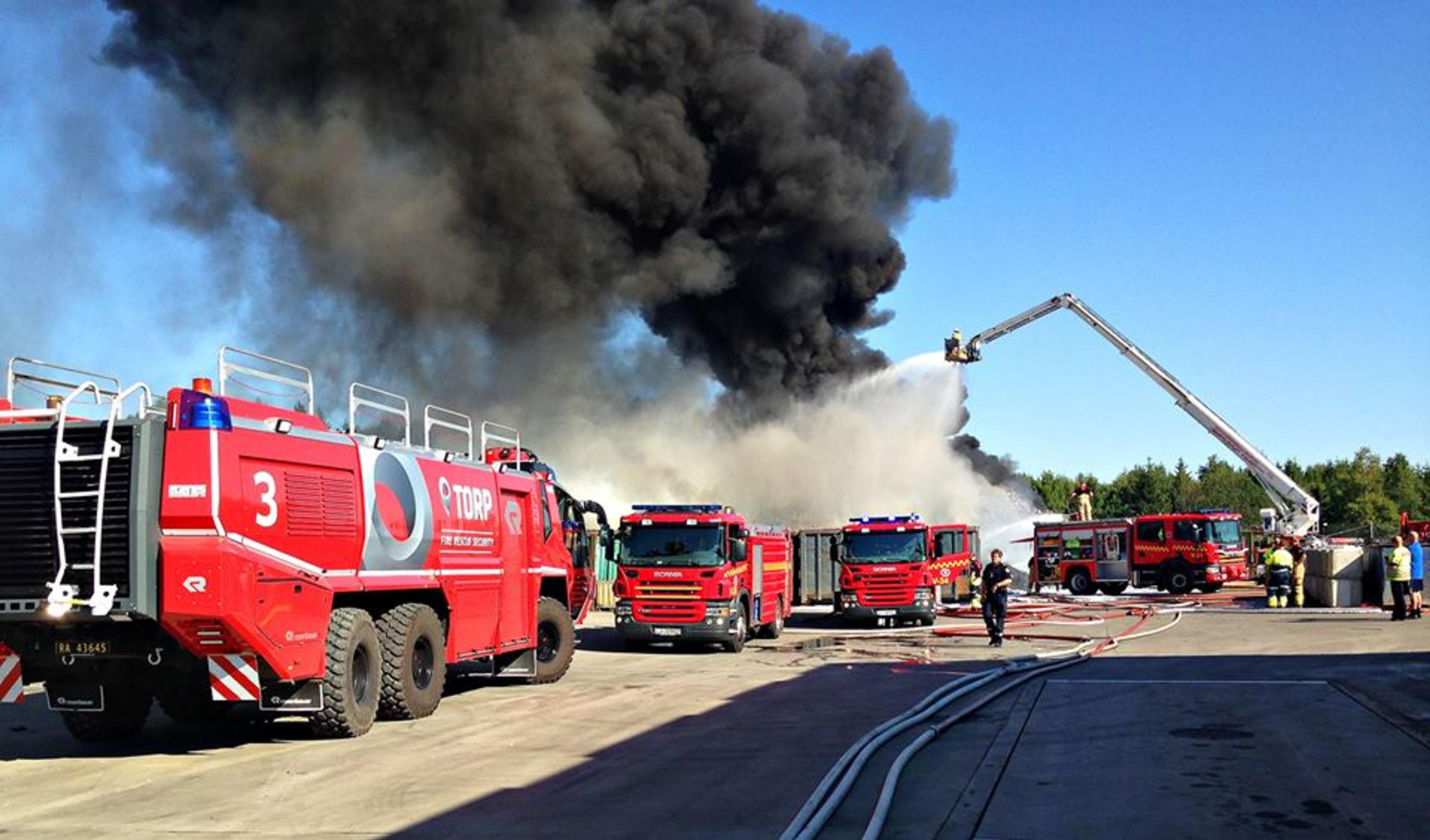 UTRYKNING: Her kommer en av mange brannbiler til Linnestad næringsområde under storbrannen sommeren 2014. Foto: Stian Ormestad.