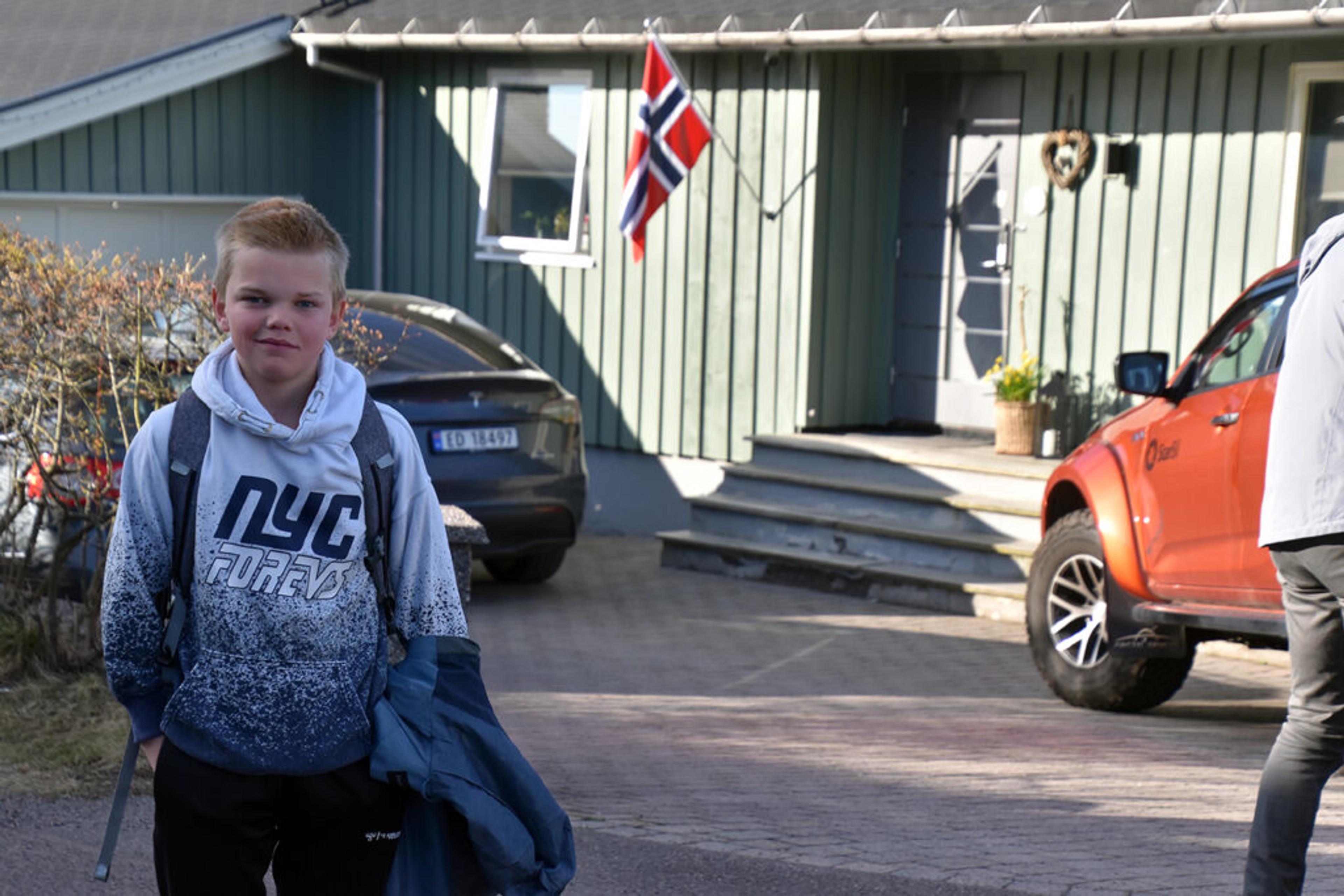 TIL SKOLEN: Olav (12) er en av tre gutter i huset, men halvveis uti morgensendinga måtte han pakke skolesekken og komme seg avgårde. Foto: Stian Ormestad, ReAvisa.