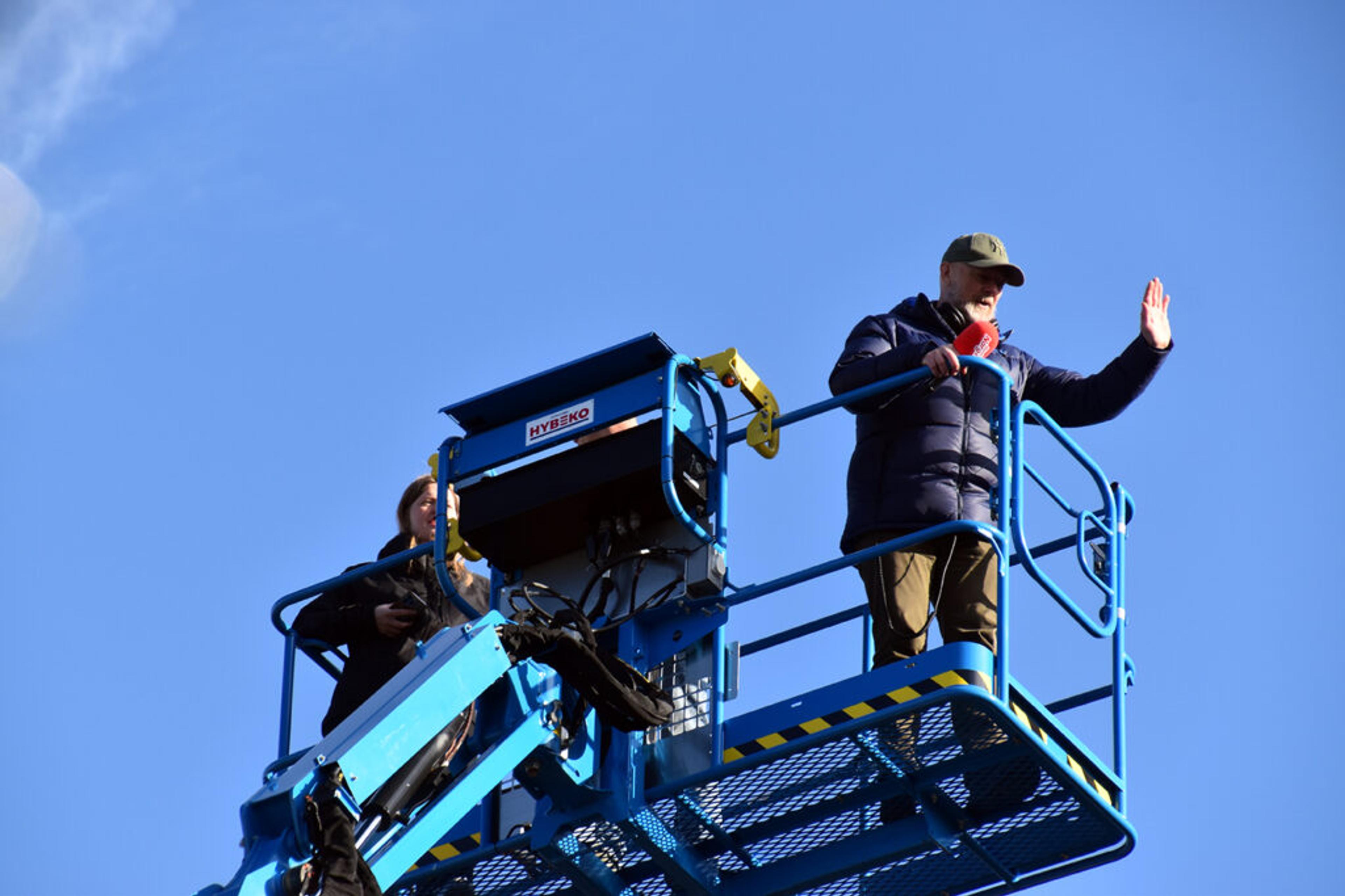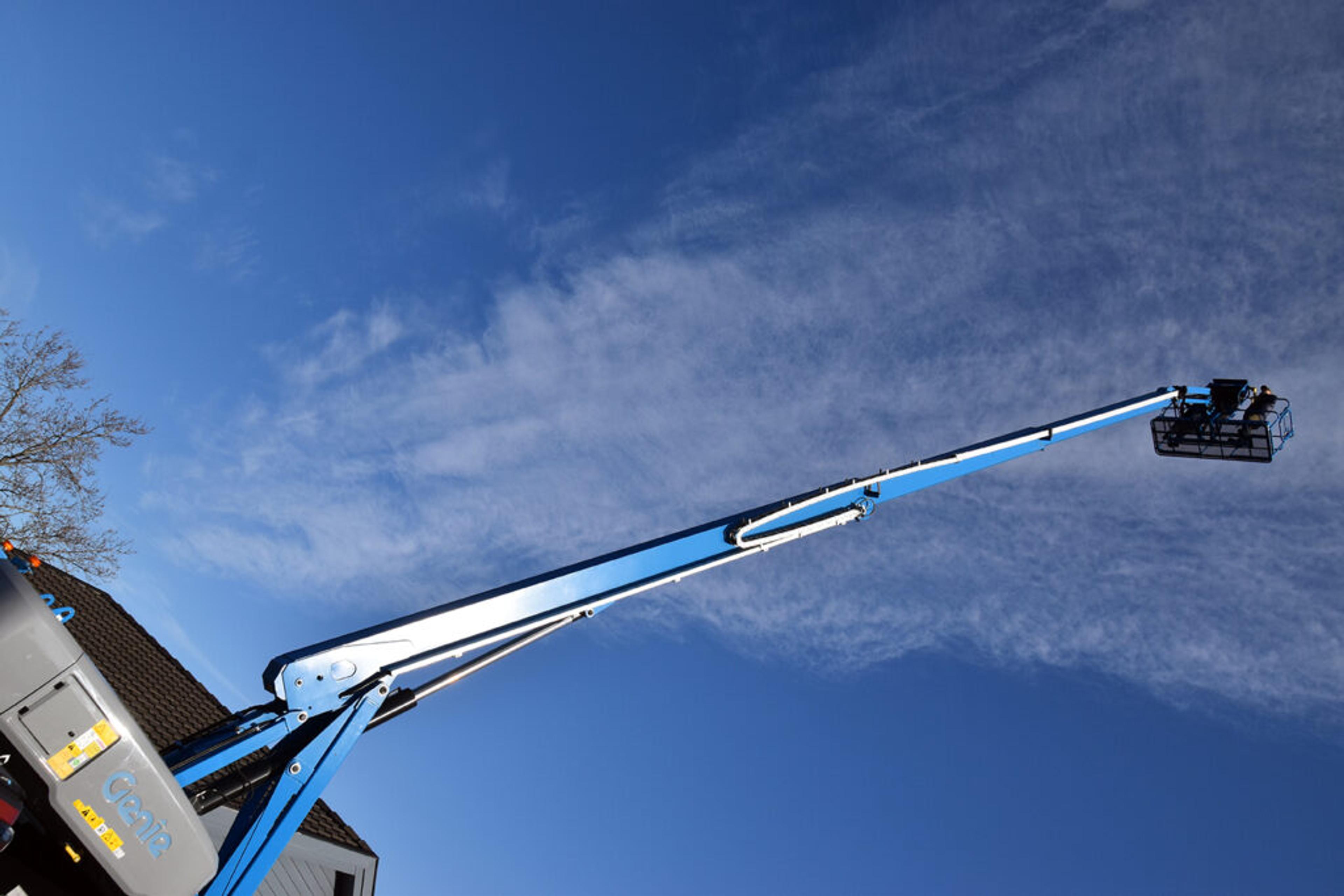 – NYDELIG UTSIKT! 28 meter over bakken ruver han, da Geir Shau rapporter om alt det flotte han får øye på der oppafra. Foto: Stian Ormestad, ReAvisa.