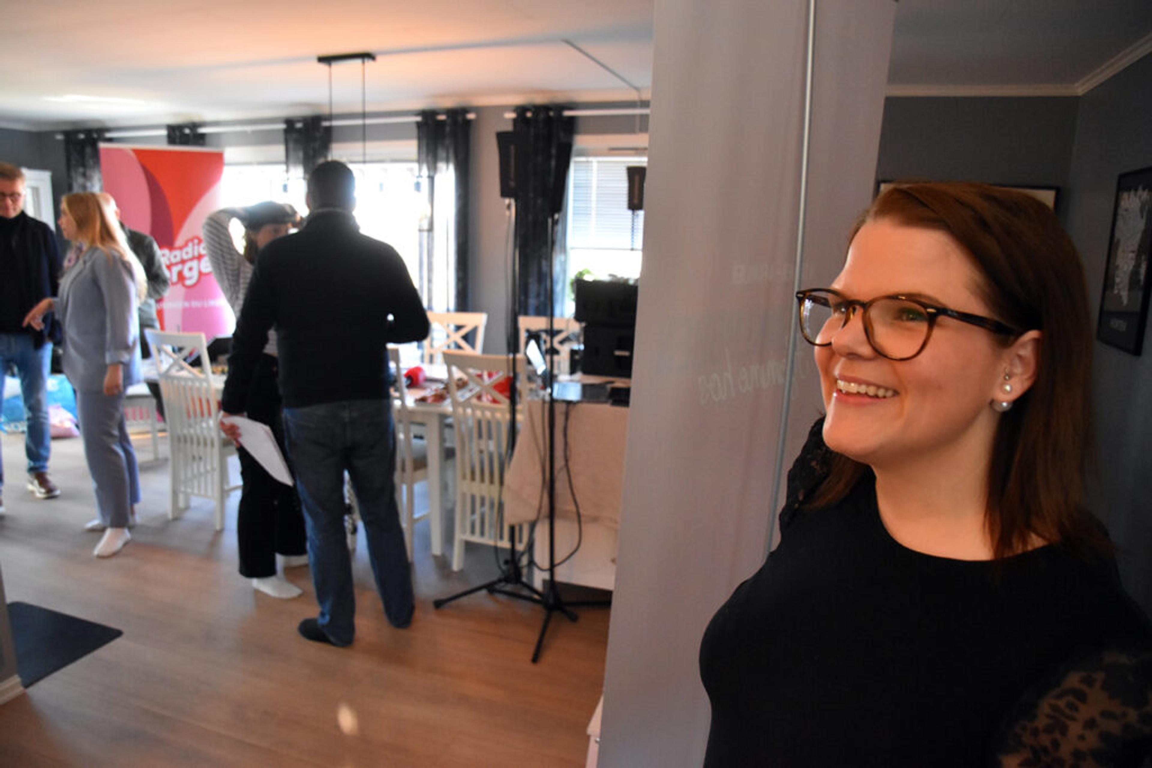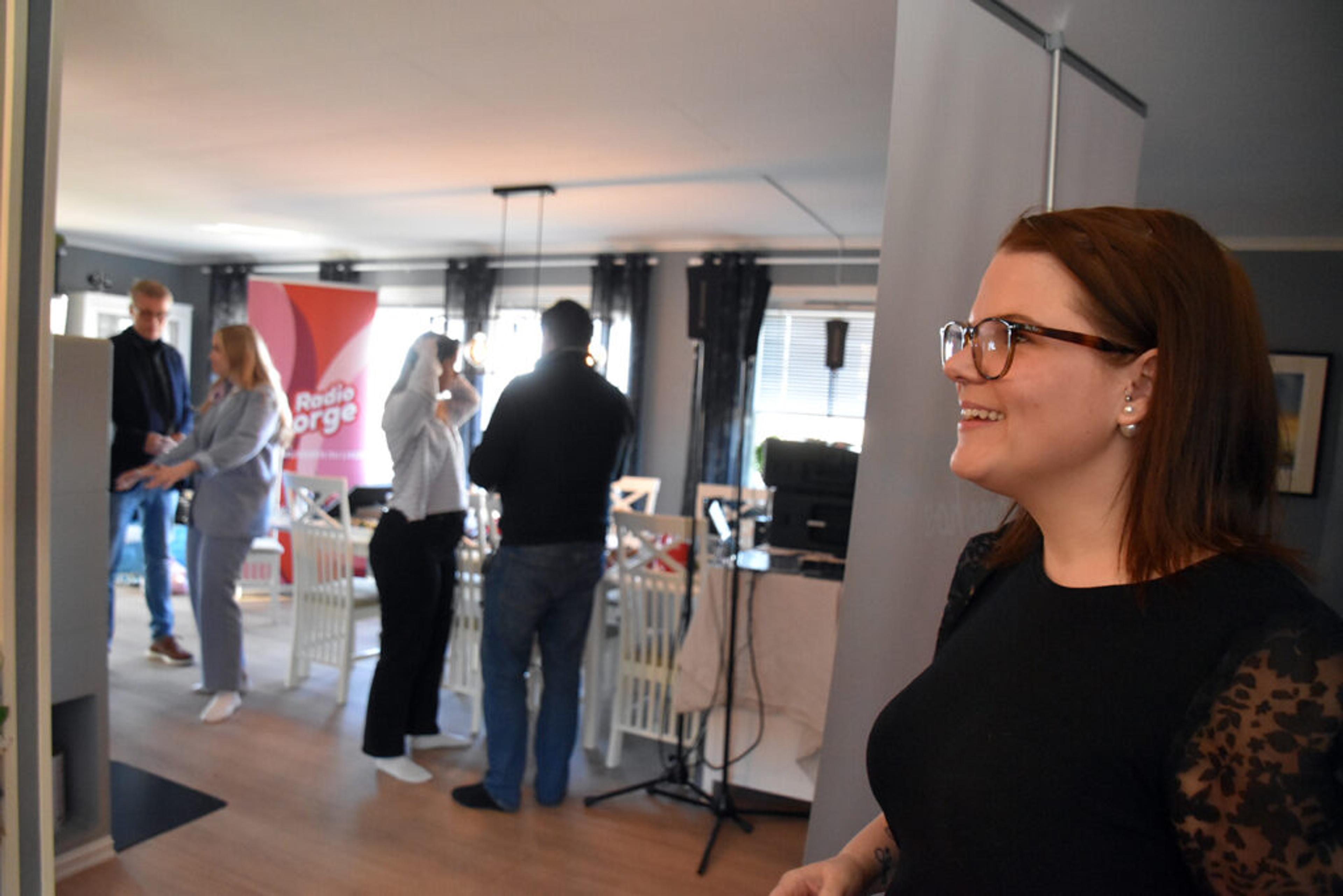 RADIOSTUDIO: Hjemme hos Mari Prosvik (41) og familien på fem innerst i Brekkeåsen i Våle i Re i Vestfold gikk Morgenshowet med Loven & co direkte fra klokka 06.00 til 10.00 i dag, fredag 28. april 2023. Foto: Stian Ormestad, ReAvisa.