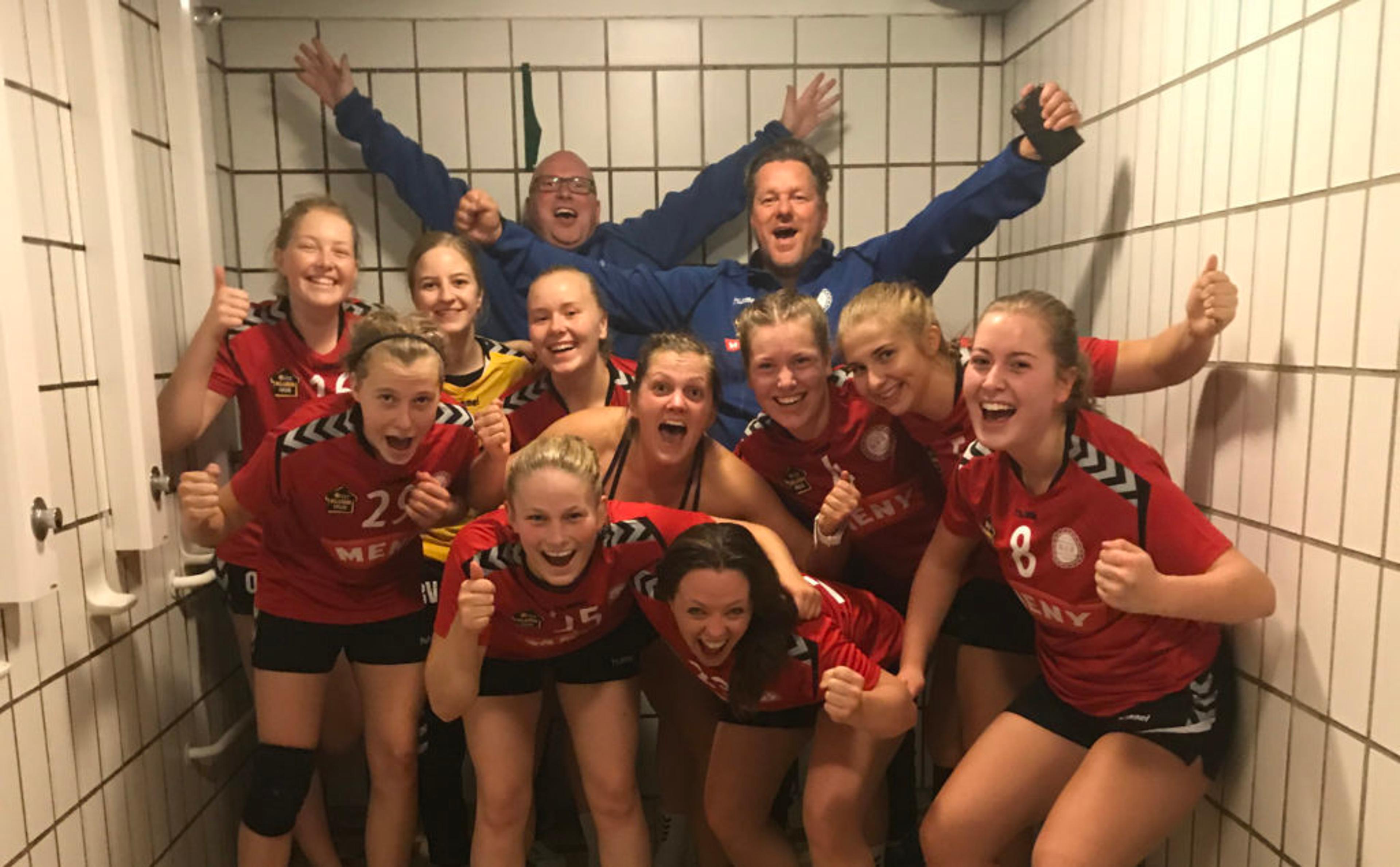 JUBEL: Ramnes-jentene topper tabellen – for anledningen i røde drakter. Dette blir nok en spennende håndballsesong i Ramneshallen! Foto: Privat.