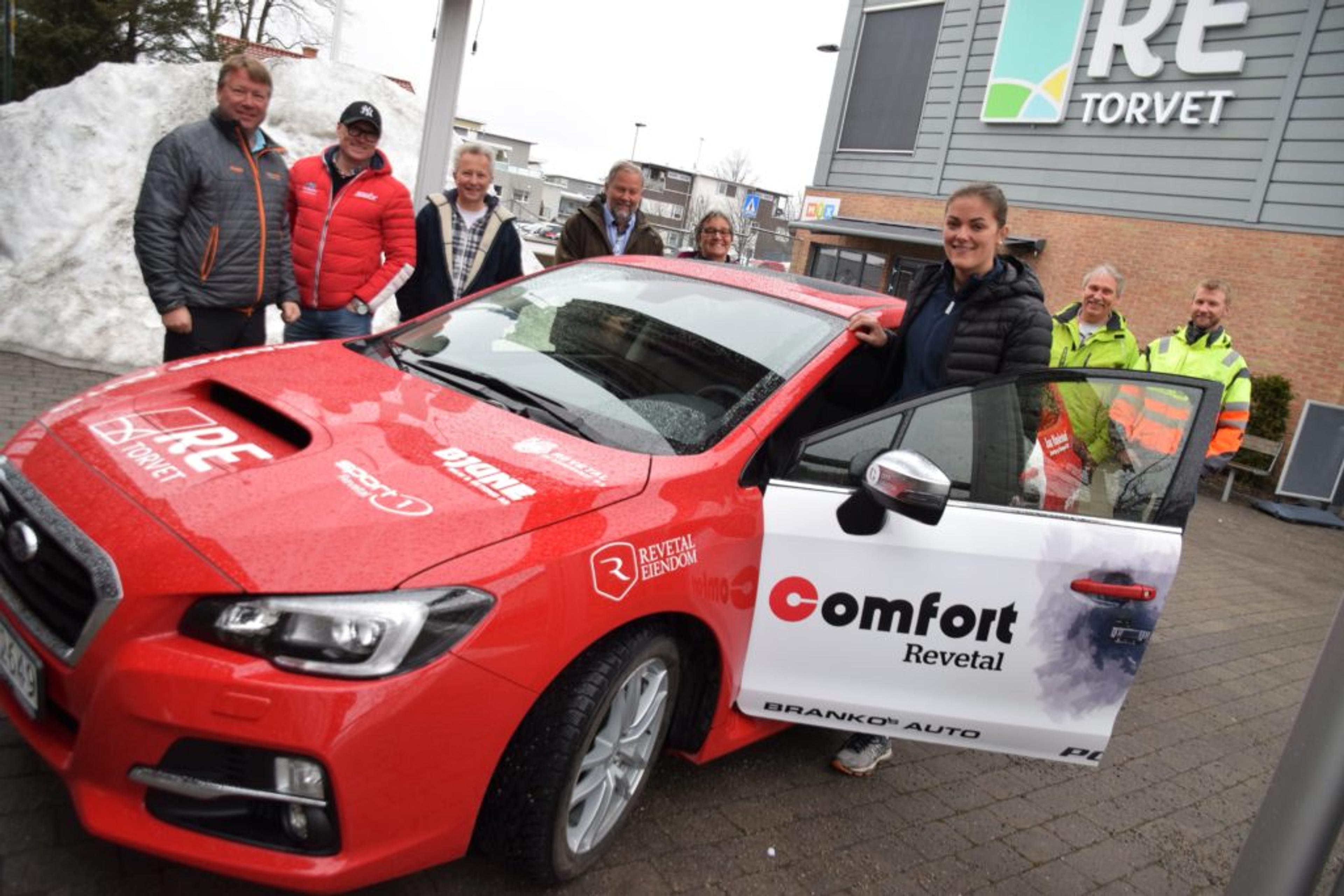 HEIA JEANETTE! OL-håpet Jeanette Hegg Duestad (19) fra Fon får skyss av det lokale næringslivet, fra venstre Anders Gustav Holt, Ditt kontor, Sport 1 Revetal, Ditt klubbhus og Ditt klubbvann, Morten Daneby, Brankos auto, Jan Arild Gjersøe, Re-El, Georg Gran, Revetal eiendom, Bergljot Woll, Gran VVS, Magne Pedersen, Revetal glasservice, og Harald Bjerkesti Løken, Kjell Foss AS. Representanter for Bjune betong, Power Revetal, Jan Haslestad AS og Ditt Grafisk – som har foliert opp bilen, var ikke tilstedet under overrekkelsen mandag 9. april. Foto: Stian Ormestad.