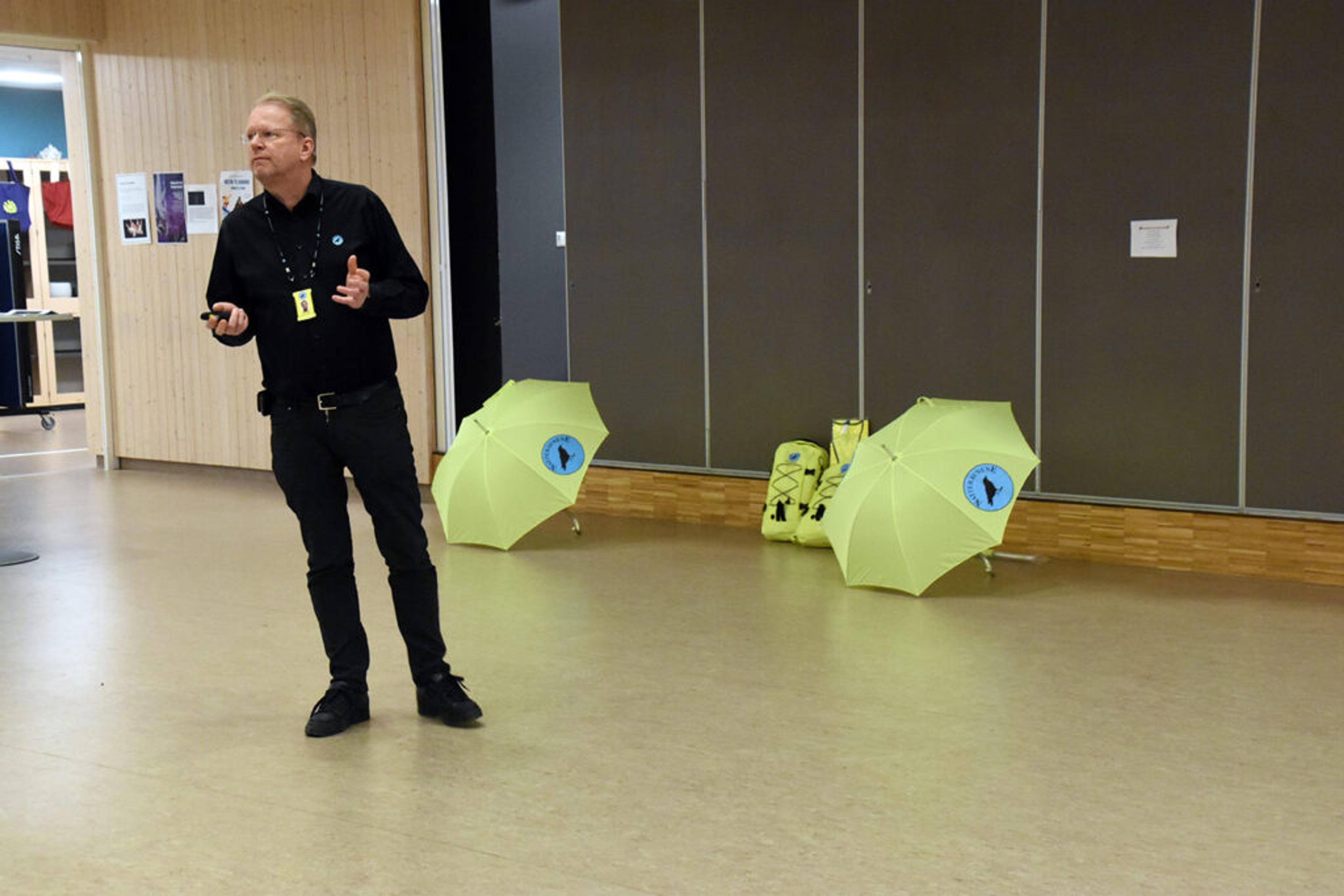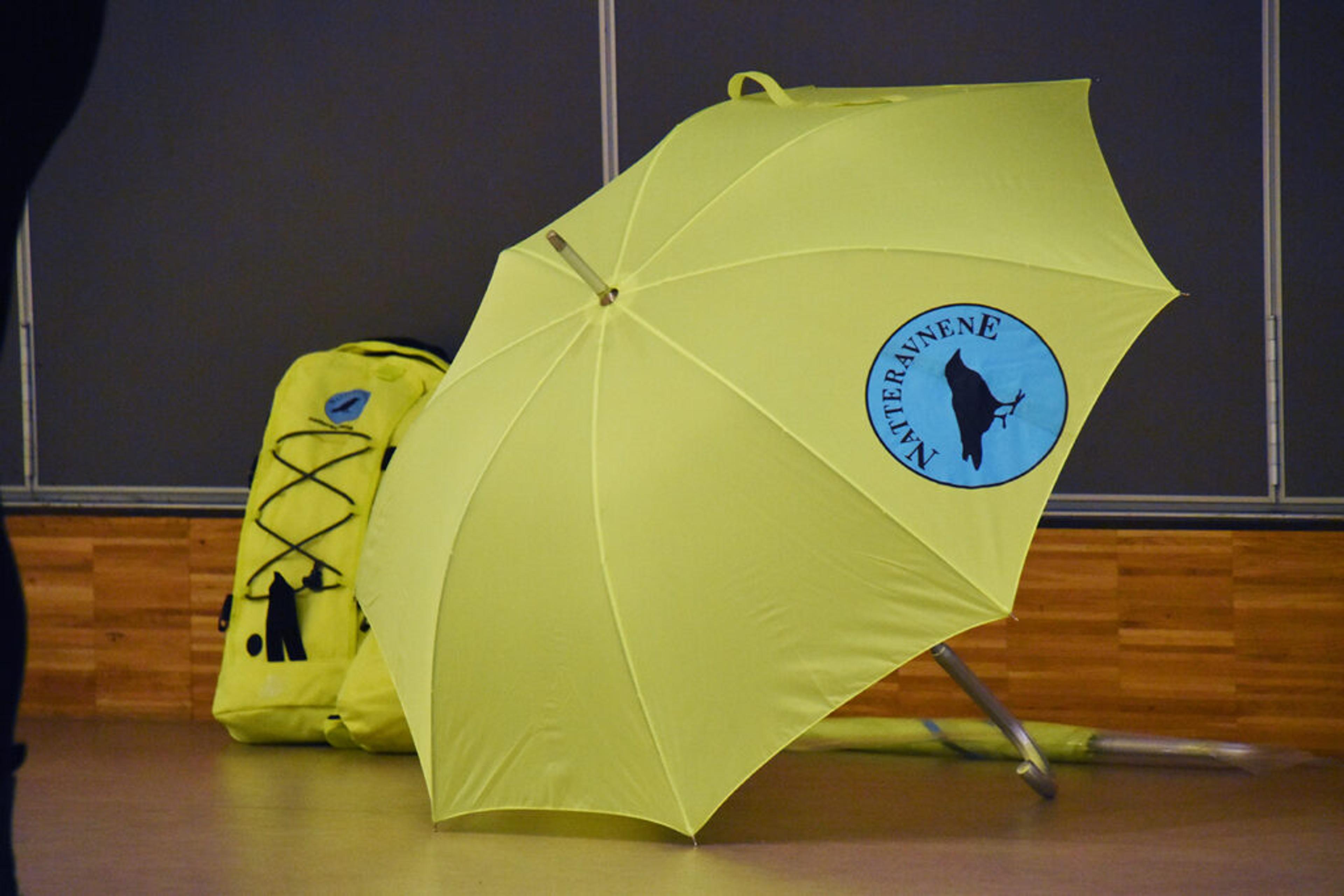 NATTERAVN-STÆSJ: Gule vester og gule paraplyer til de foreløpig 17 frivillige som har meldt seg til Natteravn-tjeneste her i Re. Foto: Stian Ormestad, ReAvia