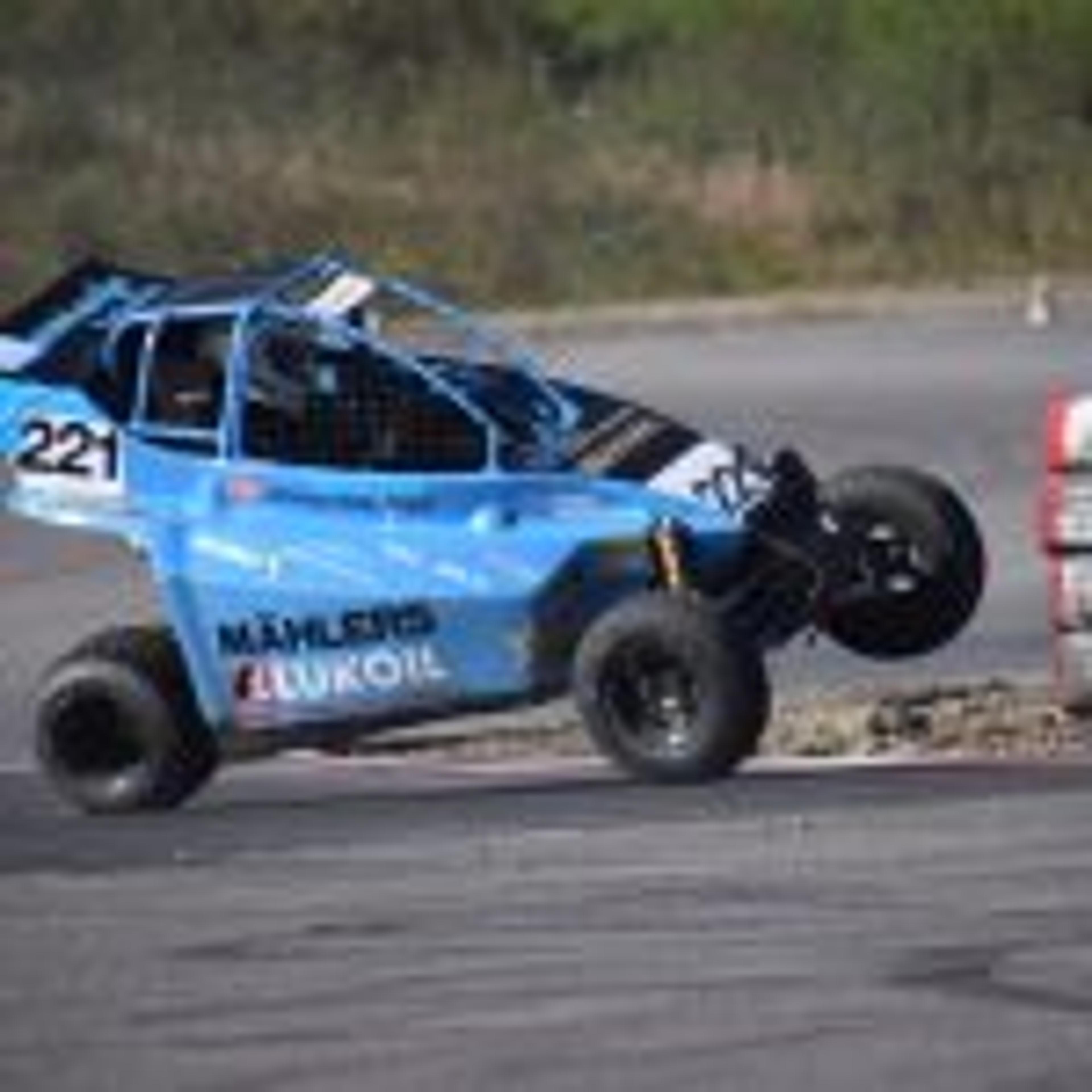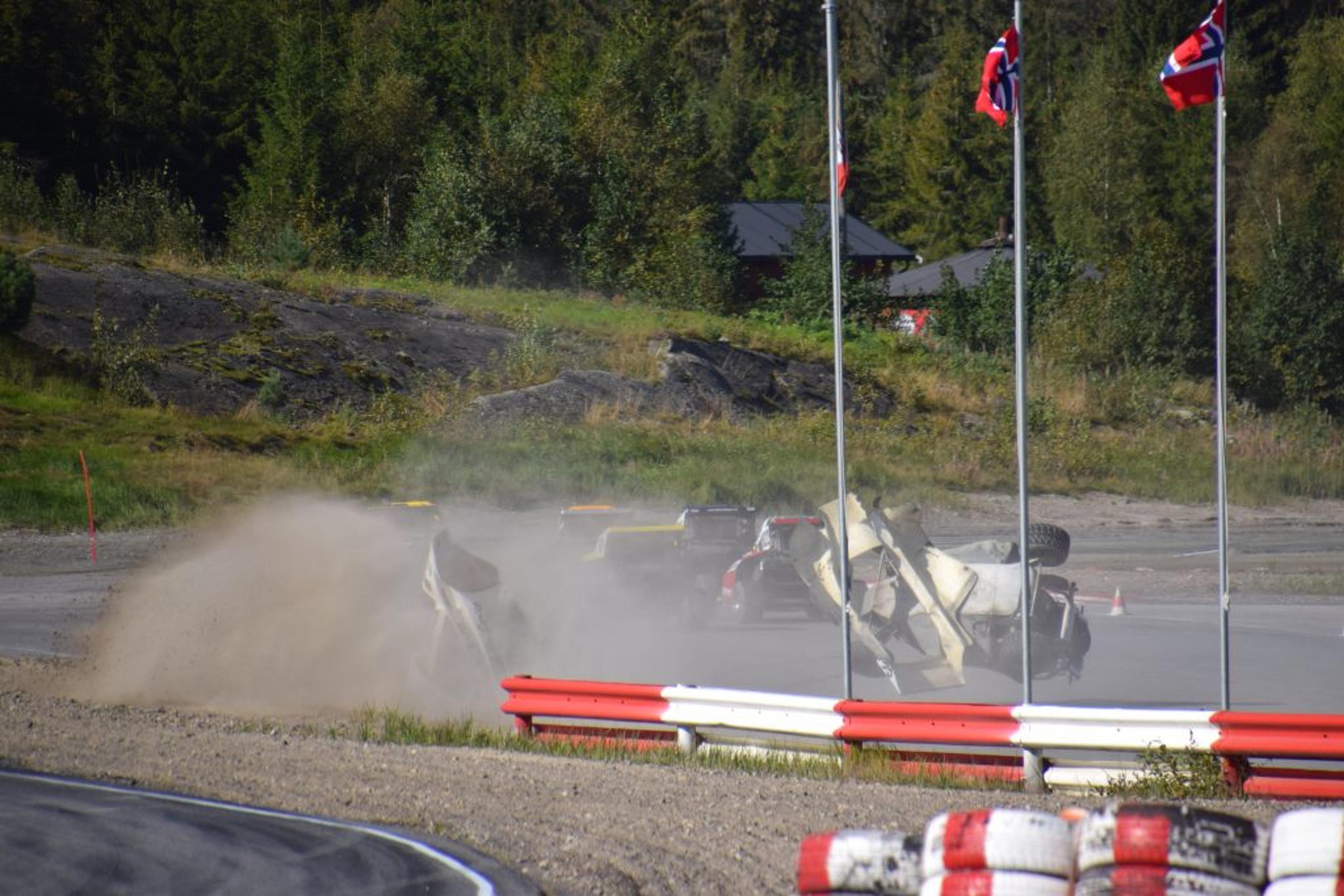 KRASJ: Halvard Grytnes fra Undrumsdal havna midt inni en massekrasj i en av startene på NM-runden på Grenland motorsportsenter for to år siden. Det gikk bra med Halvard og alle de involverte, som det oftest gjør. Sjøl om det kan være mye dramatikk, er sikkerheten alltid i høysete. Arkivfoto: Stian Ormestad.
