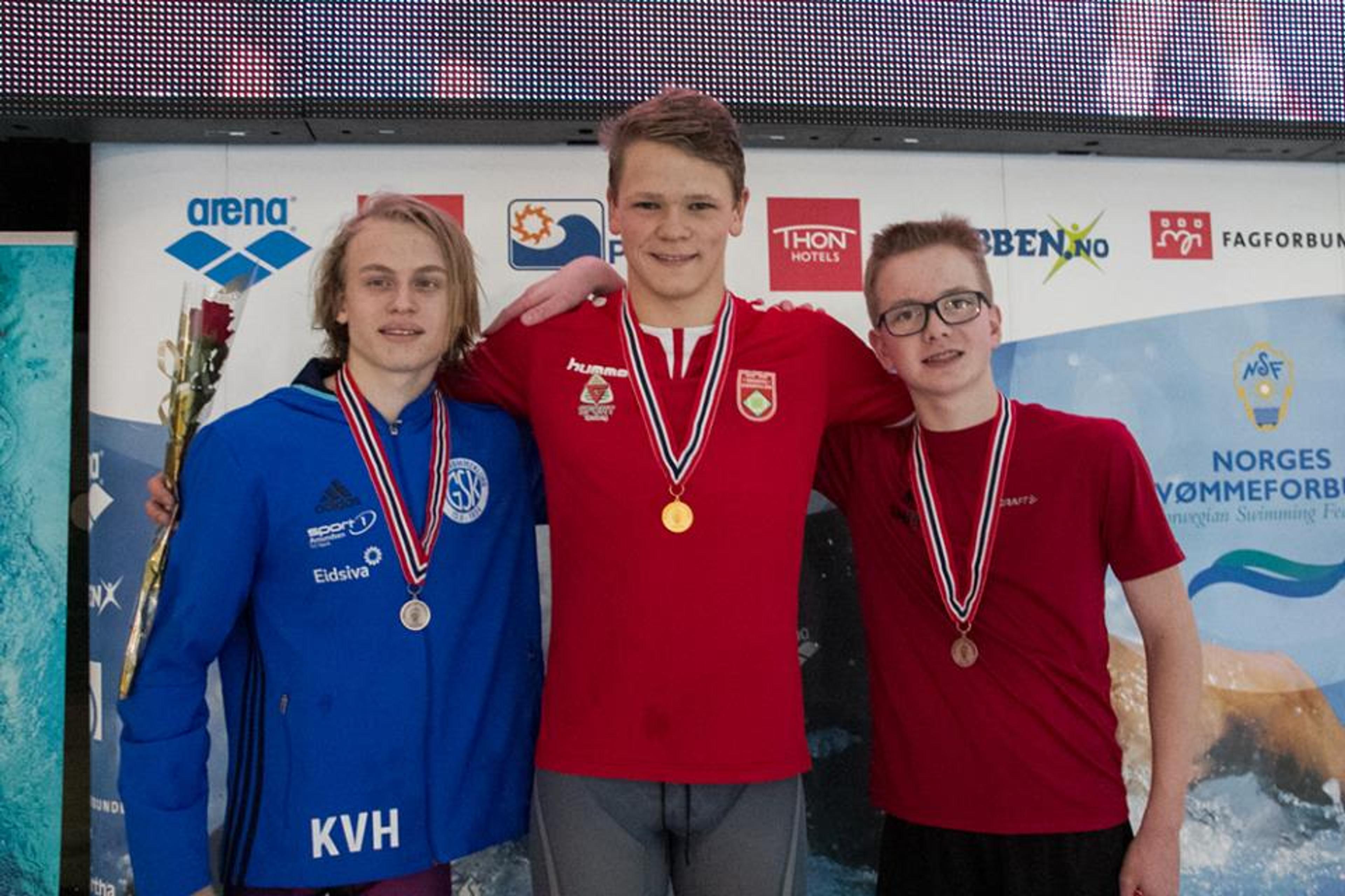 ELITEN: Re-gutten Fredik Solberg (Tønsberg SK) satte sammen med Kristoffer Voldengen Hansen (Gjøvik SK) og Gabriel Steen (Vestbyen Trondheim) nye rekorder i helgas junior-NM i Kristiansand. Fredrik ser vi i midten. Foto: Norges Svømmeforbund.