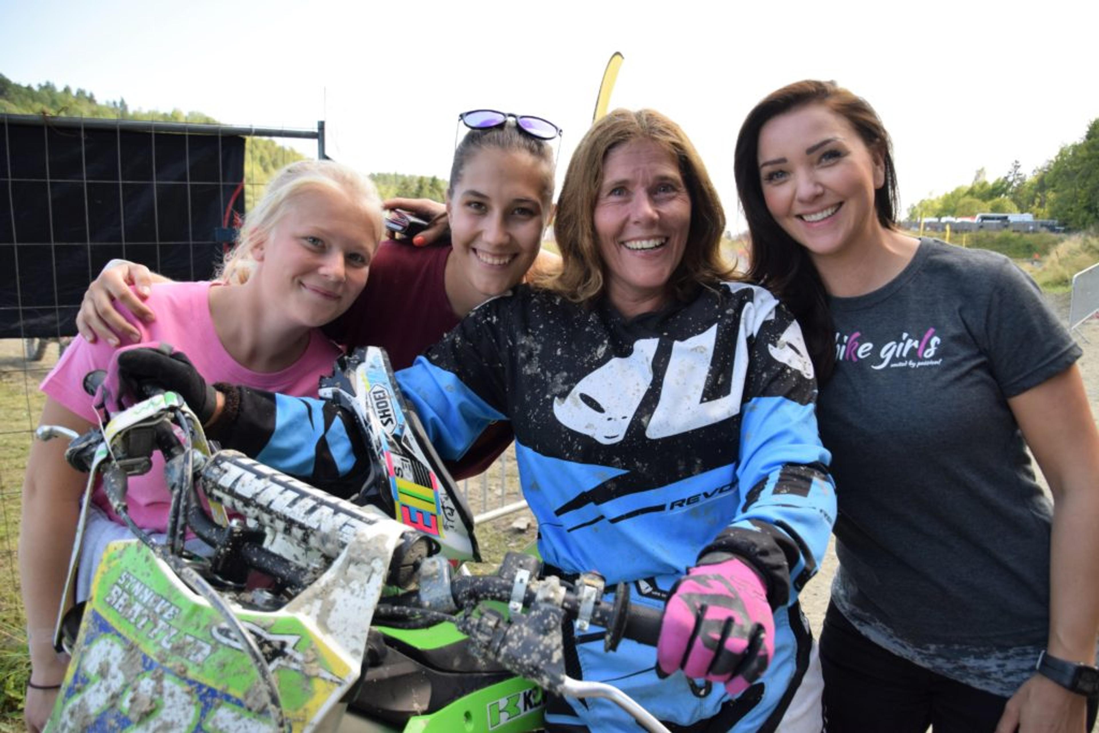 JENTER I FARTA: Synnøve Brattlid (54) fra Undrumsdal blir heia inn etter sitt heat av Anine Olsen (15), Andrine Olstad (20) og Zandra Norum (34). De er fire av hele 88 medlemmer i teamet «Dirt bike girls». Foto: Stian Ormestad.