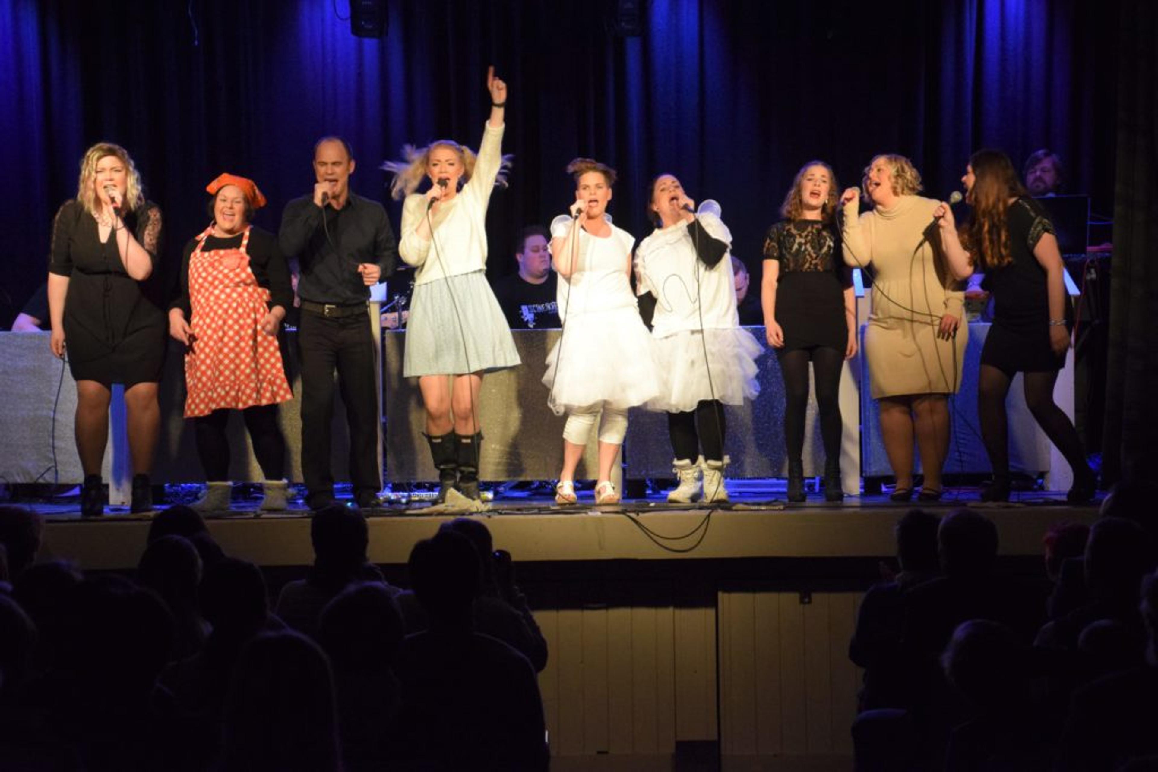 SCENESKREKK: Revygjengen består av, mer eller mindre fra venstre: Anniken Thuve Ivarsson, Monica Rehn-Eriksen, Christian Østmann, Marthine Huseby Simonsen, Marit Prosvik Aarvåg, Lill Farstad, Frida Moland, Renate Holm Haugelien og Birgit Moe Holm. Revybandet består av Fredrik Bertelsen, Ole Bendik Kviler, Vegard Andre Skaug, Bengt Kenneth Ivarsson og Ole Henrik Fjeld. Foto: Stian Ormestad.