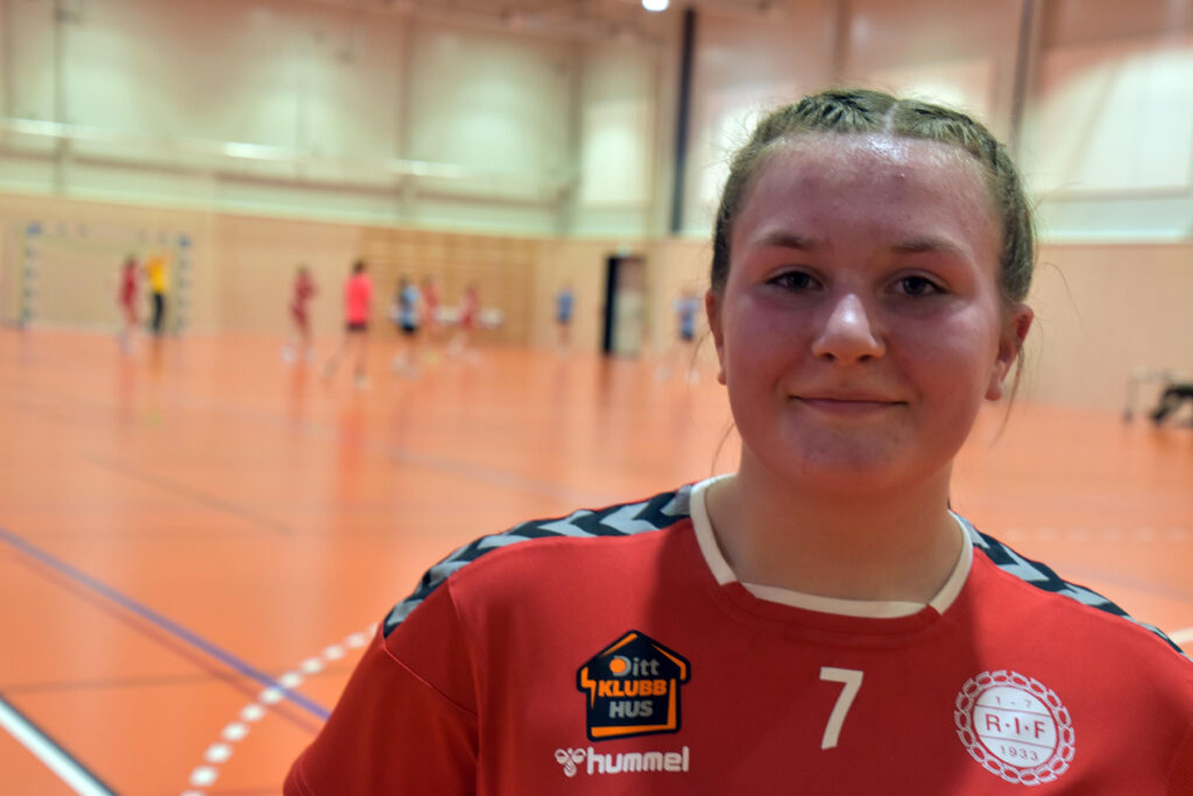 DAGENS HELT: – Litt tom, men veldig glad, beskriver Nora Hallenstvedt-Andersen (13) følelsen av å redde Ramnes J2008 til A-sluttspillet i Slottsfjellcup 2008. Det beste med håndball er lagspillet, så hun deler all ære med resten av det unge lovende Ramnes-laget. Foto: Stian Ormestad.