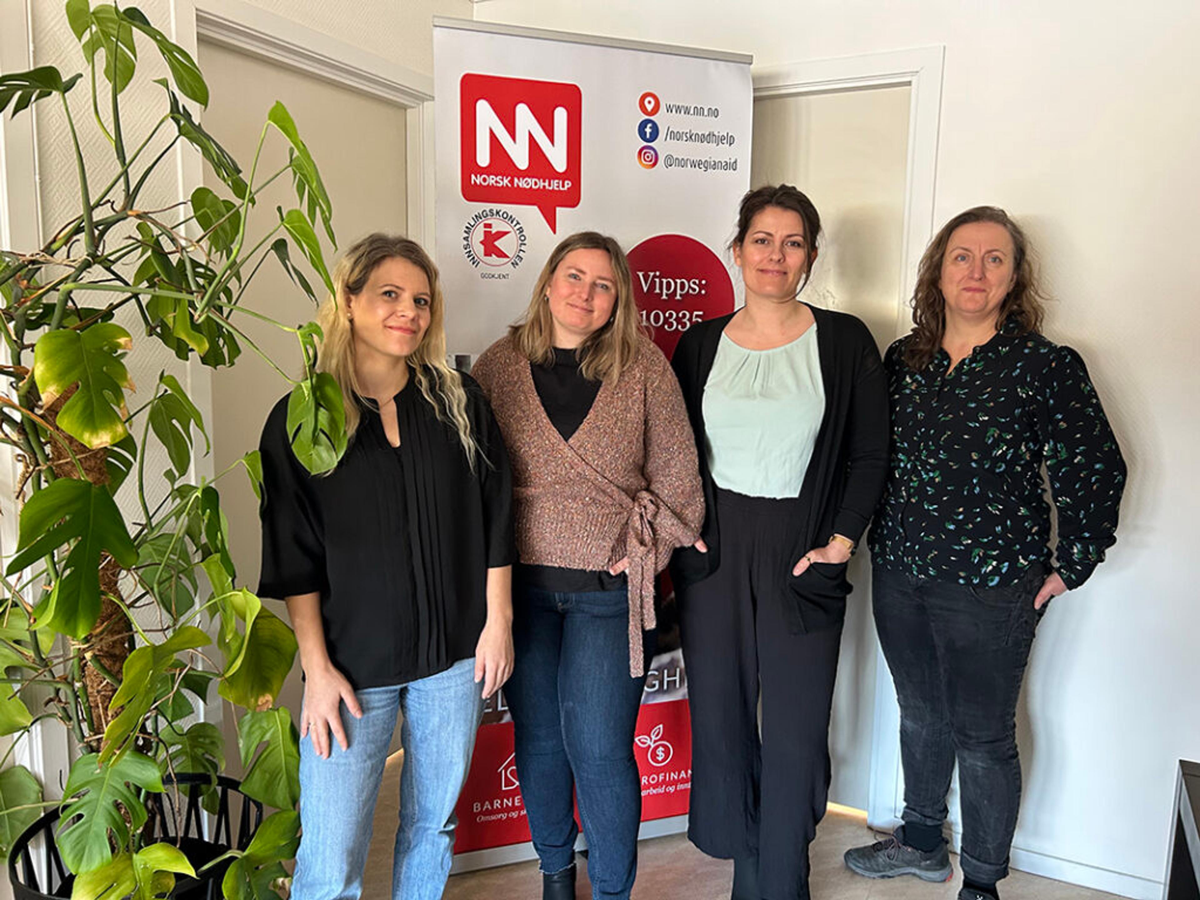 NORSK NØDHJELP: Sunniva Straand Rørvik, Helene Mo Kaarby, Charlotte Grette Osmundsen og Renate Heggernes Bjørnsund jobber for Norsk Nødhjelp fra hovedkontoret langs Ramnesveien. Foto: Privat.