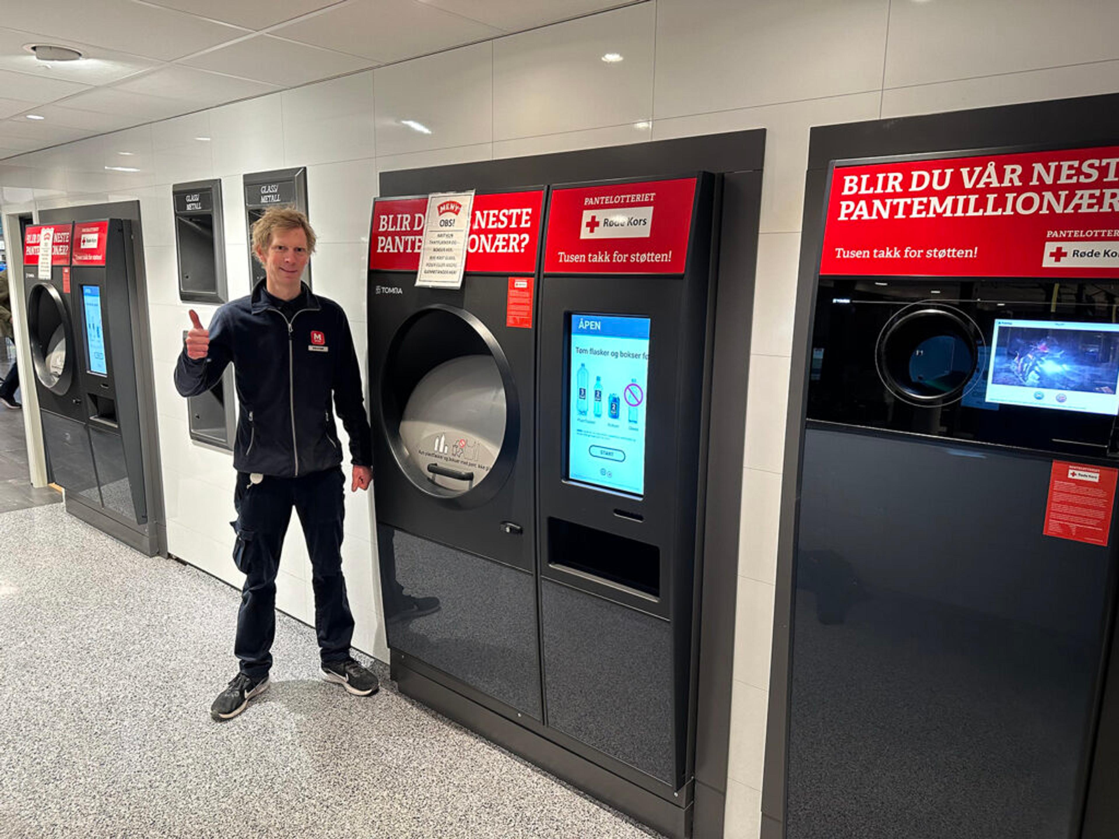 NYE OG MANGE MASKINER: Bendik Pedersen på Meny Revetal er en av flere ansatte om i fjor tok imot over to millioner tomme bokser og flasker. Det er ny rekord, med god margin. Foto: Meny.