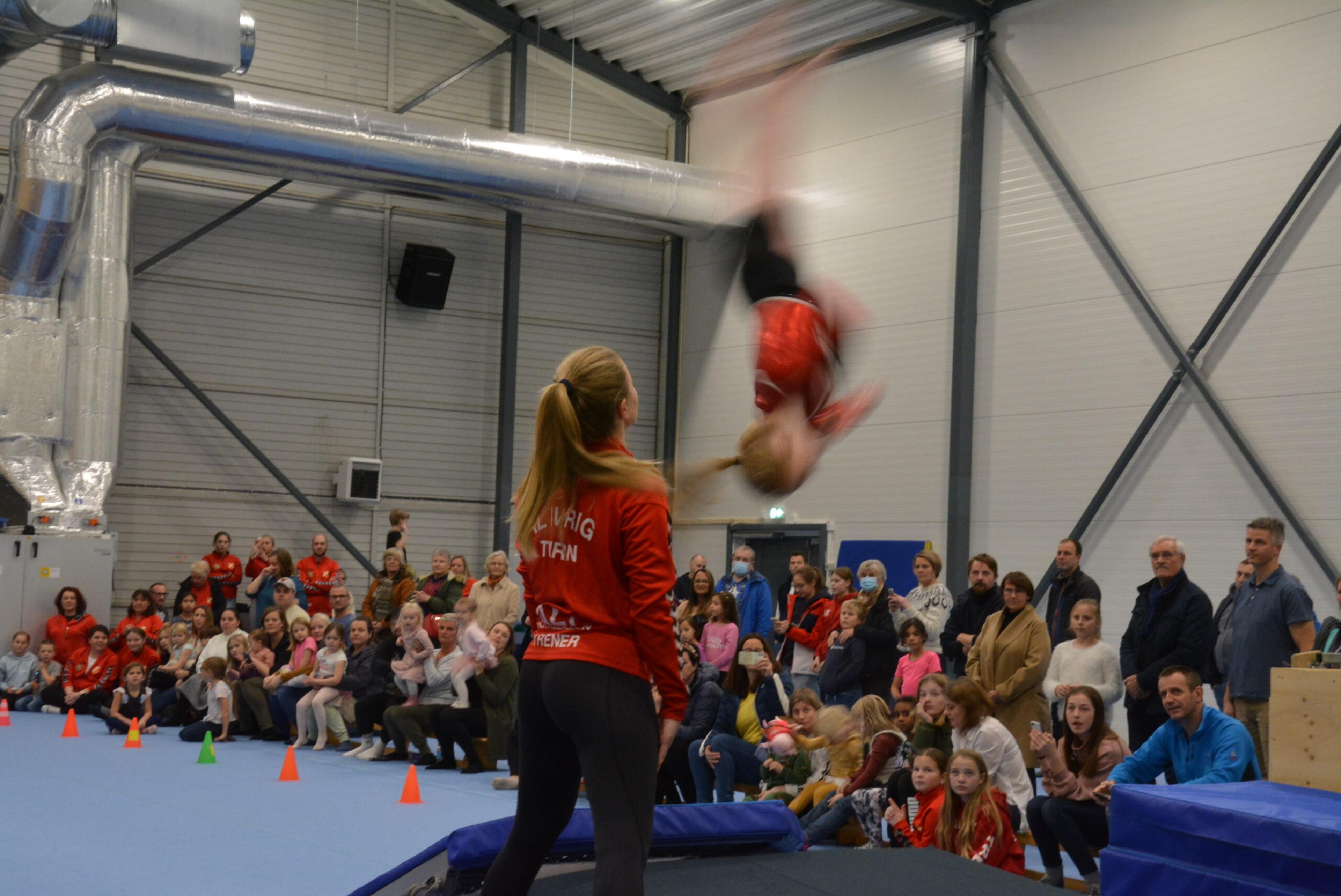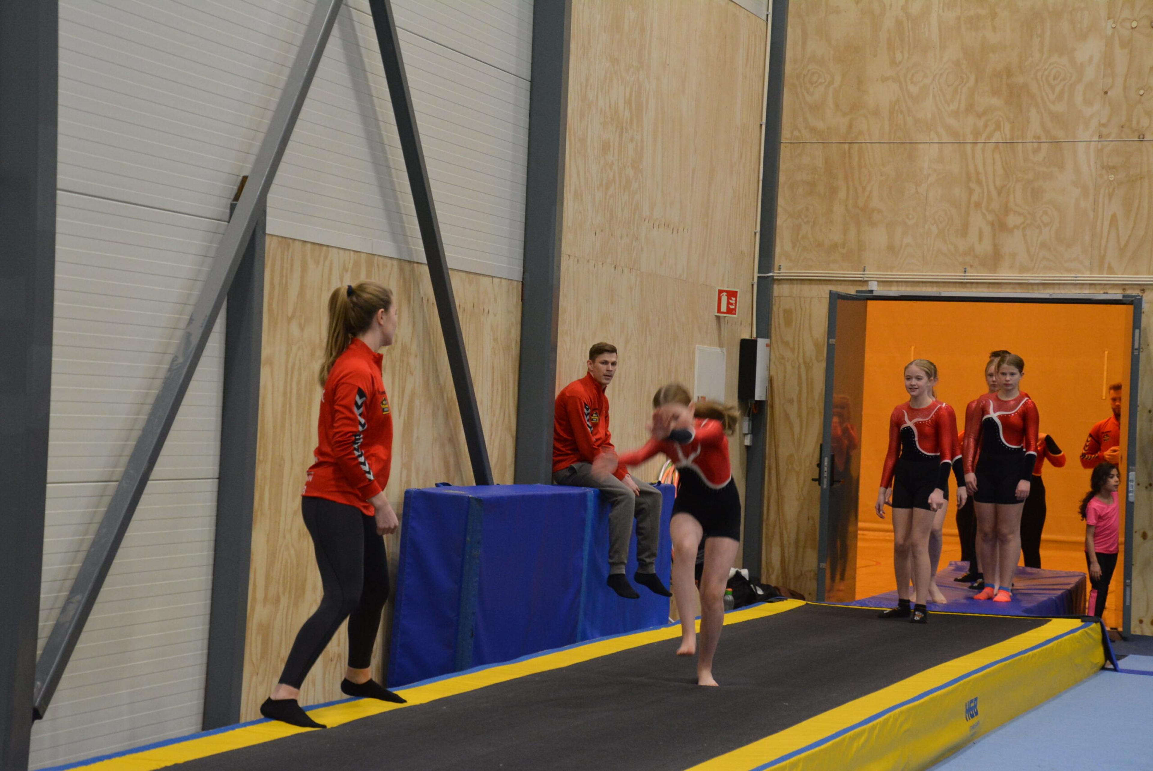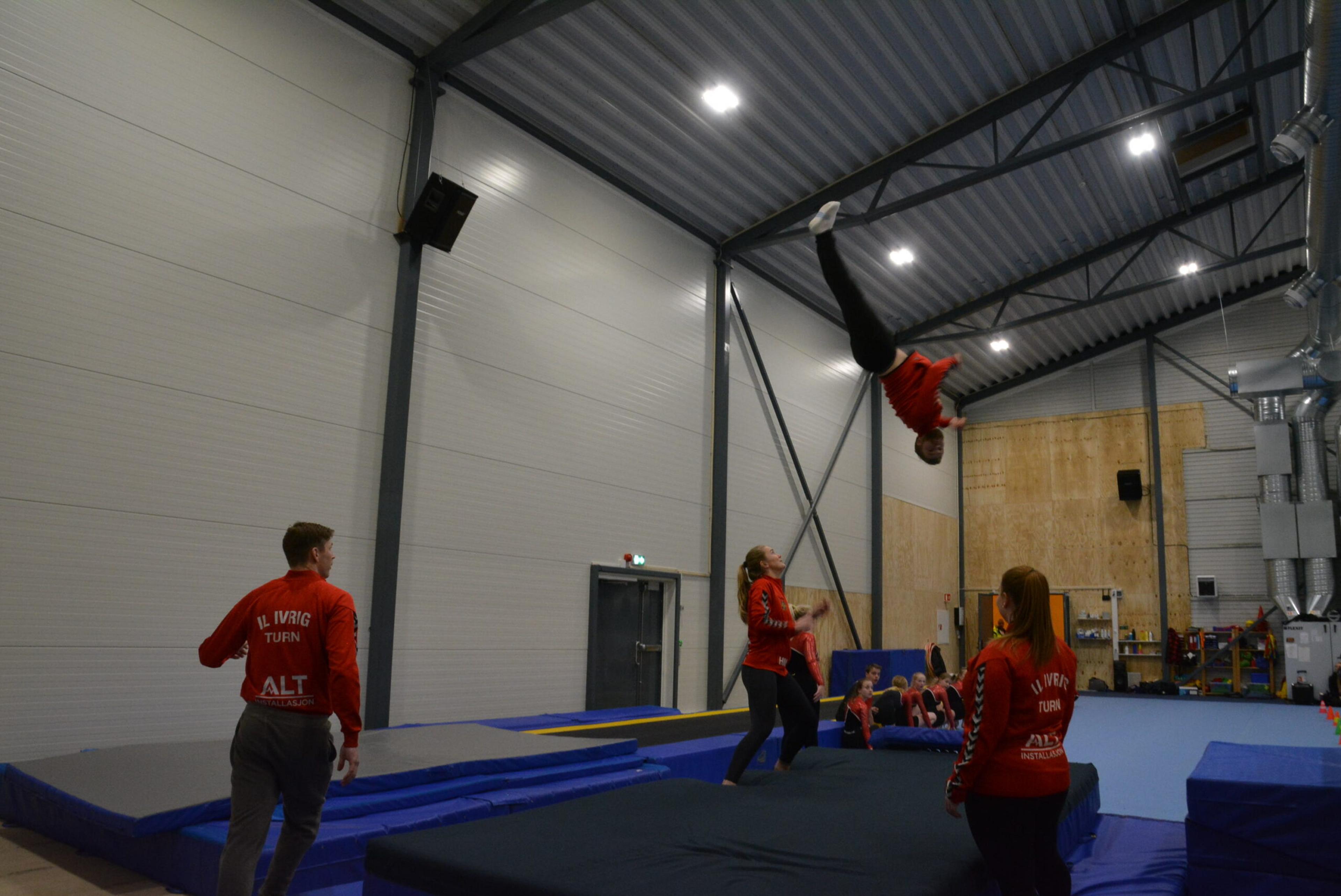 ÅPNINGSSHOW: Tirsdag kveld 23. november 2021 var det åpning av ny turnhall i Våle. Her ser vi ivrige turnere, her med en salto. Foto: Lovis Eggum Wallberg.