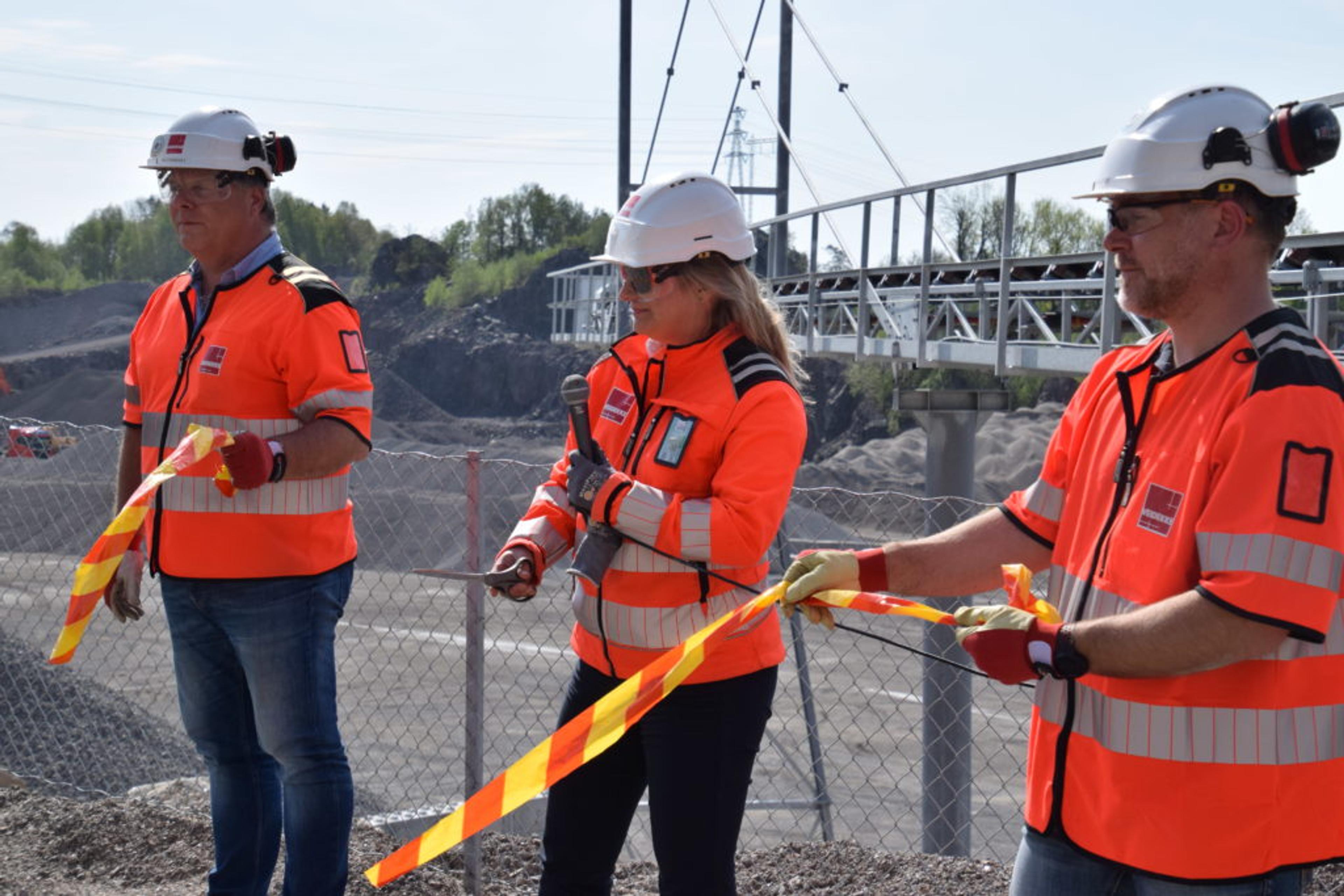 SNORKLIPP: Catharina Bjerke, administrerende direktør i Veidekke industri, klipper snora for nyåpningen av Freste pukkverk. Foto: Stian Ormestad.