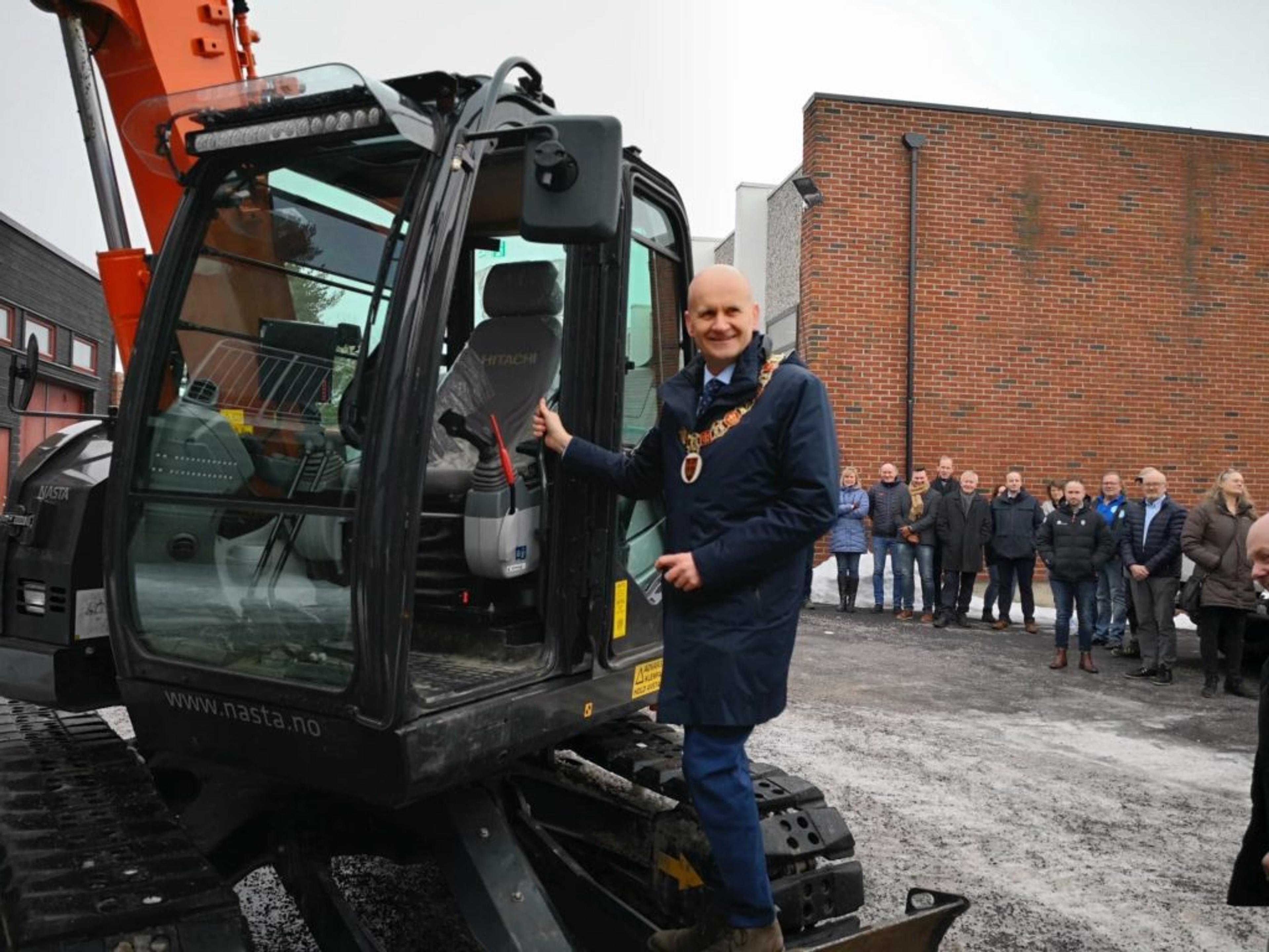 Det nye anleggsbygget inneholder et stort verksted med to porter og stor nok høyde til å ta inn gravemaskiner. Inne i verkstedet er det løftebukk.