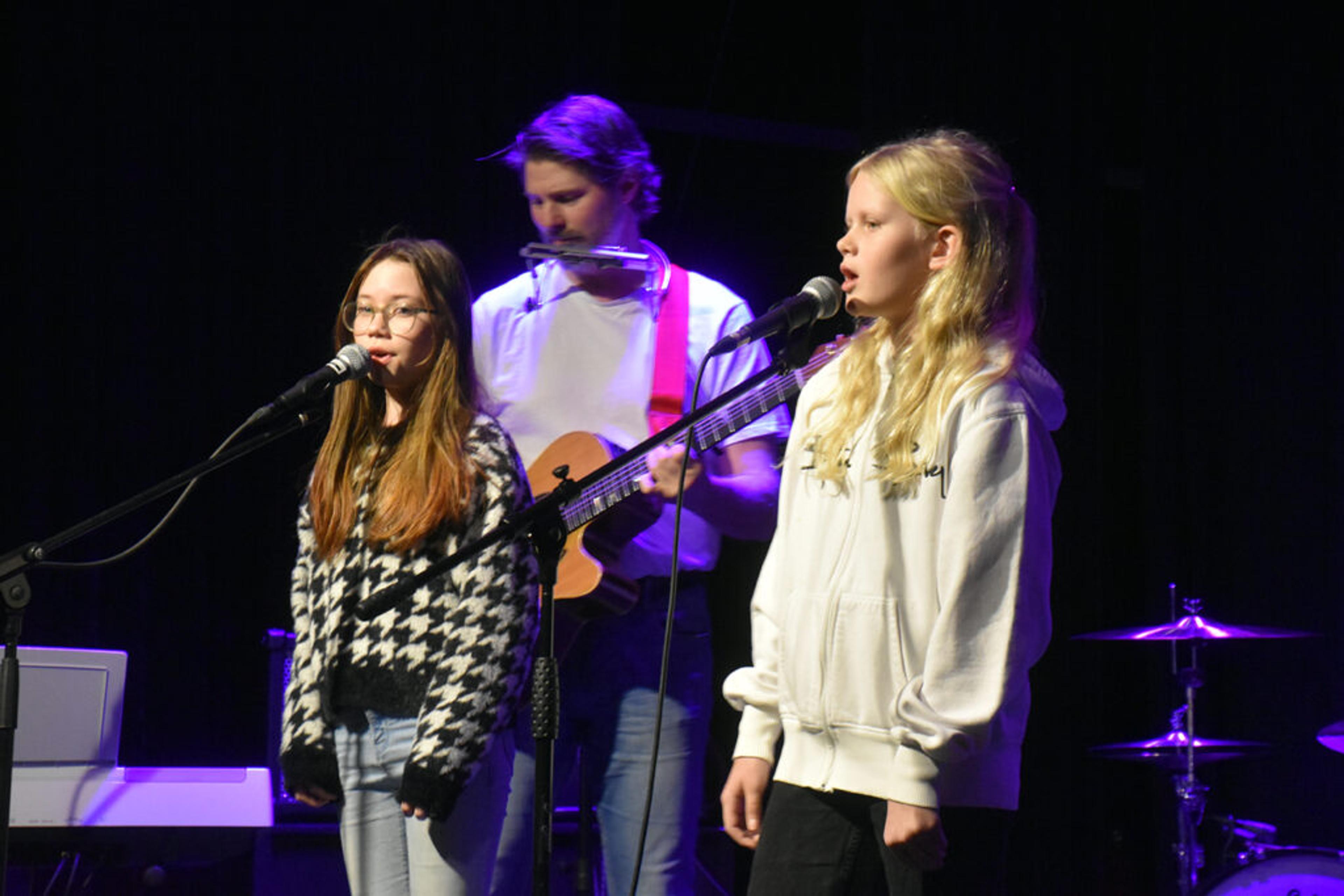 UNGE TALENTER: Maja Larssen Østlie (10) og Hillevi Maria Vettestad Olsen (10), sammen med lærer og kulturildsjel Thor Morten Hansen på gitar og munnspill. Foto: Stian Ormestad, ReAvisa.