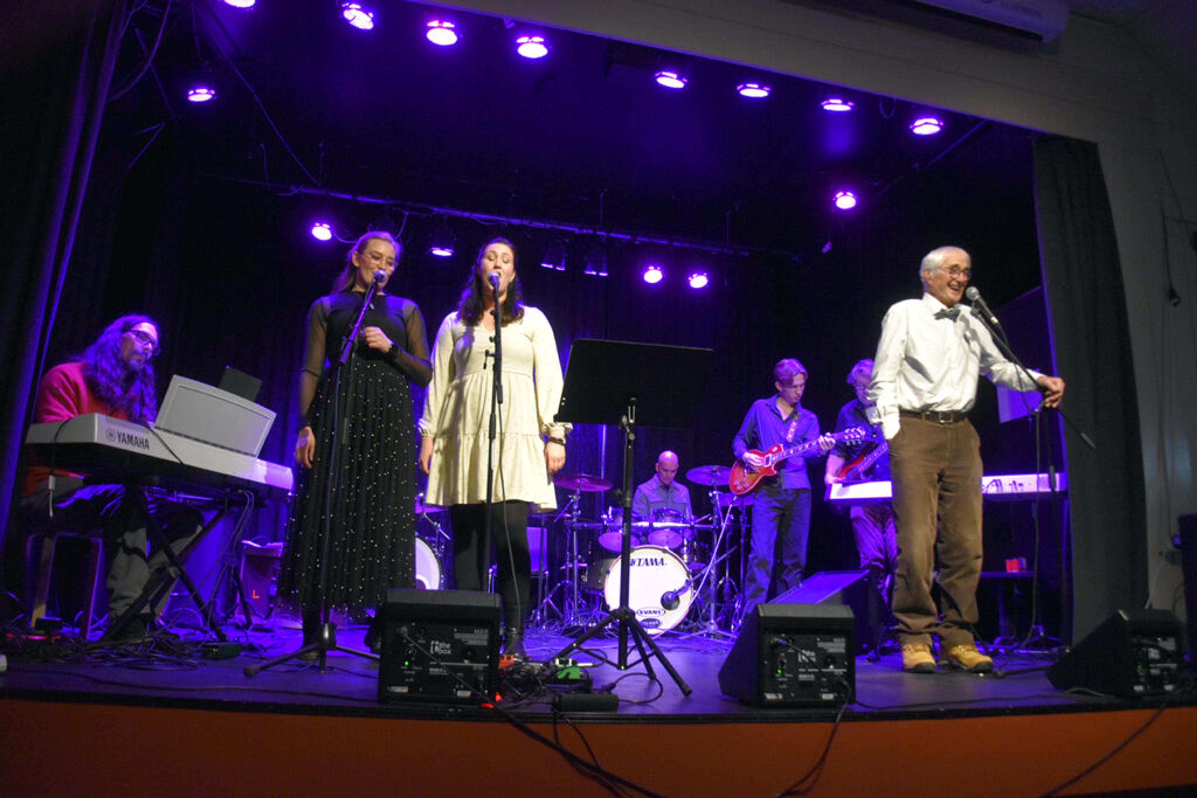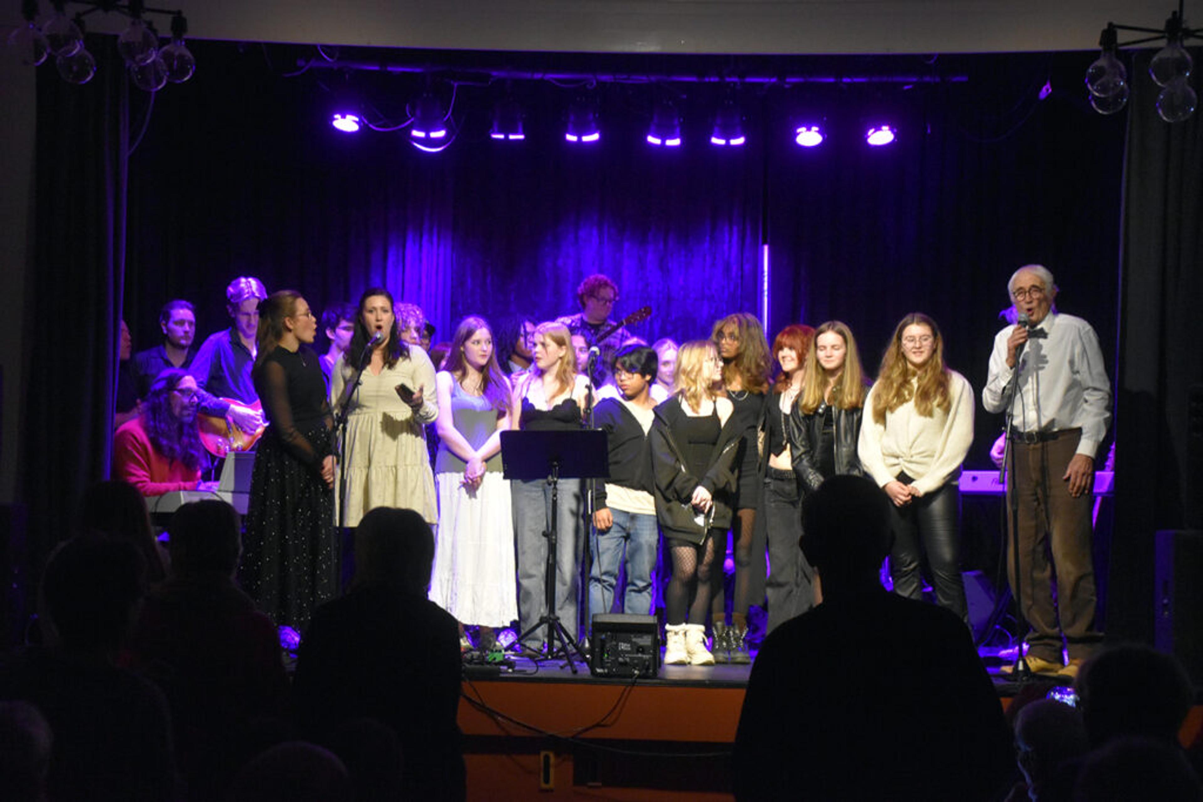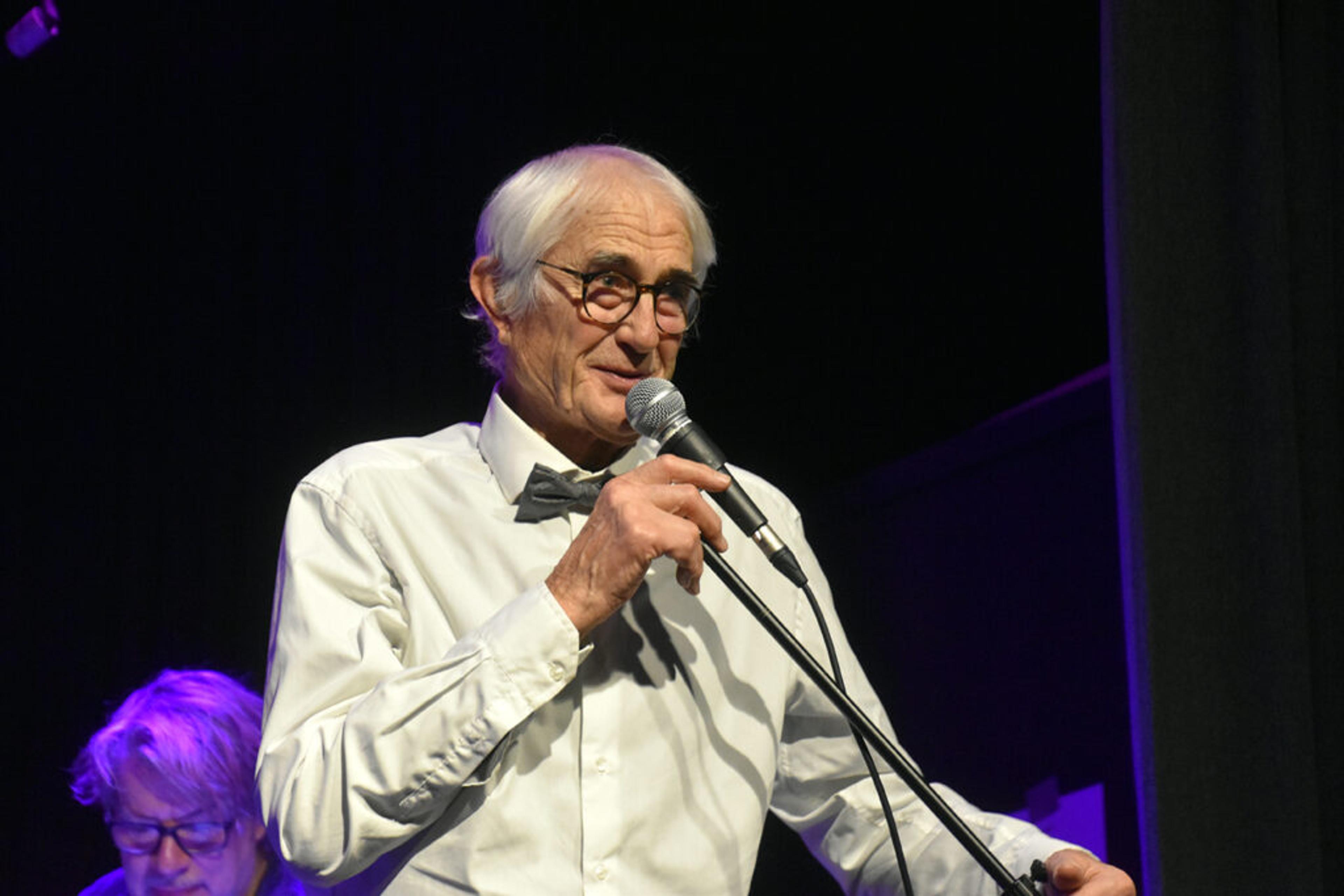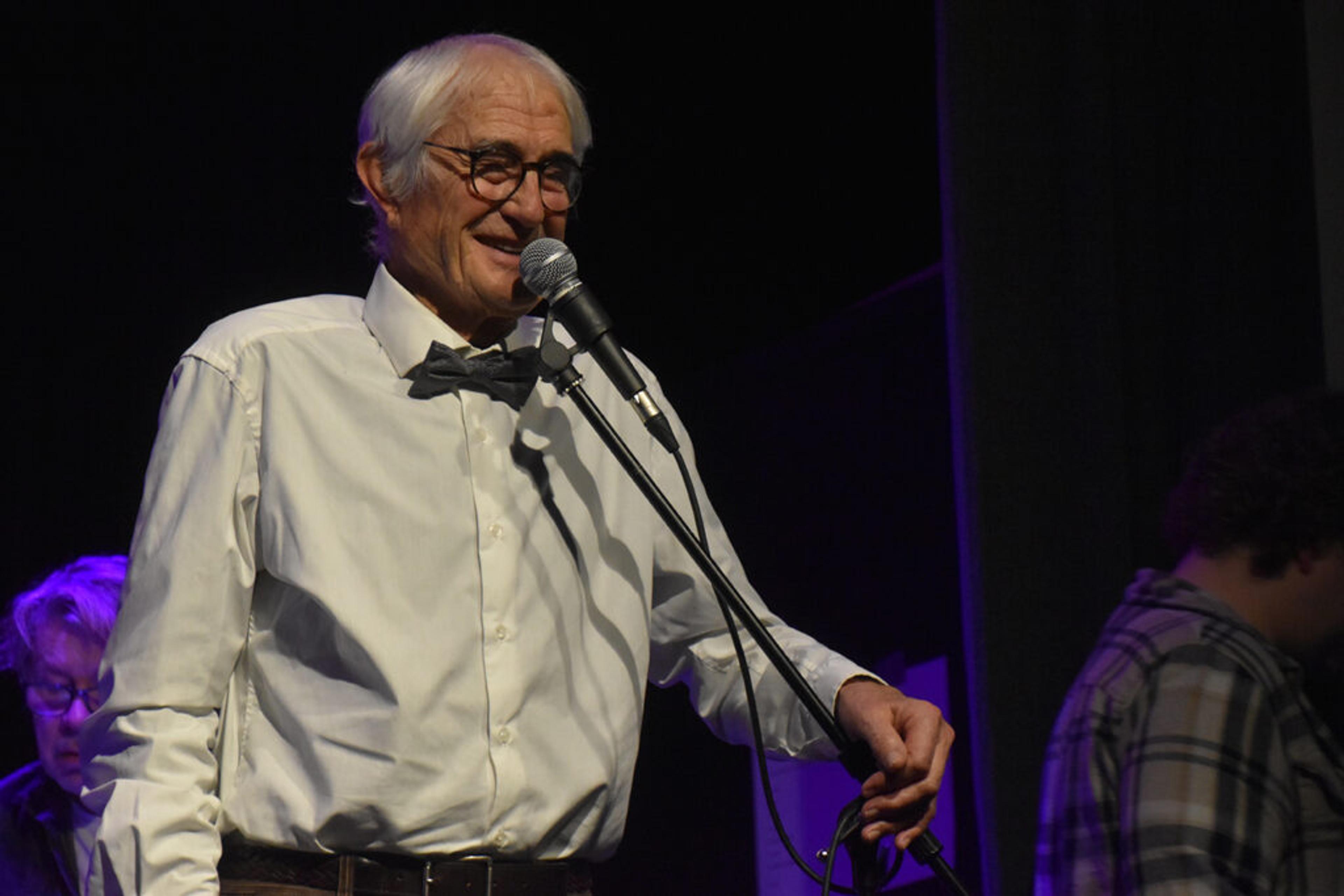 ALLSANG: Kulturildsjel Knut Høydal leder an i allsangen som hyller Kulturhuset Elverhøy. Foto: Stian Ormestad, ReAvisa.