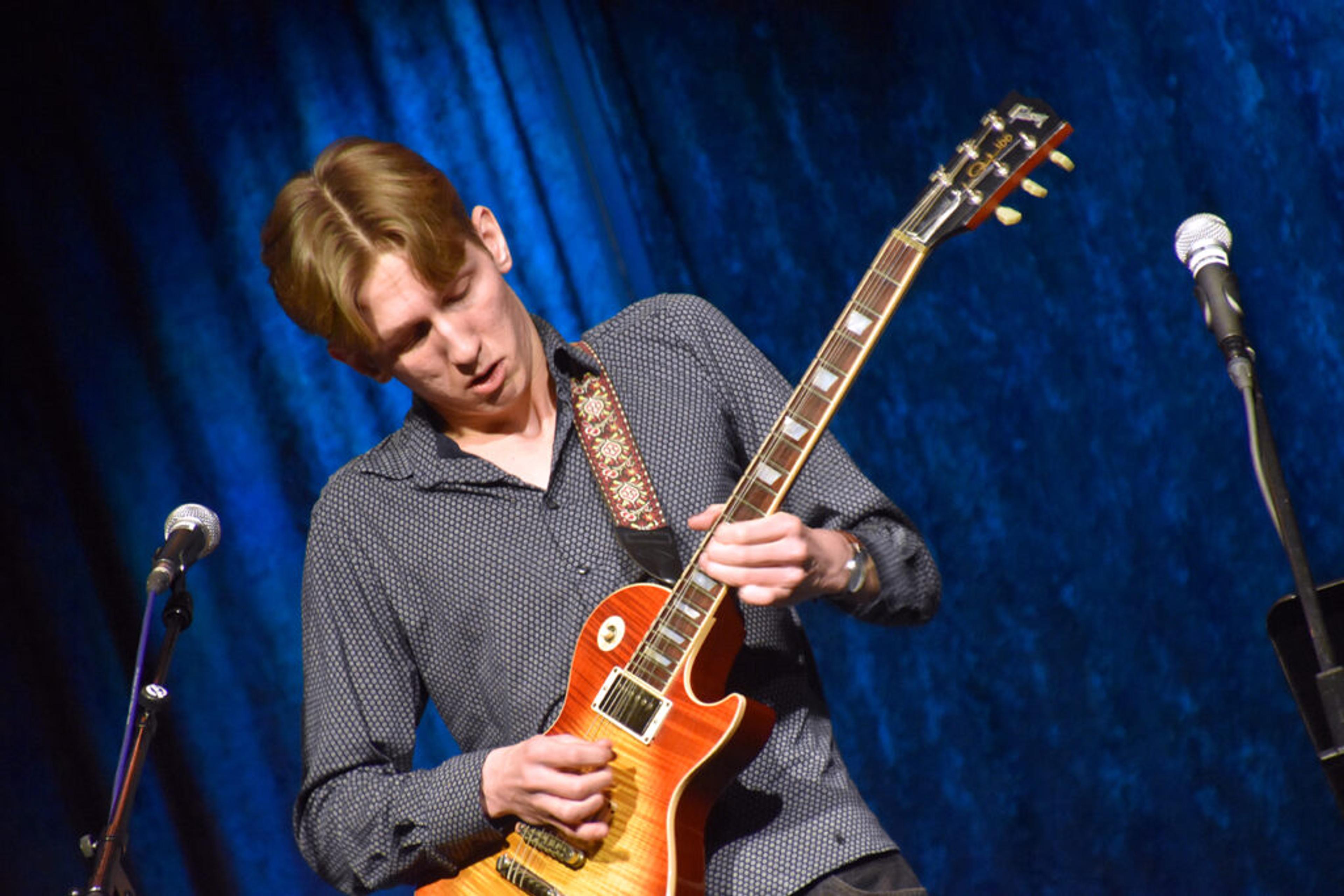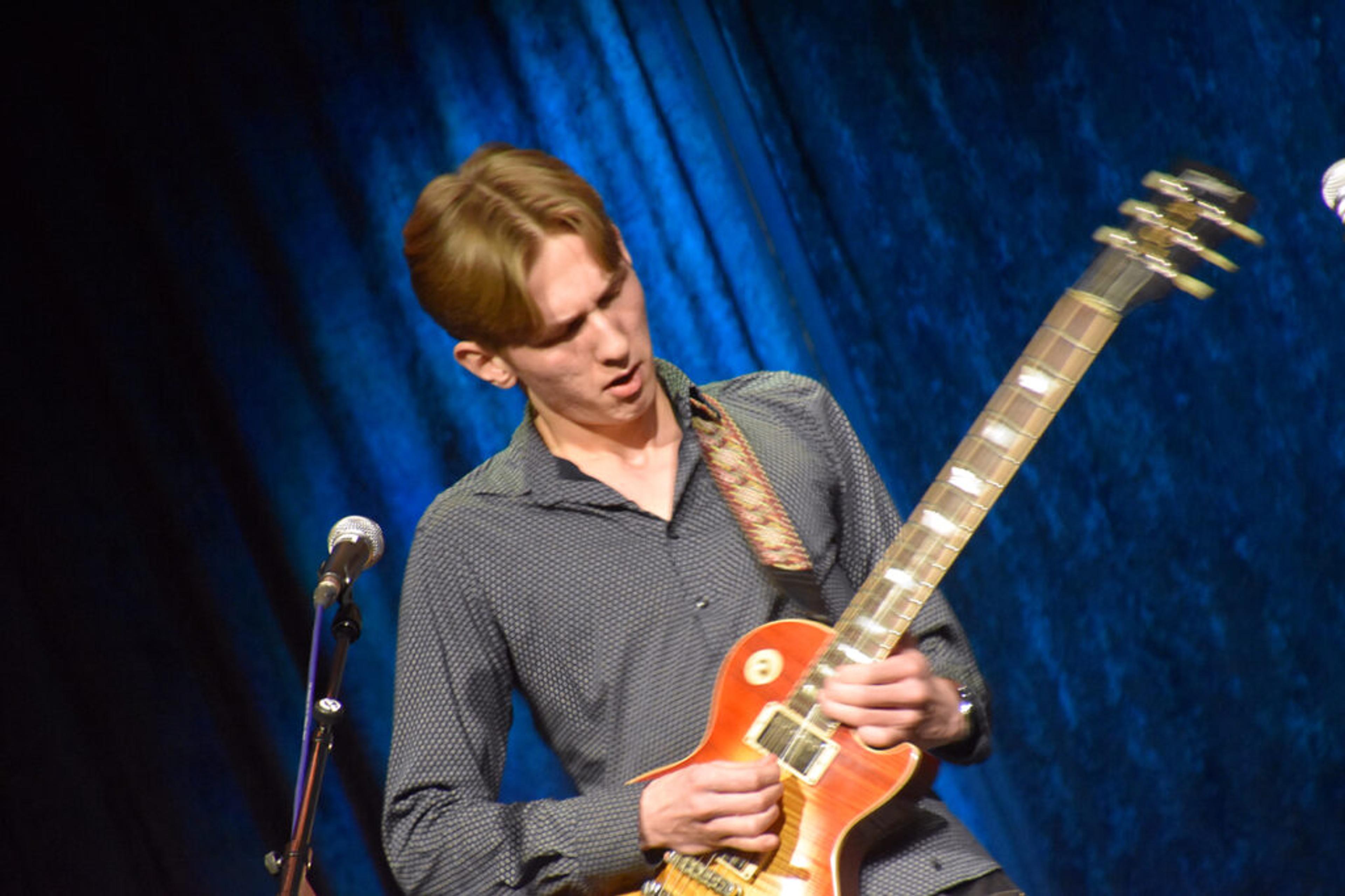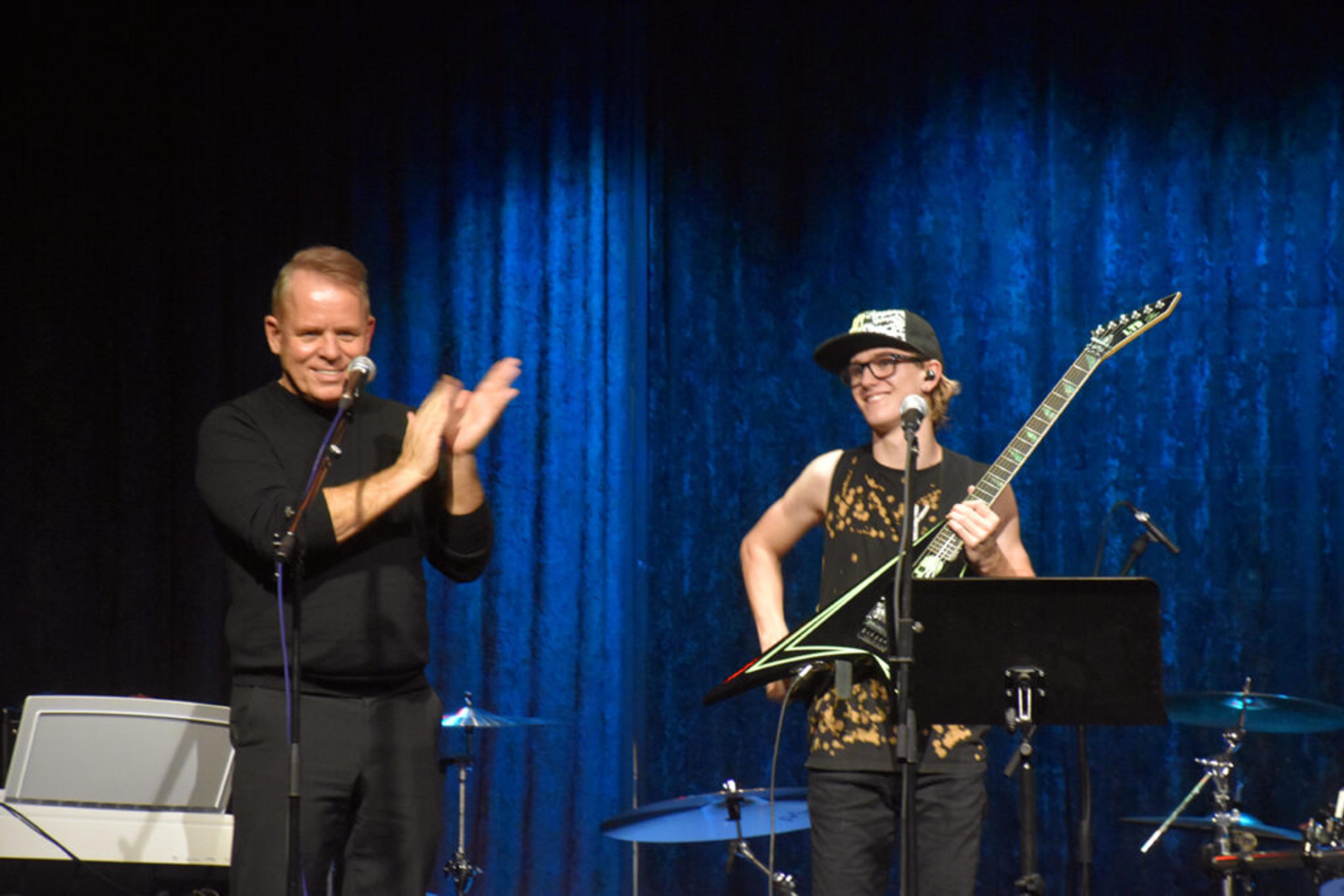 KONFERANSIER: Gitarlærer og konferansier Frank Wedde forteller at han når ikke Mikkel Bergli opp til kneet engang – eleven har for lengst passert lærermesteren i gitar-ferdigheter. Foto: Stian Ormestad, ReAvisa.