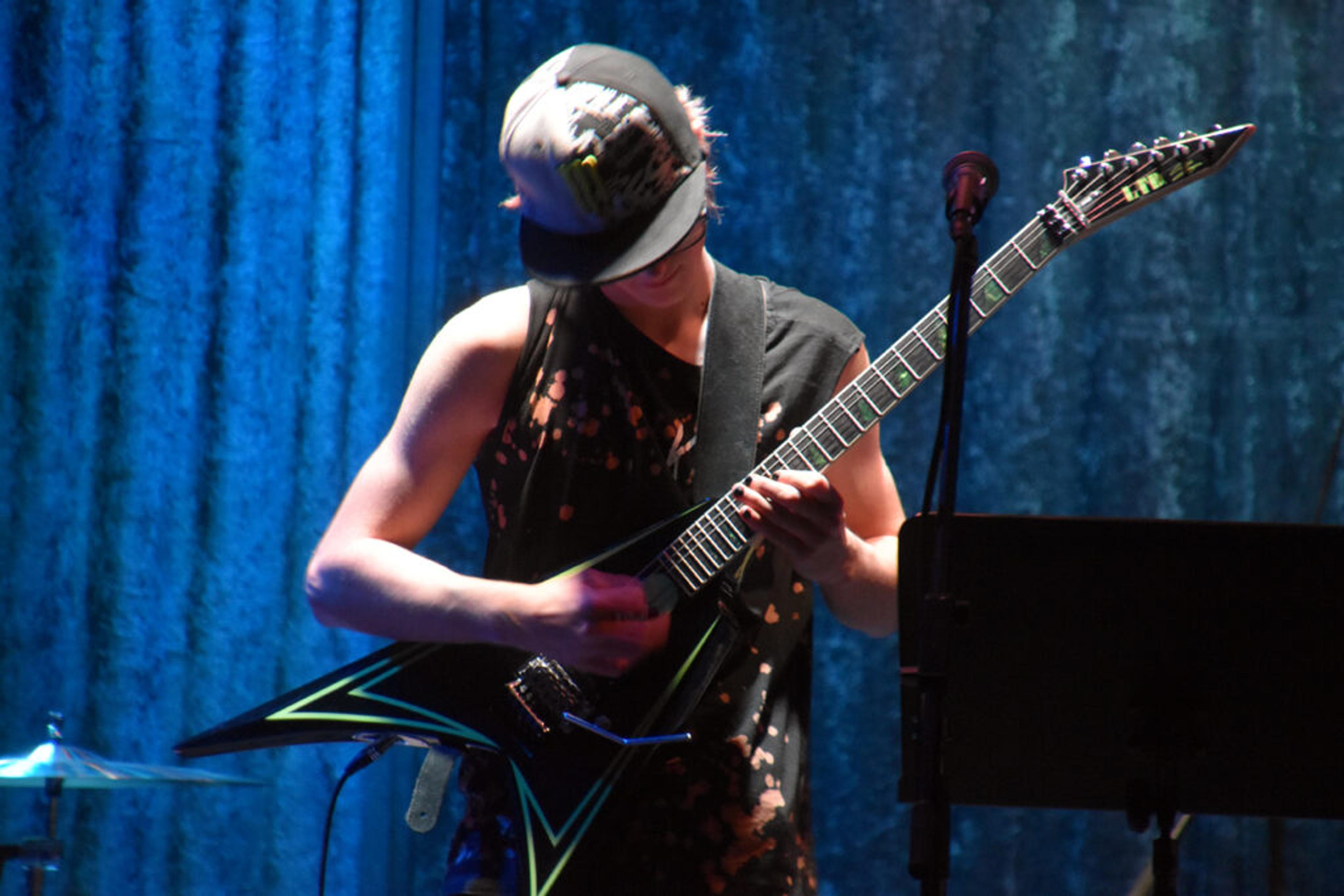 GÅSEHUD: Otto Junior fra Ramnes er en stor artist, allerede. En hel sal satt trollbundet til hans gitar-traktering. Foto: Stian Ormestad, ReAvisa.