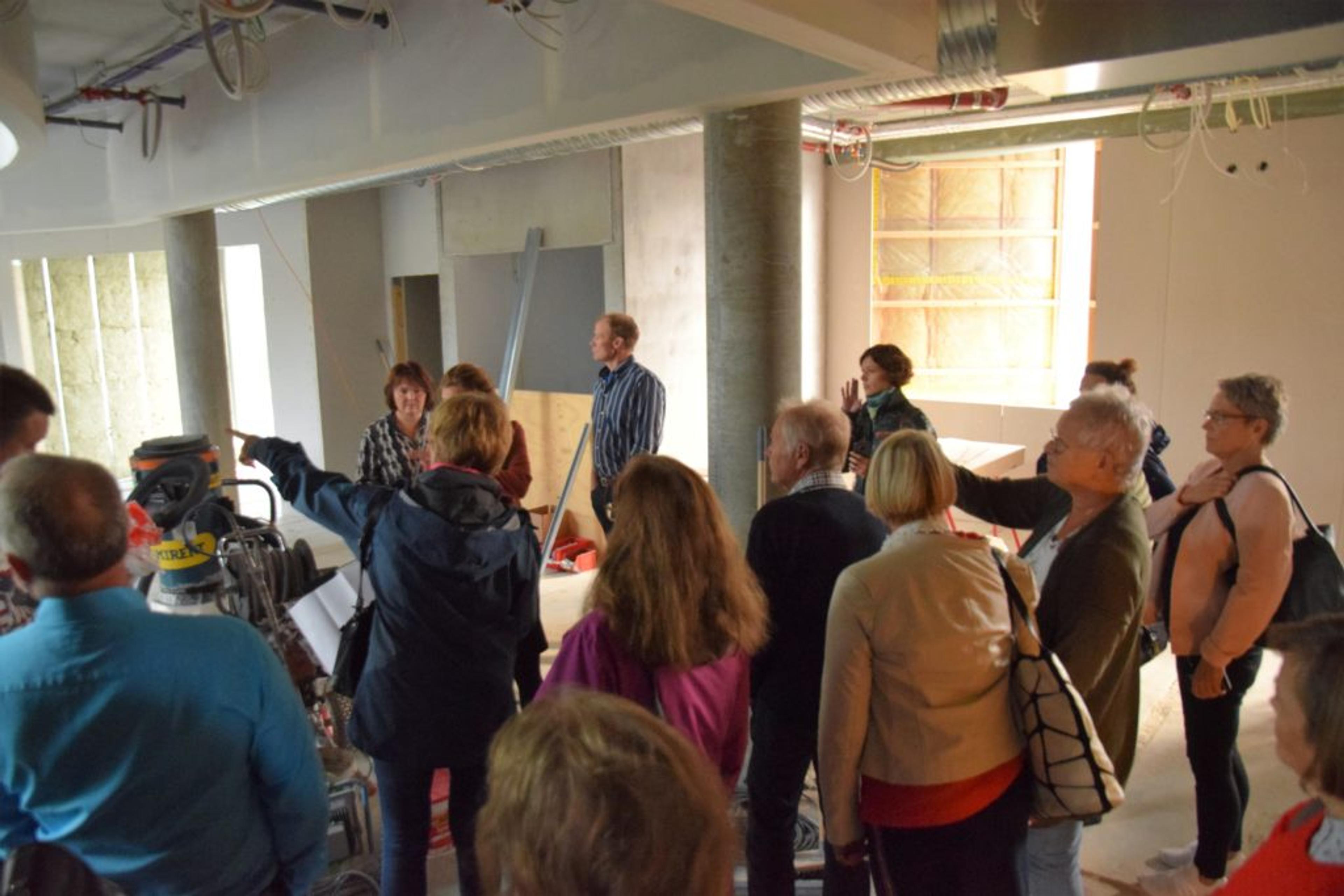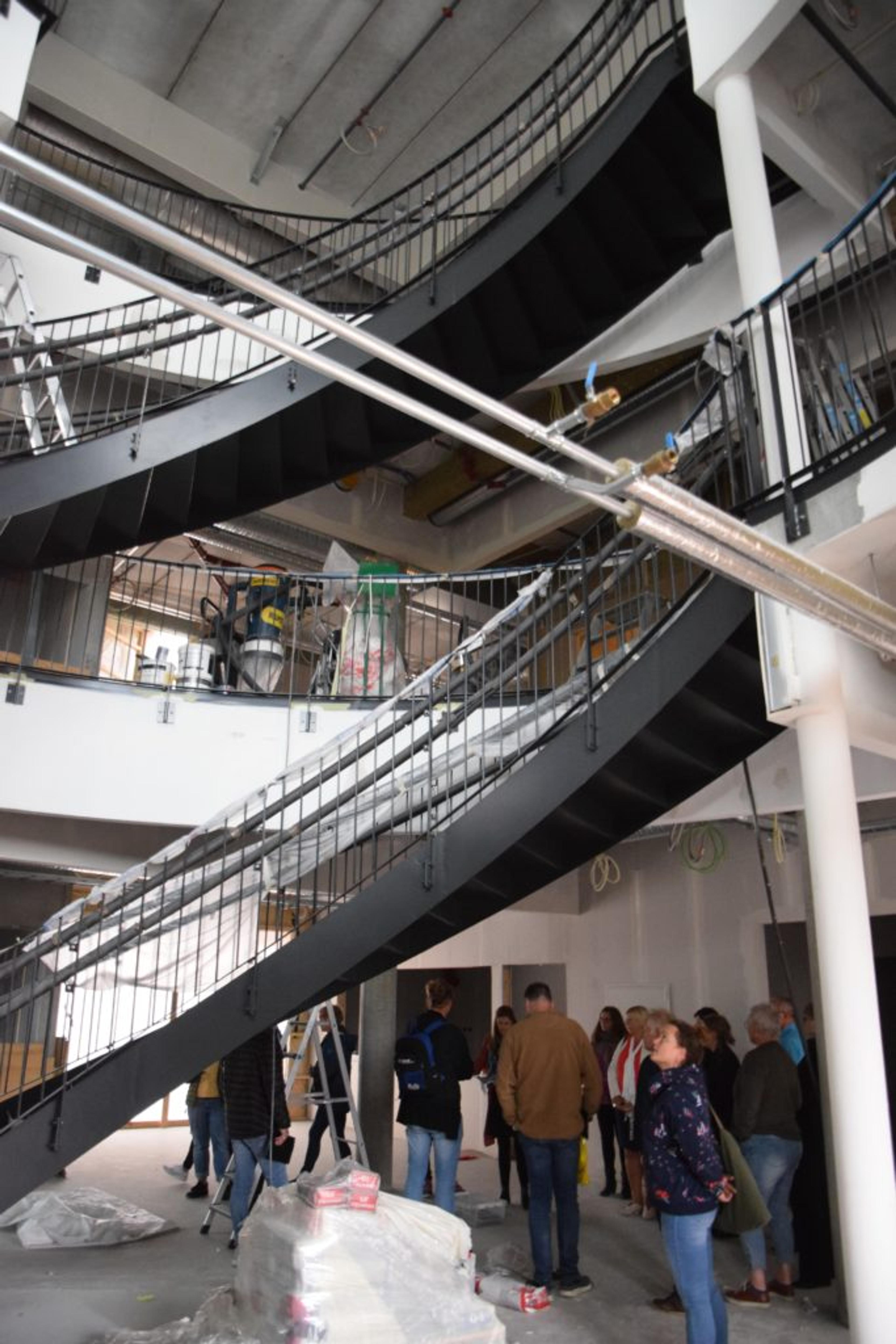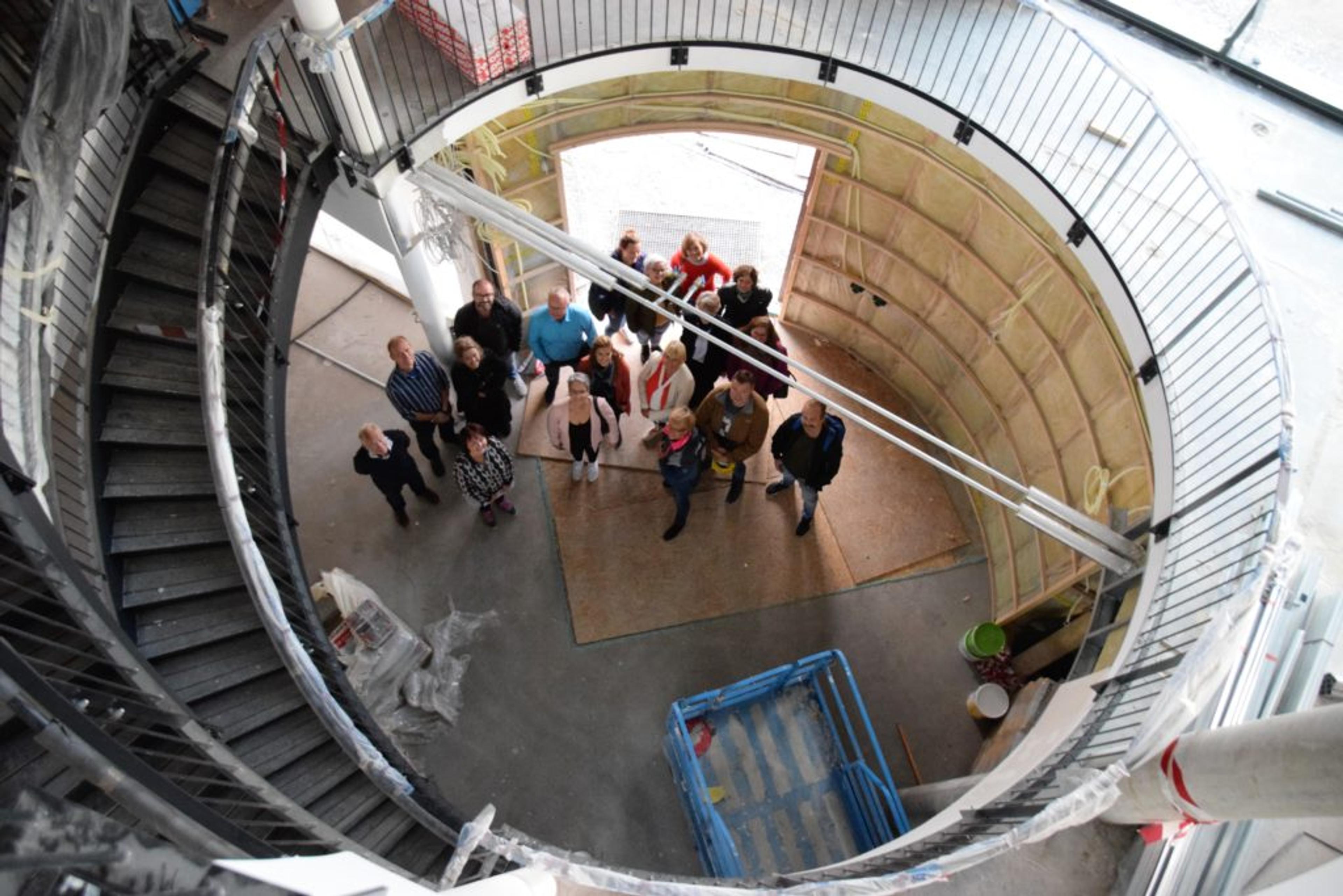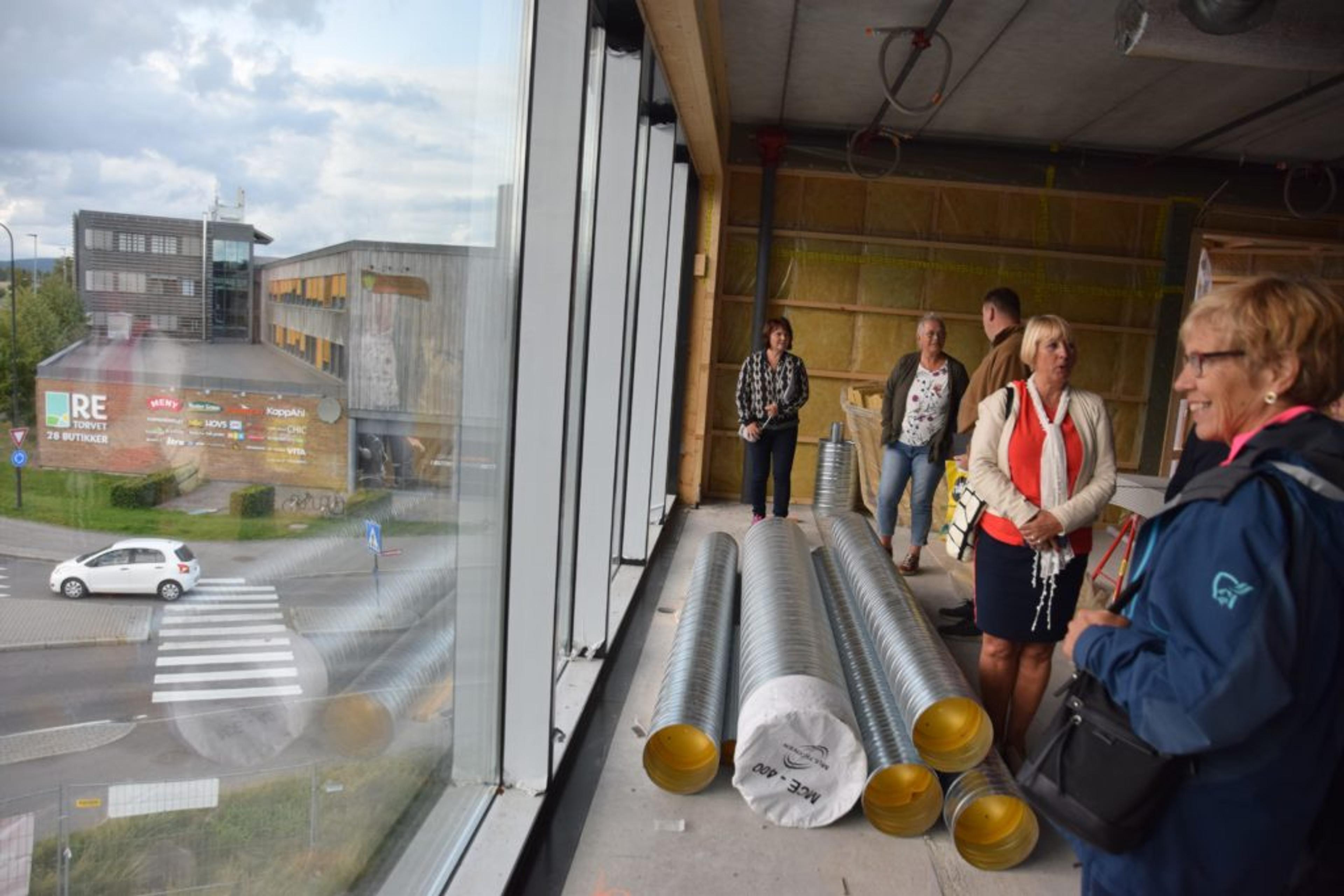 ÅPENT BIBLIOTEK: Det nye Re folkebibliotek blir åpent i flere betydninger av ordet. Lånekortet virker som nøkkelkort, så folk kan møtes her fra morgen til kveld – også utenom vanlige åpningstider. Det blir også åpent i mellom etasjene, uten strengt avskilte avdelinger og avlukker. Her ser vi folkevalgte og administrasjon på befaring i kveld, siste onsdag i august 2018. Foto: Stian Ormestad.