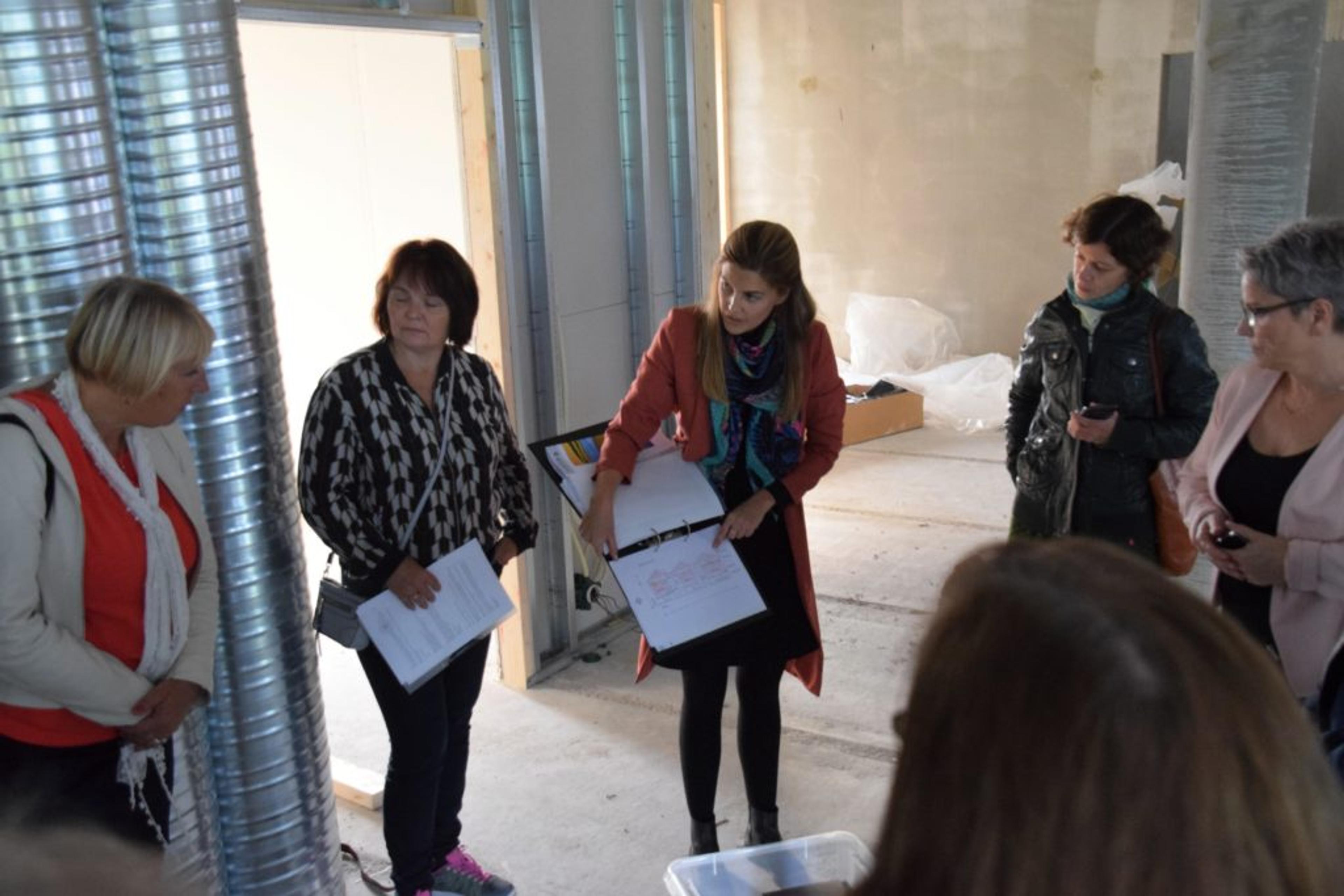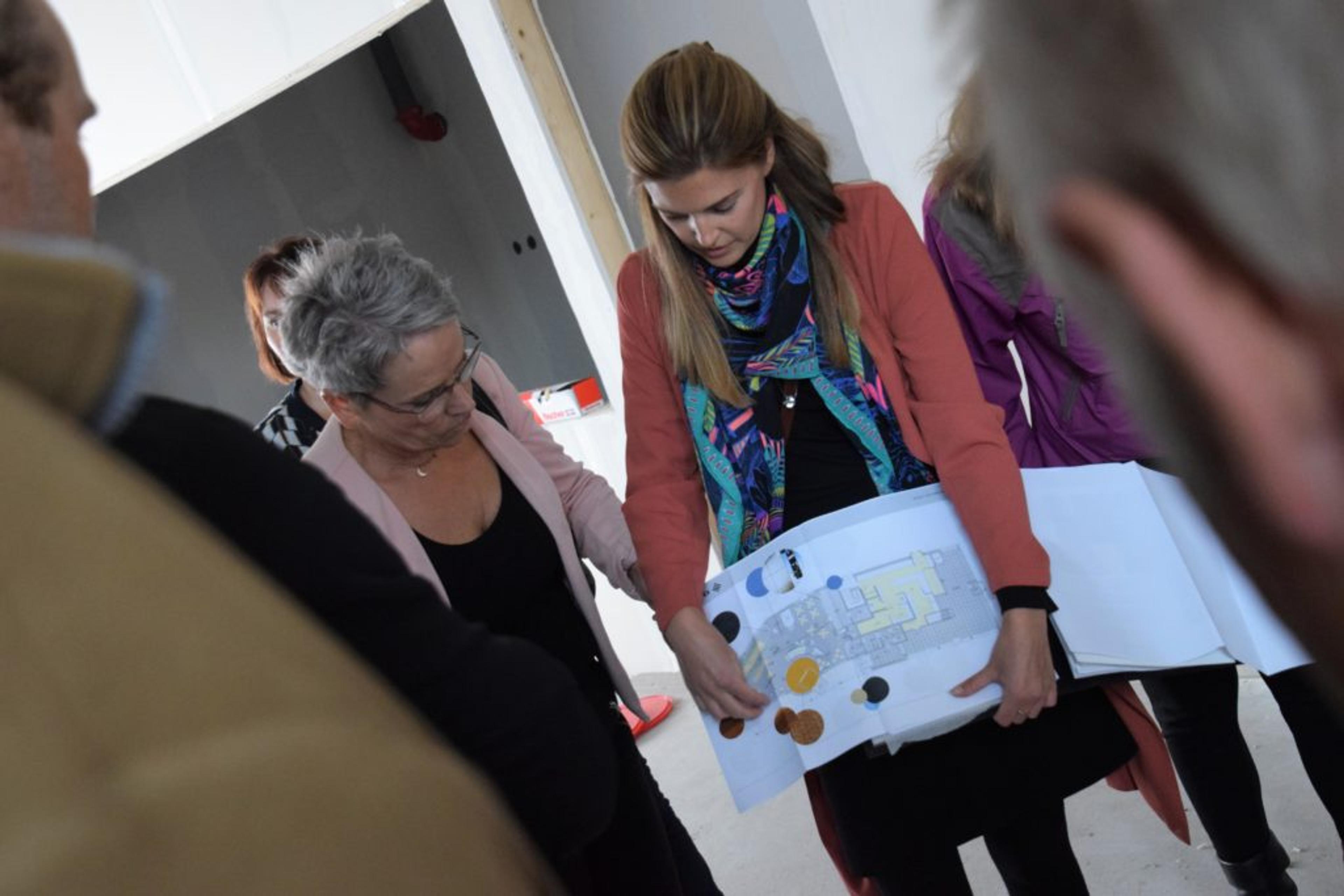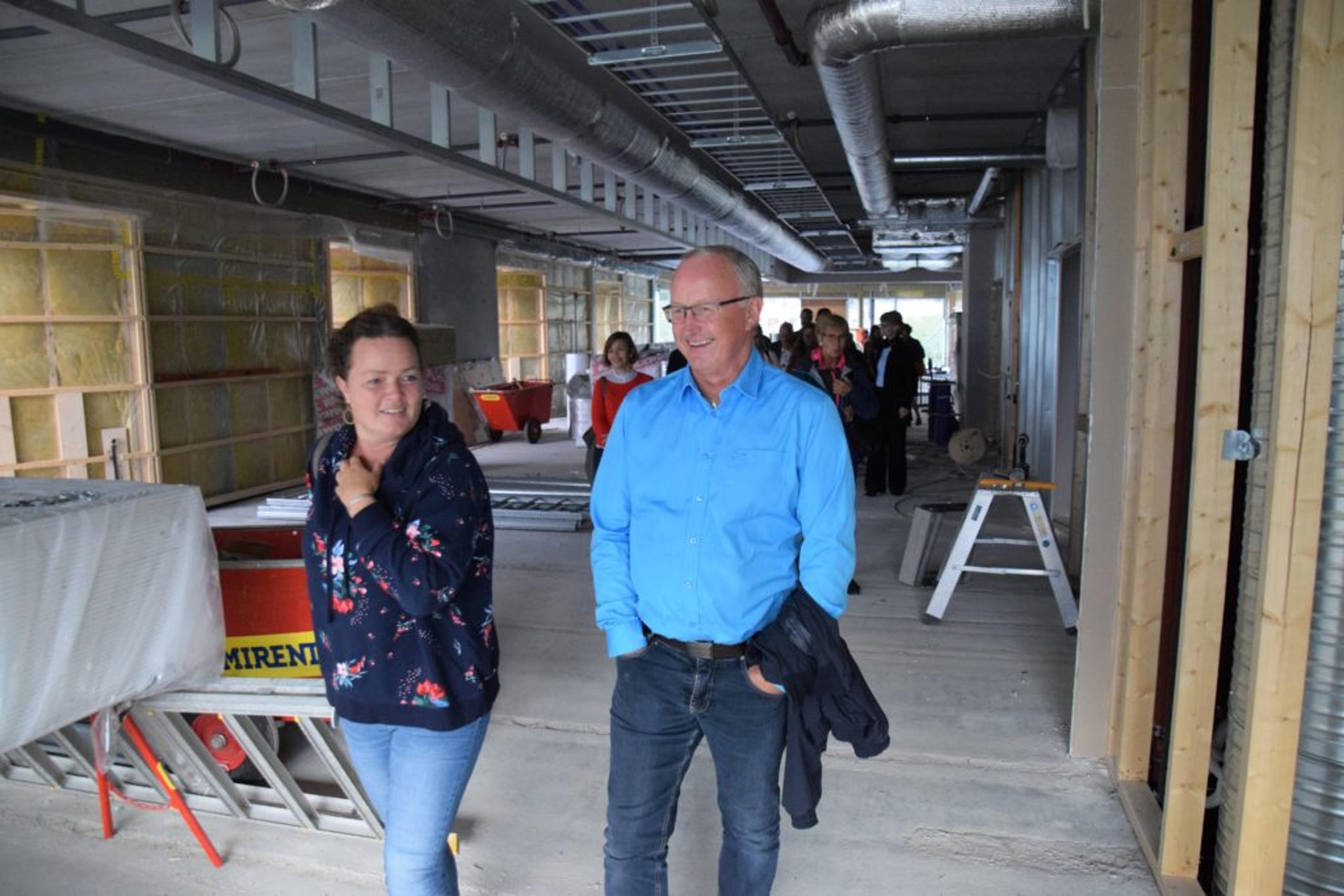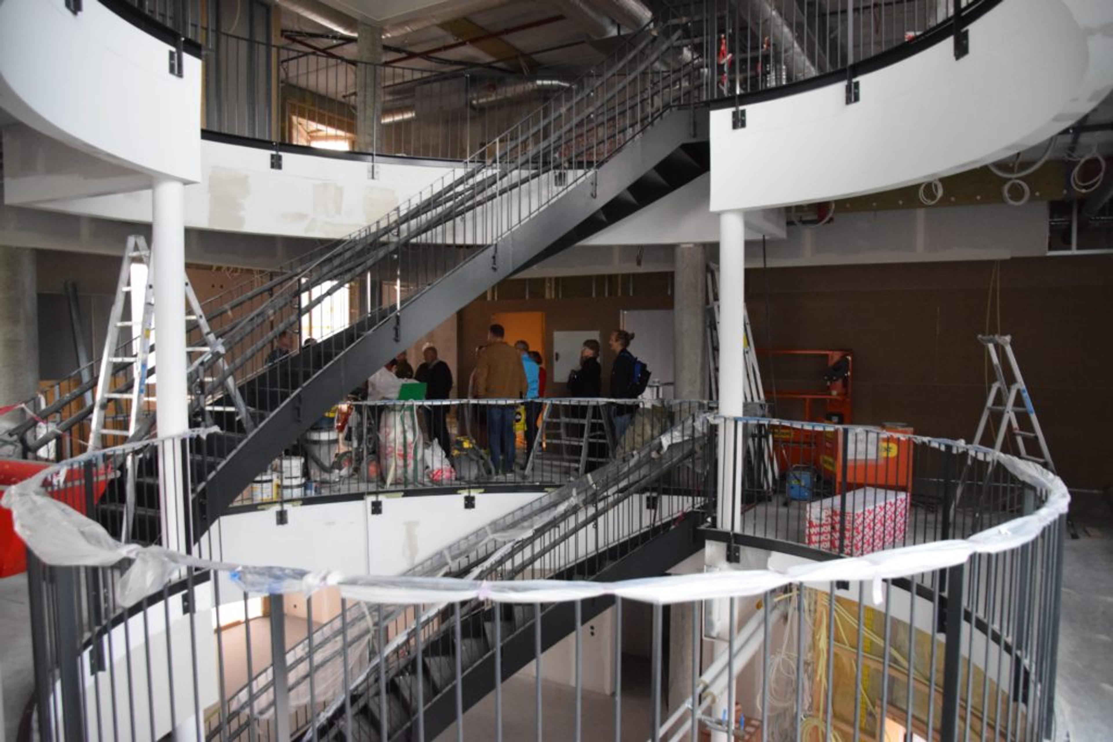 ÅPENT BIBLIOTEK: Det nye Re folkebibliotek blir åpent i flere betydninger av ordet. Lånekortet virker som nøkkelkort, så folk kan møtes her fra morgen til kveld – også utenom vanlige åpningstider. Det blir også åpent i mellom etasjene, uten strengt avskilte avdelinger og avlukker. Her ser vi folkevalgte og administrasjon på befaring i kveld, siste onsdag i august 2018. Foto: Stian Ormestad.