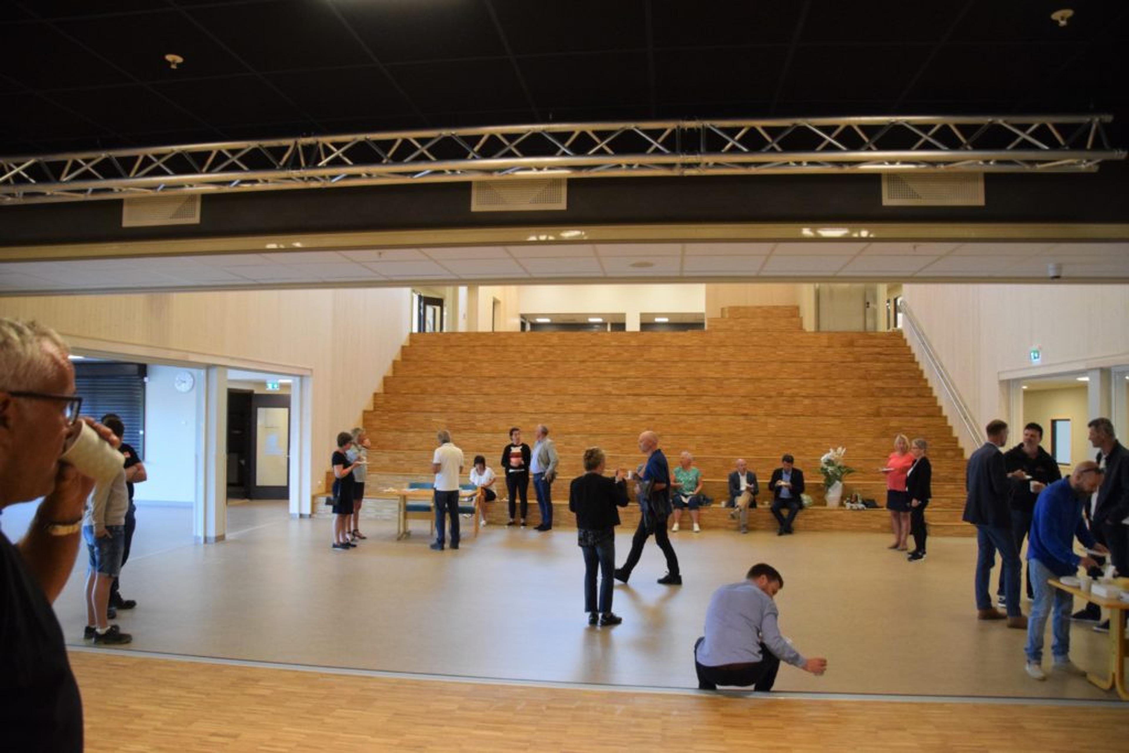 Skolens hjerte er amfiet – midt i bygget. Bak amfiet er det scene og musikkrom, med en skillevegg som kan skyves til side. Tidligere måtte skolen samles i gymsalen.