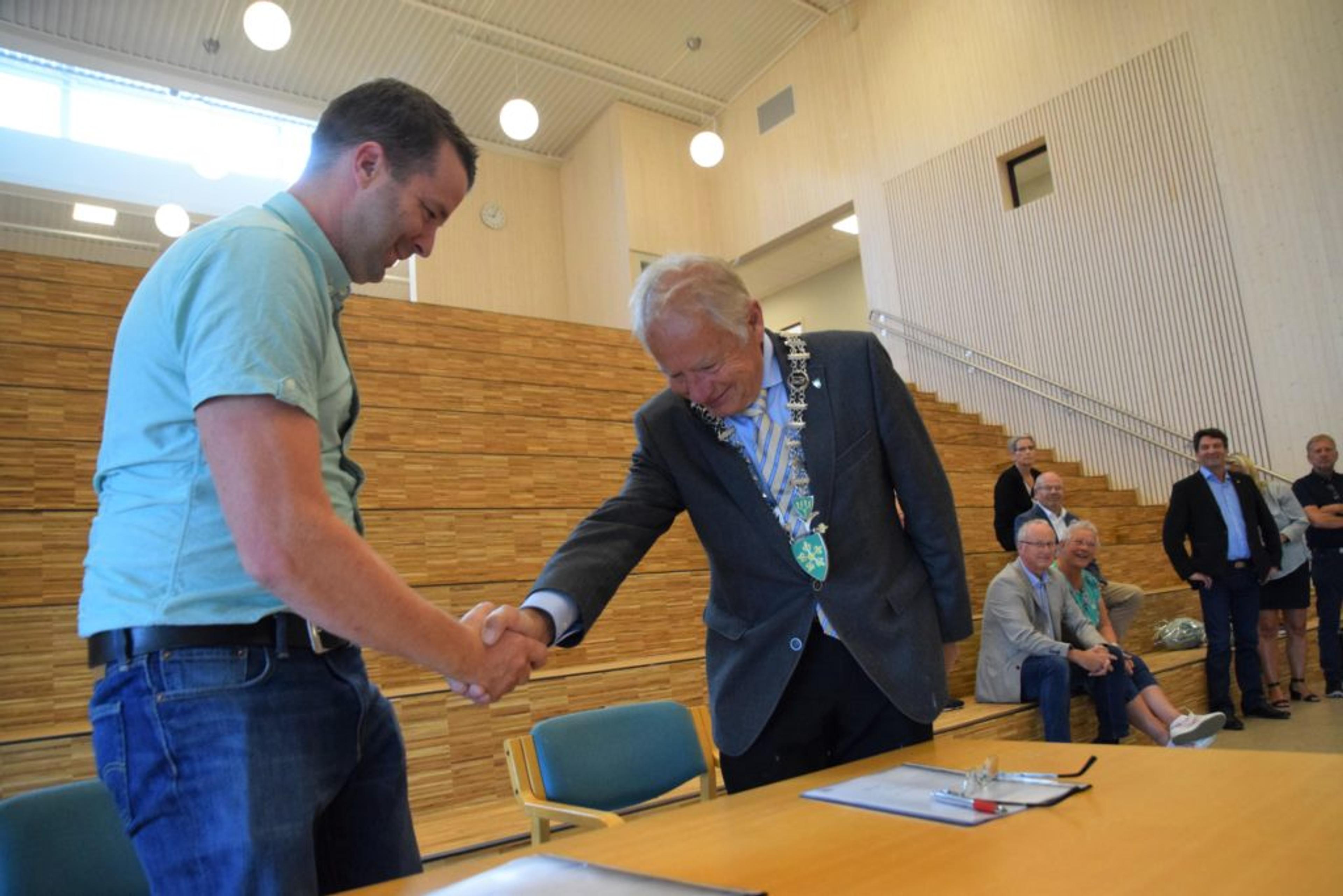 HANDTRYKK: Re-ordfører Thorvald Hillestad har allerede skrivi under på papirene sammen med Jostein Ekeberg, prosjektleder i Veidekke AS. Men her på bygda er ikke en avtale spikra før et skikkelig handtrykk. Foto: Stian Ormestad.